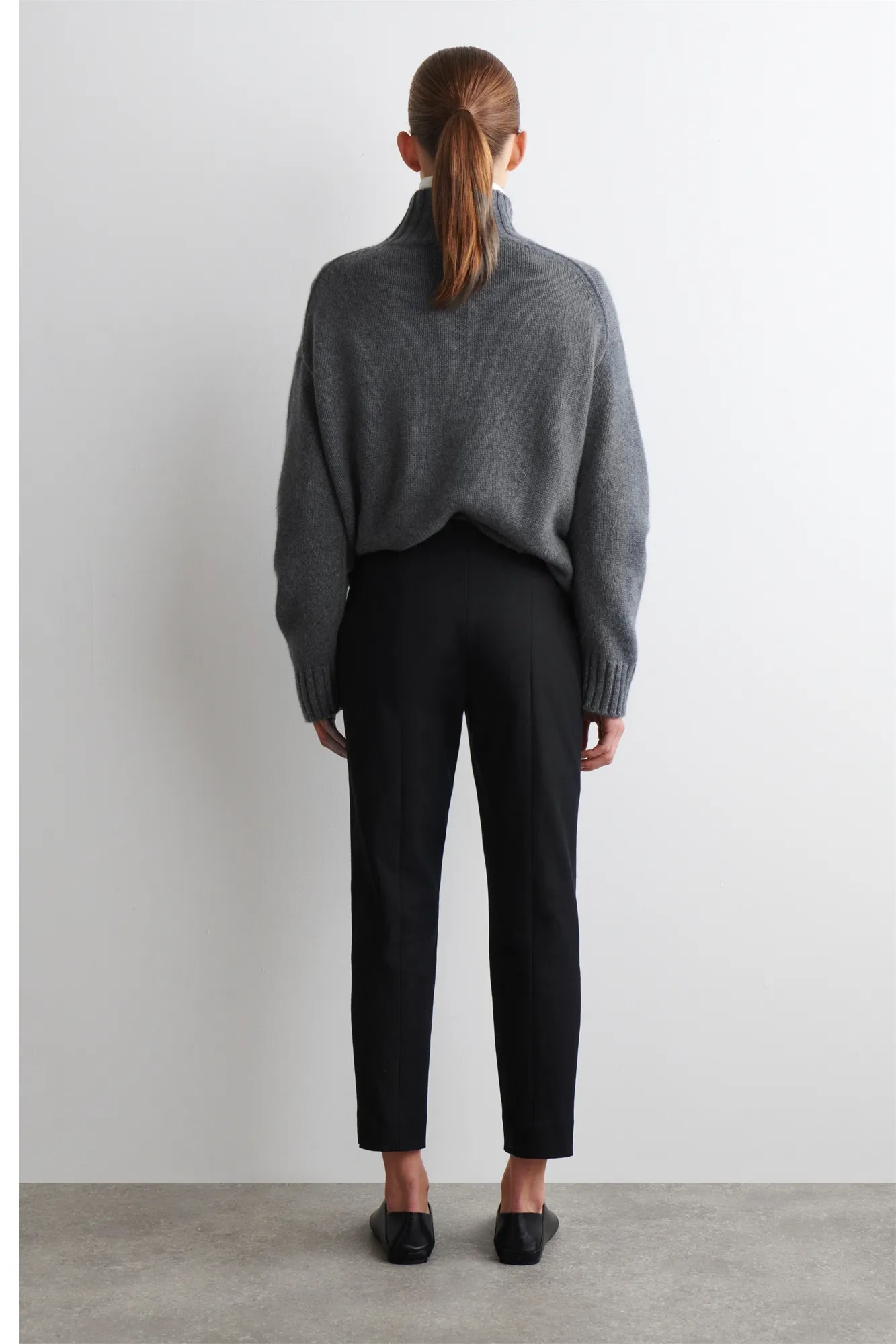 Эти брюки-капри длиной до щиколотки, выполненные из эластичного хлопка, имеют потайной эластичный пояс, серебристую молнию и заутюженные складки по передней части узких штанин.