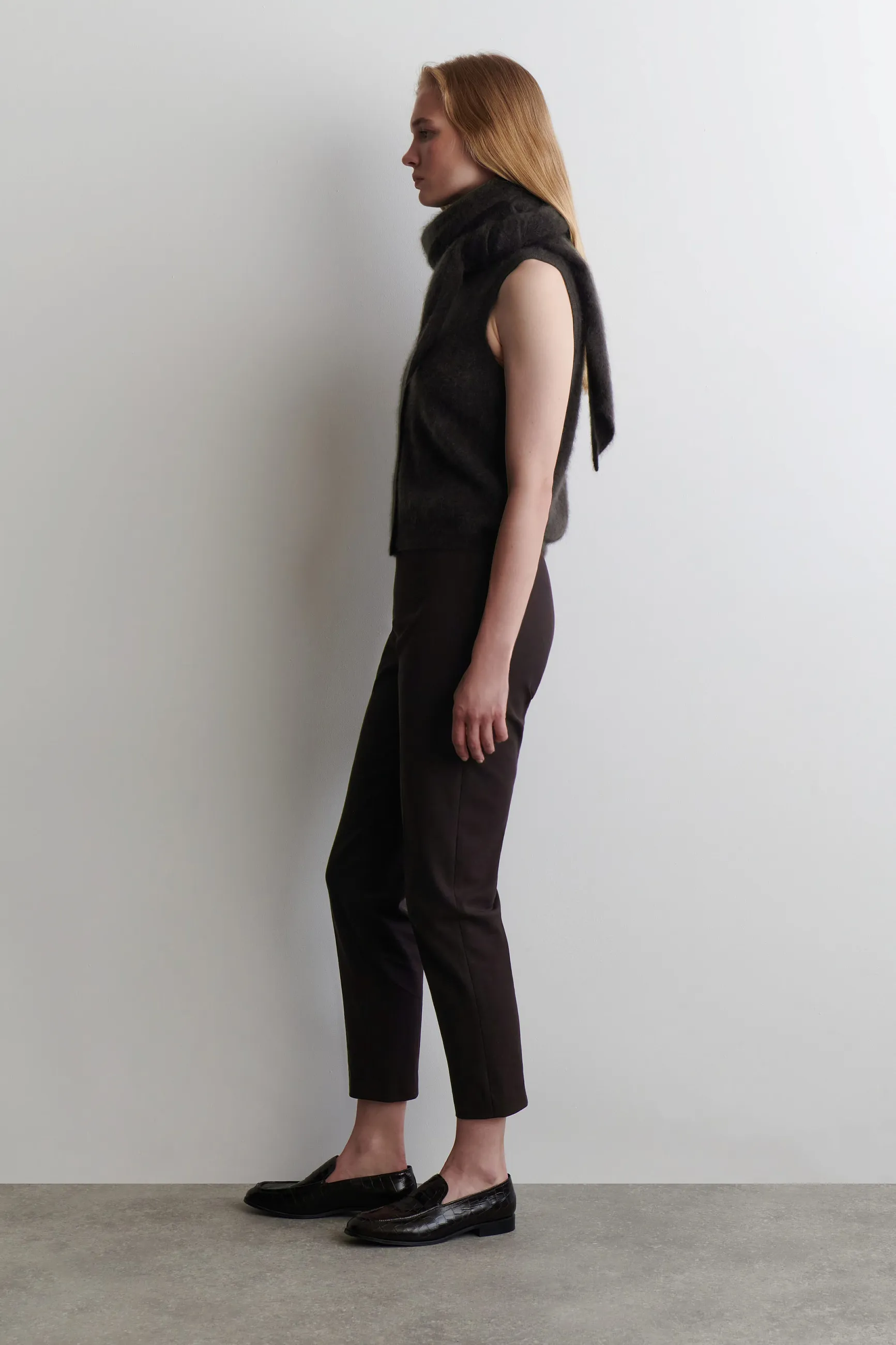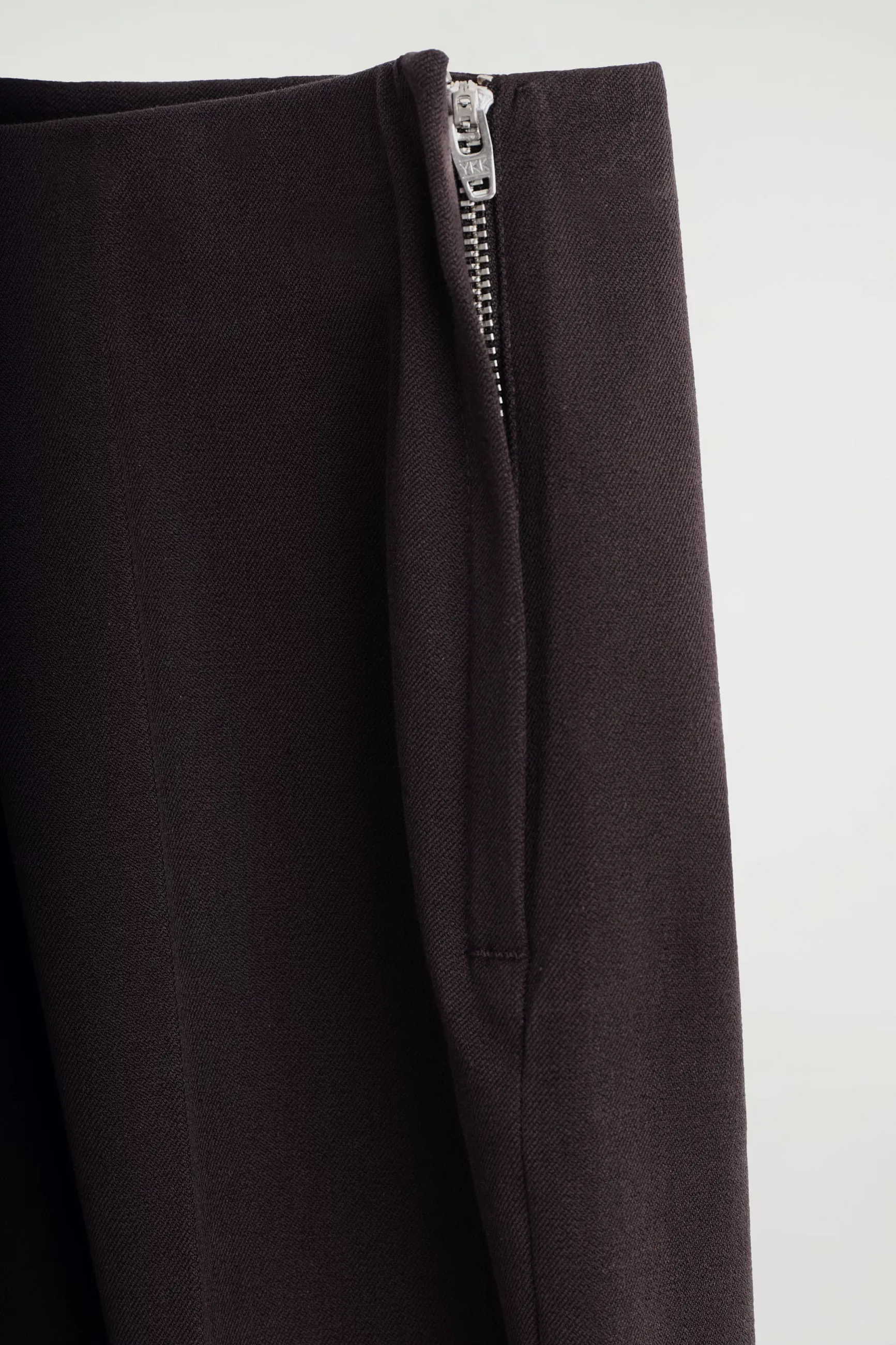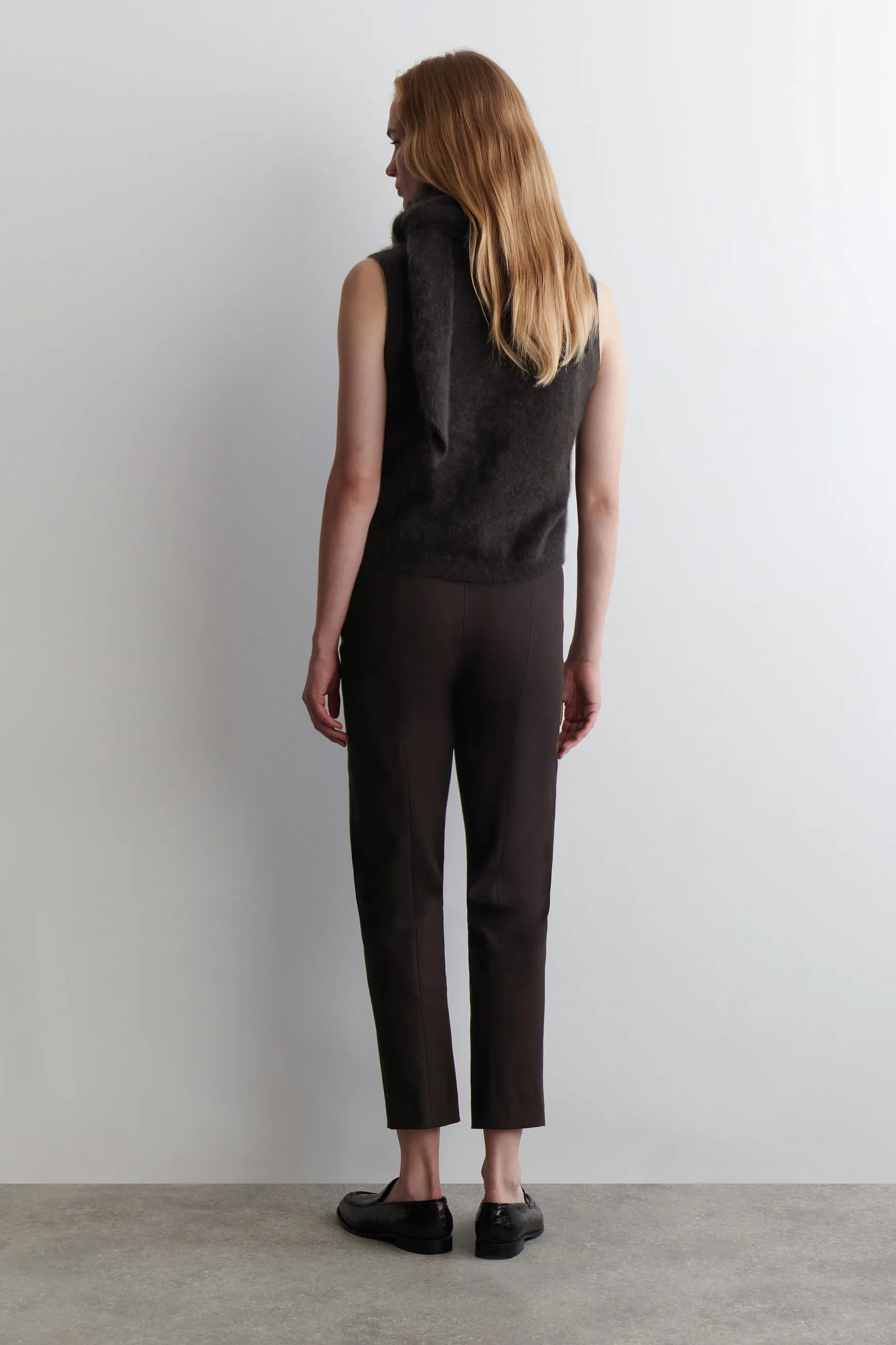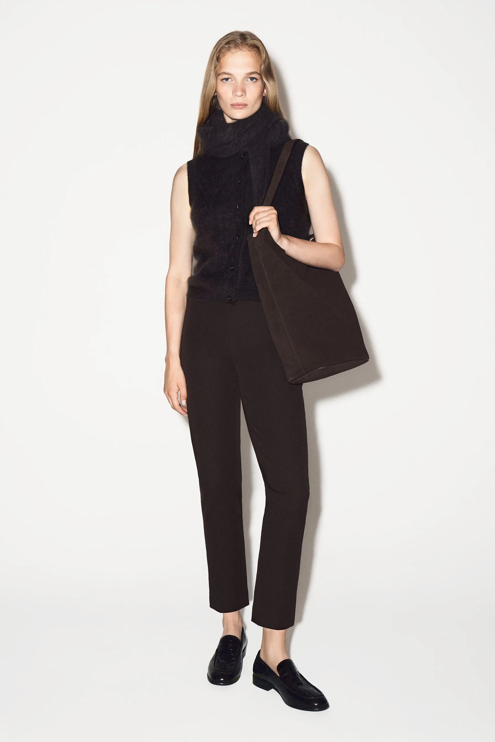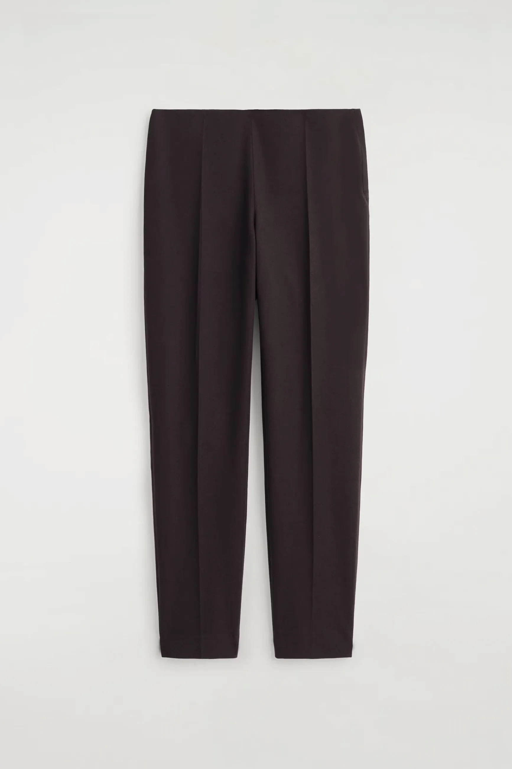 Представляем капсульный гардероб: сезонную эволюцию классических моделей COS. Эти укороченные брюки из эластичного хлопка имеют потайной эластичный пояс, серебристую молнию и заутюженные складки спереди по узким брючинам.