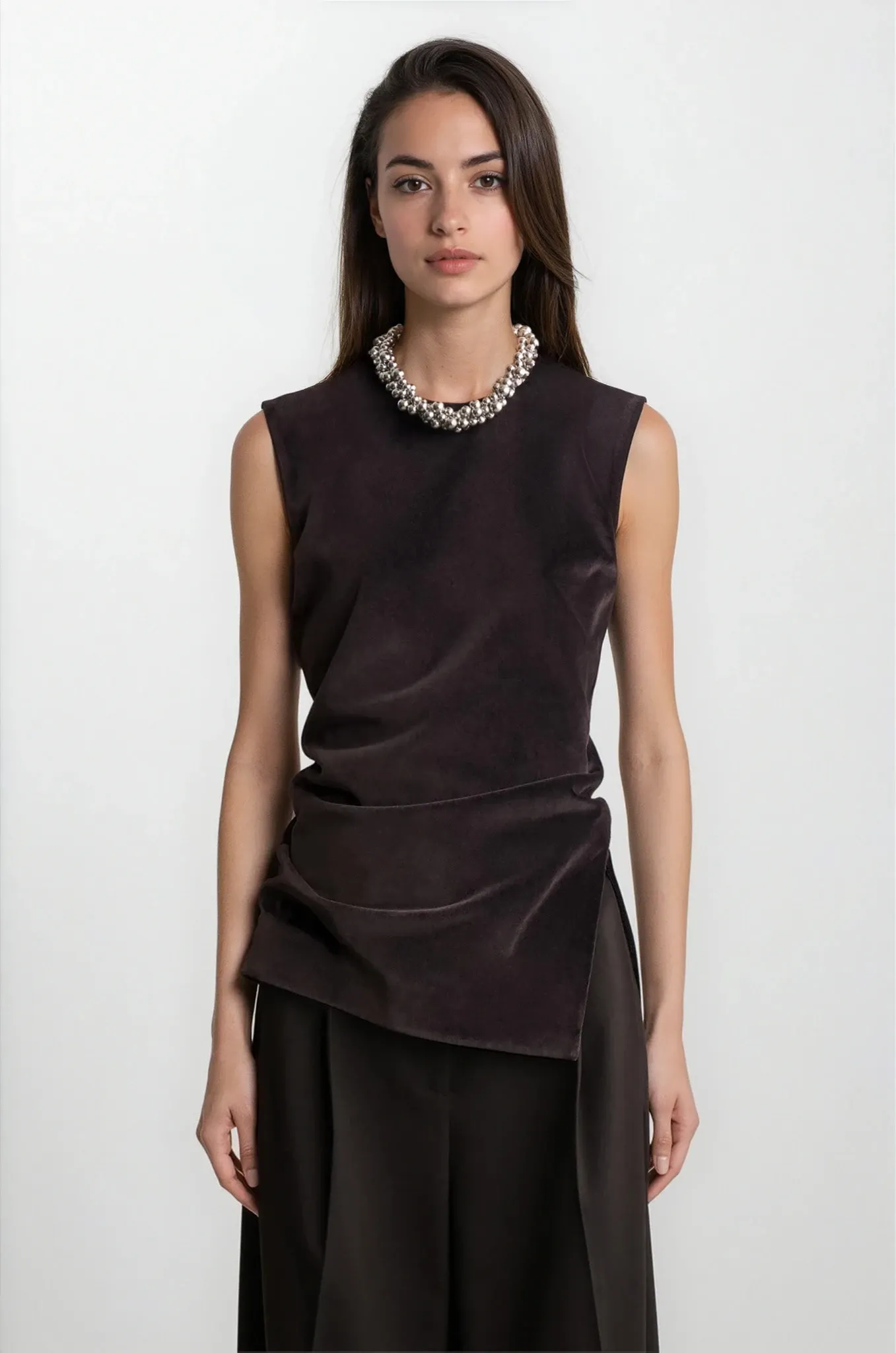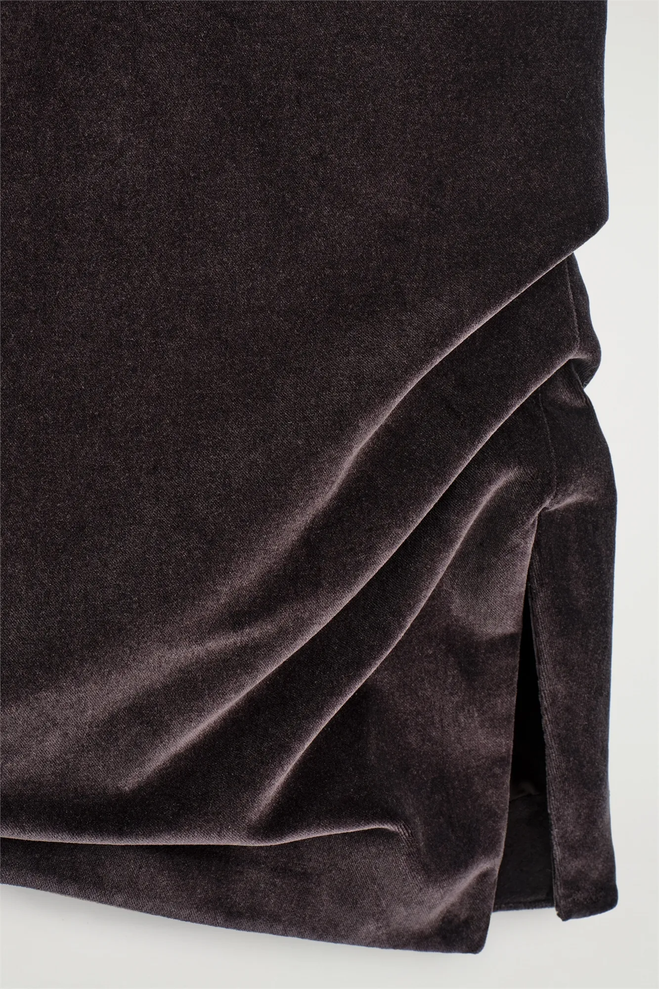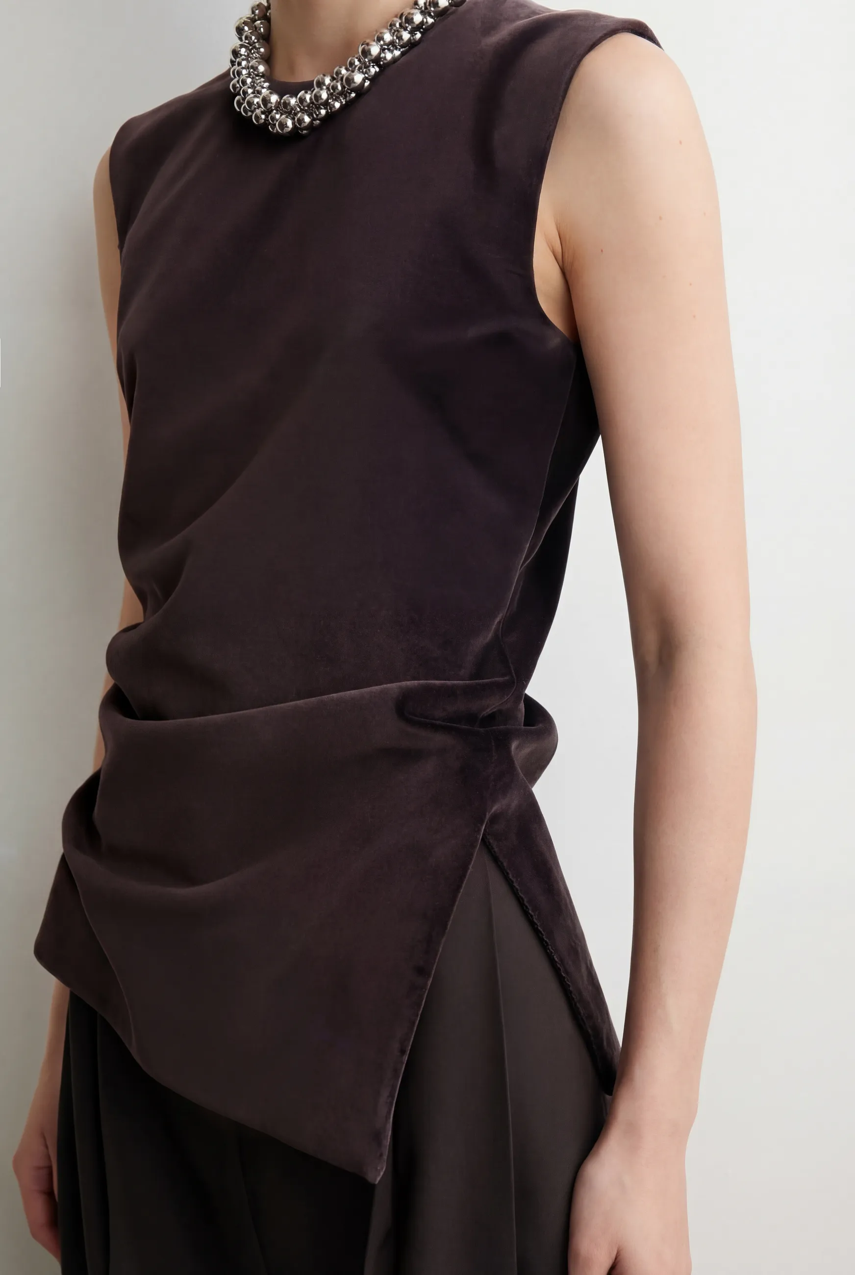 Этот современный топ, выполненный в оттенке эспрессо-коричневого цвета, выполнен из роскошного бархата с приятным на ощупь эффектом и имеет облегающий асимметричный крой со сборками на талии. Он станет центральным элементом любого образа, с которым вы его дополните.