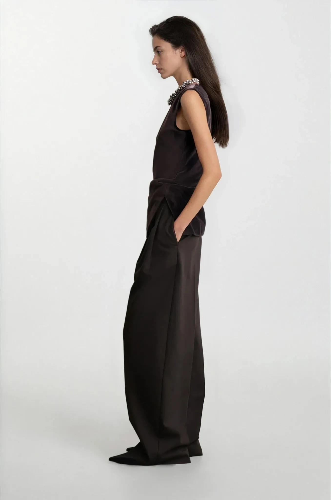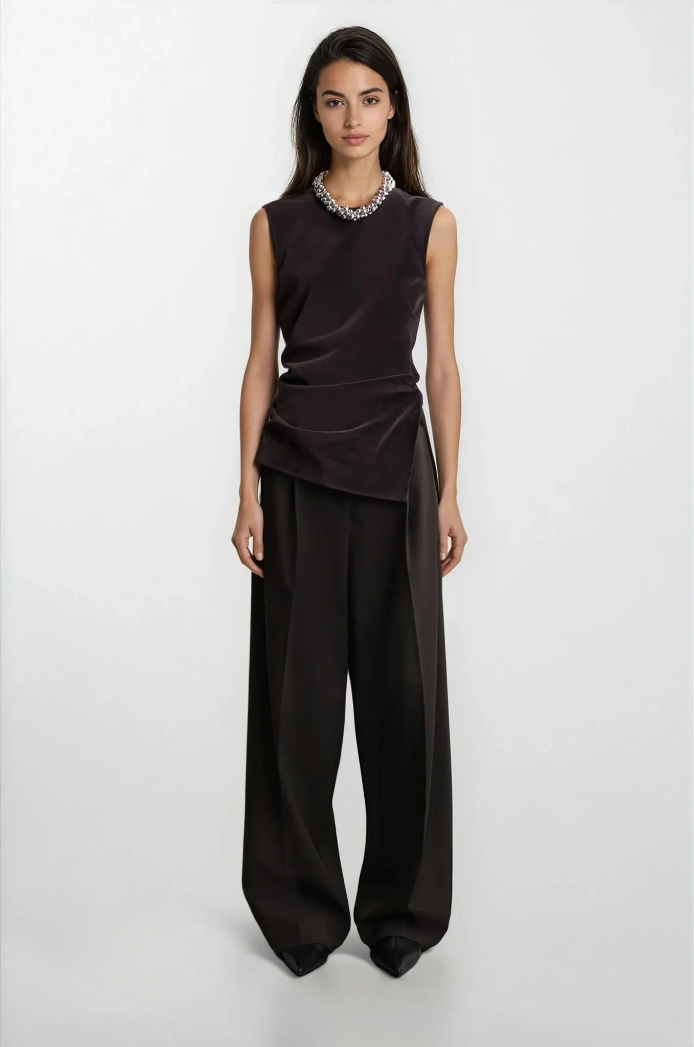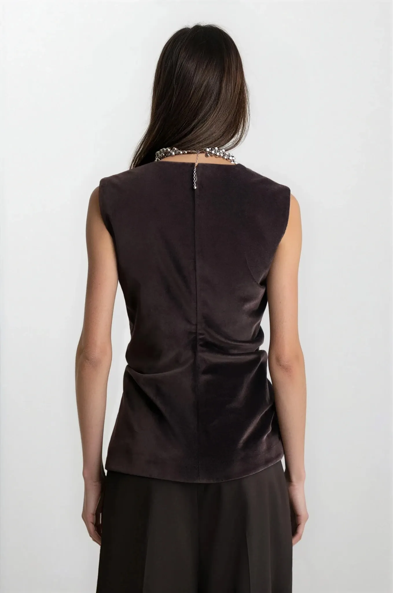 Этот современный топ, выполненный в оттенке эспрессо-коричневого цвета, выполнен из роскошного бархата с приятным на ощупь эффектом и имеет облегающий асимметричный крой со сборками на талии. Он станет центральным элементом любого образа, с которым вы его дополните.