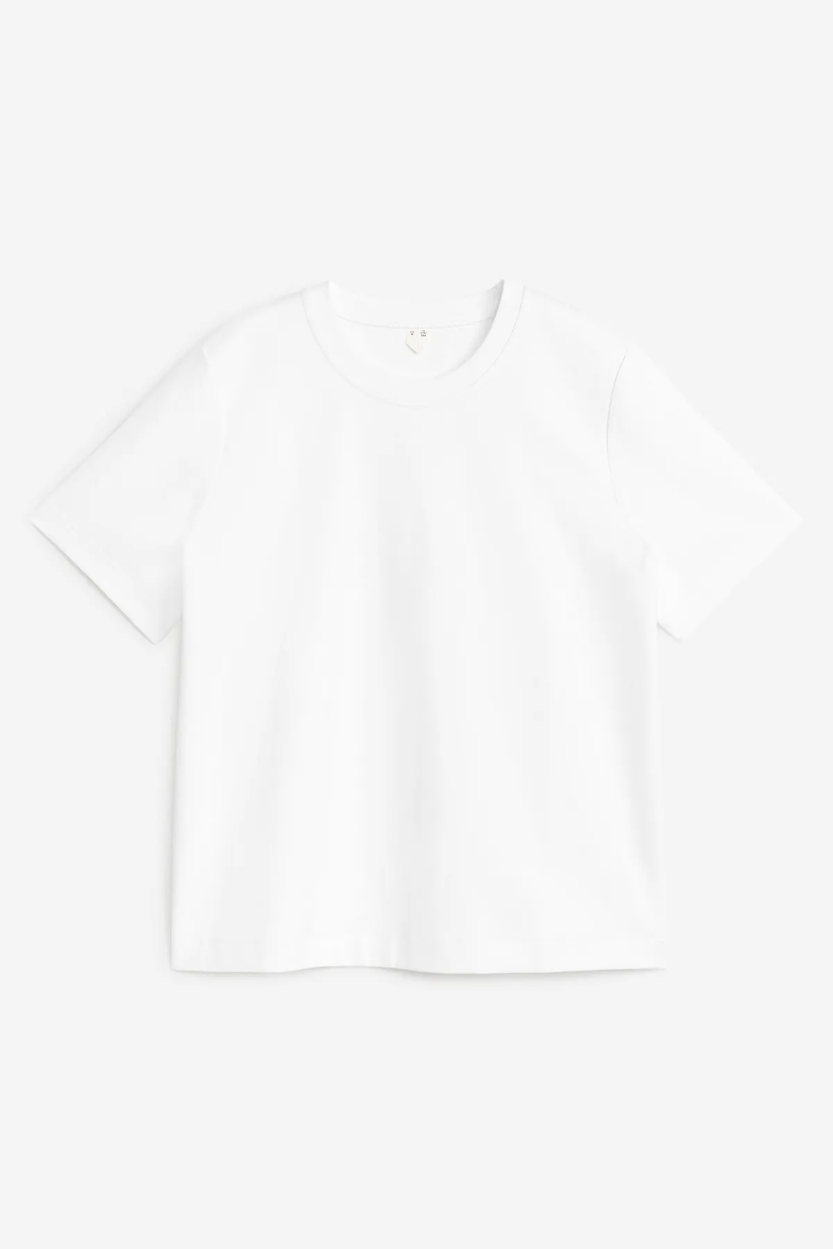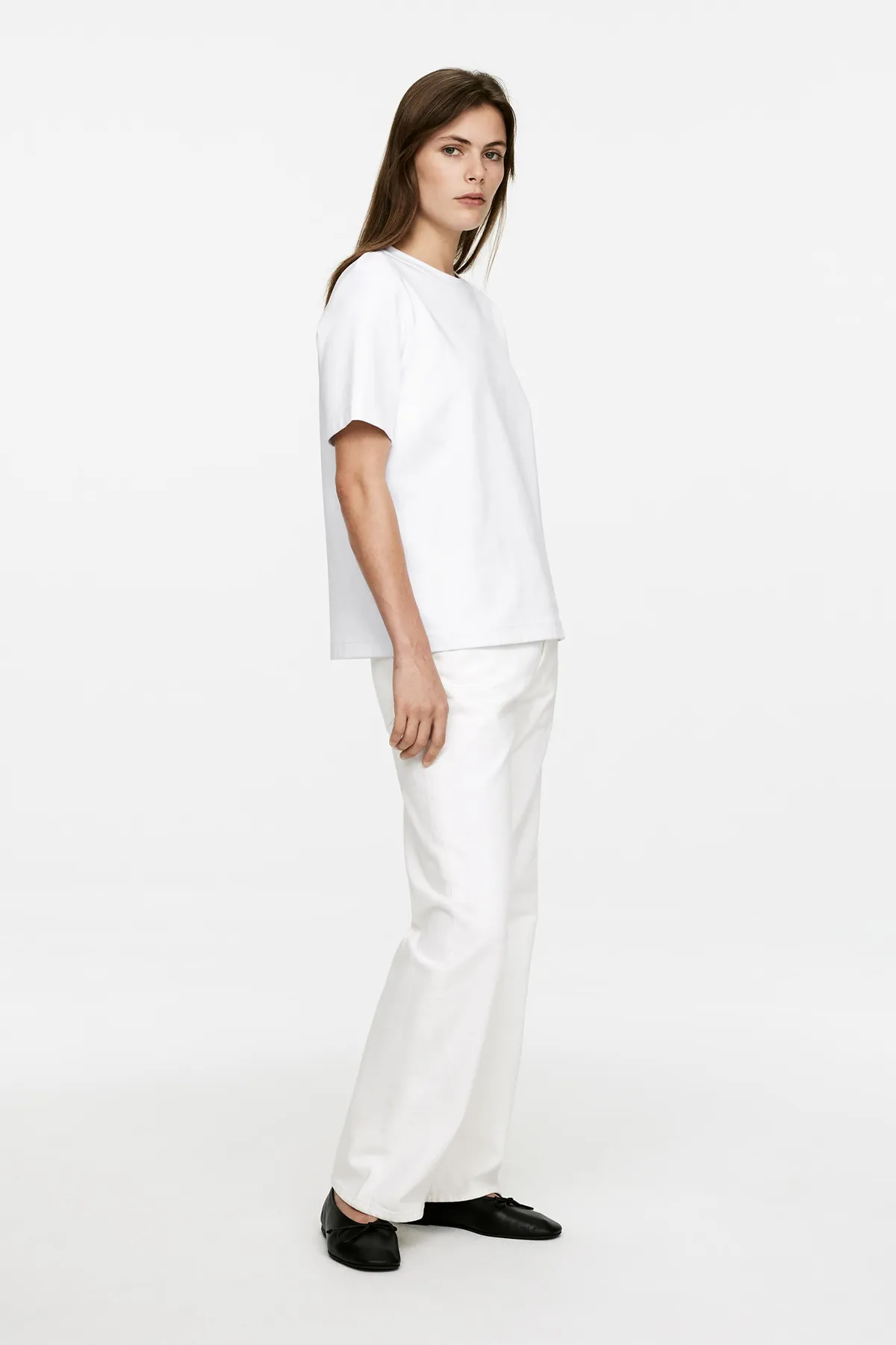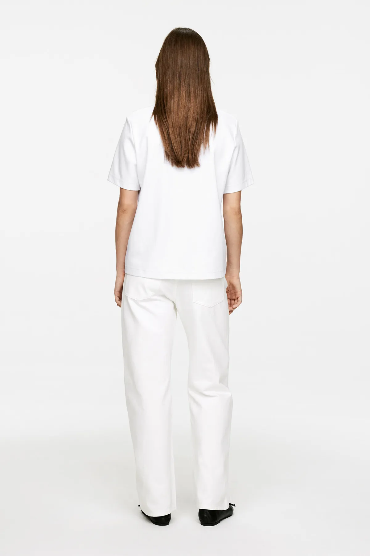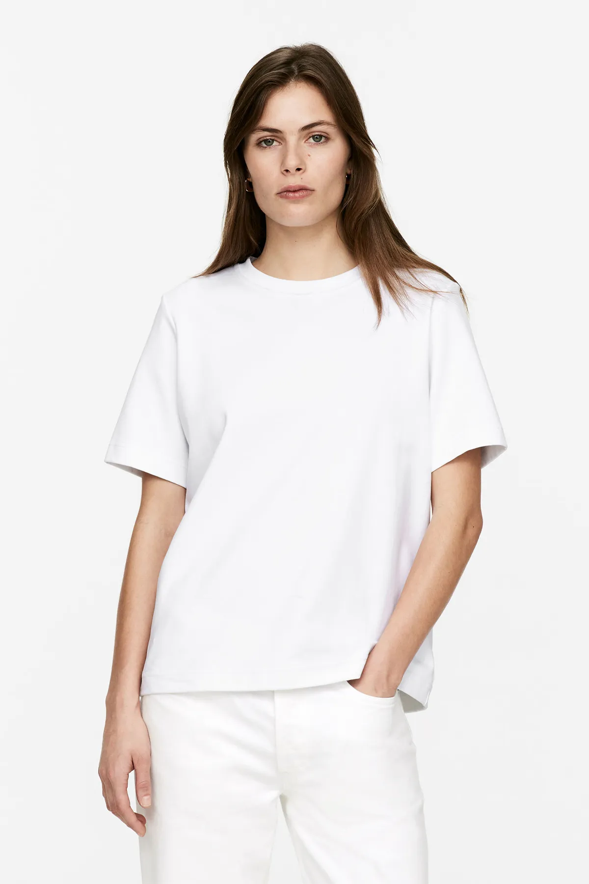 Футболка из плотного трикотажа интерлок. Прочный, но мягкий материал хорошо сохраняет форму и выглядит элегантно. Модель с короткими рукавами, круглым вырезом и классическим кроем.