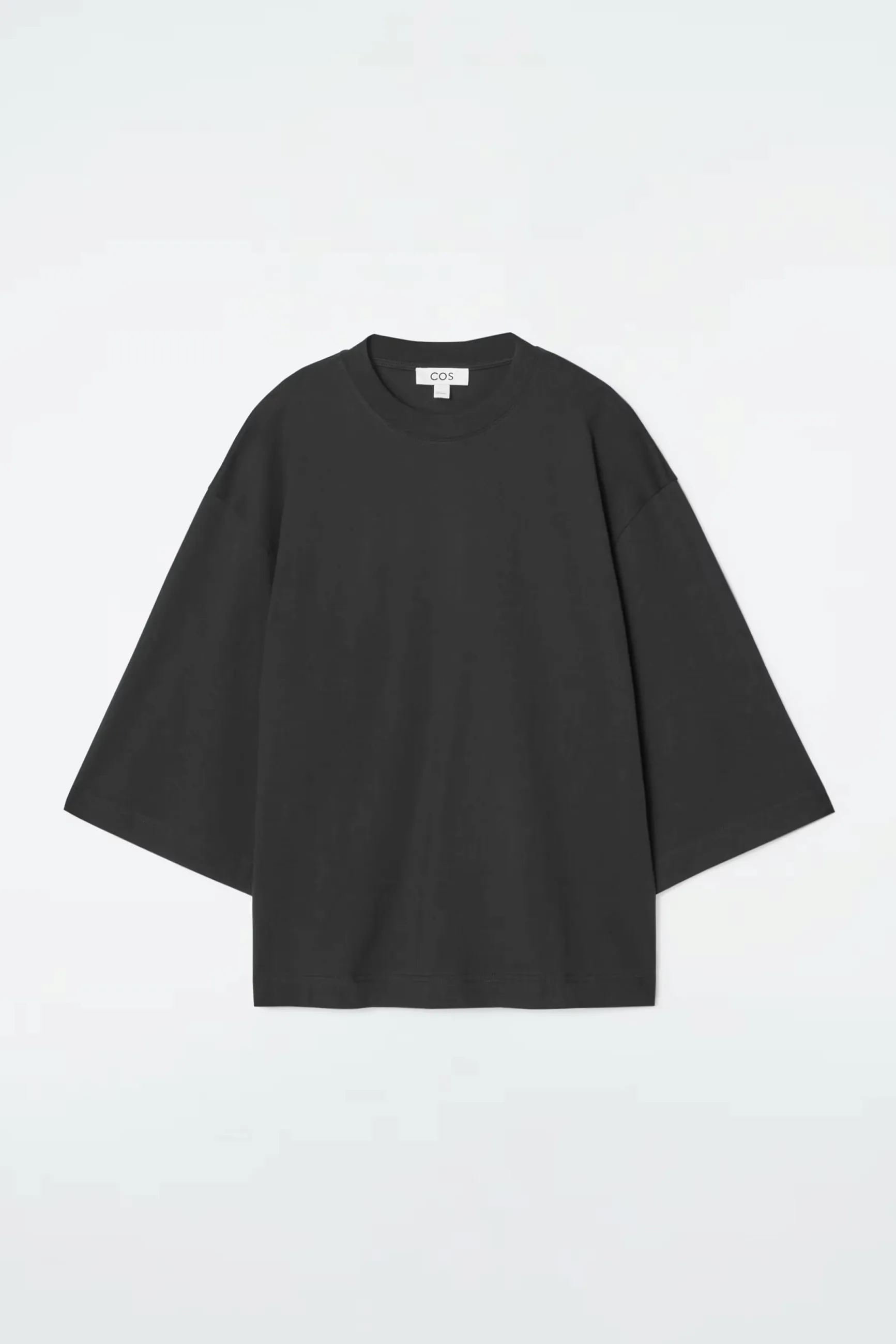 Эта современная футболка, изготовленная из мягкого органического хлопкового трикотажа, имеет А-образный крой и рукава три четверти. Она выполнена в насыщенном черном цвете — простом, но эффектном.