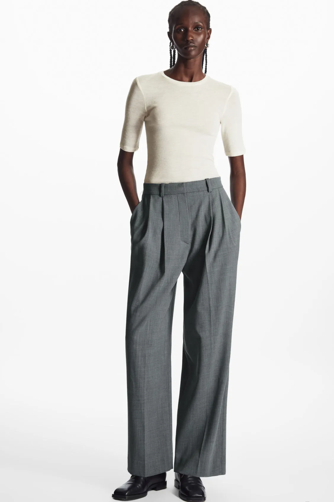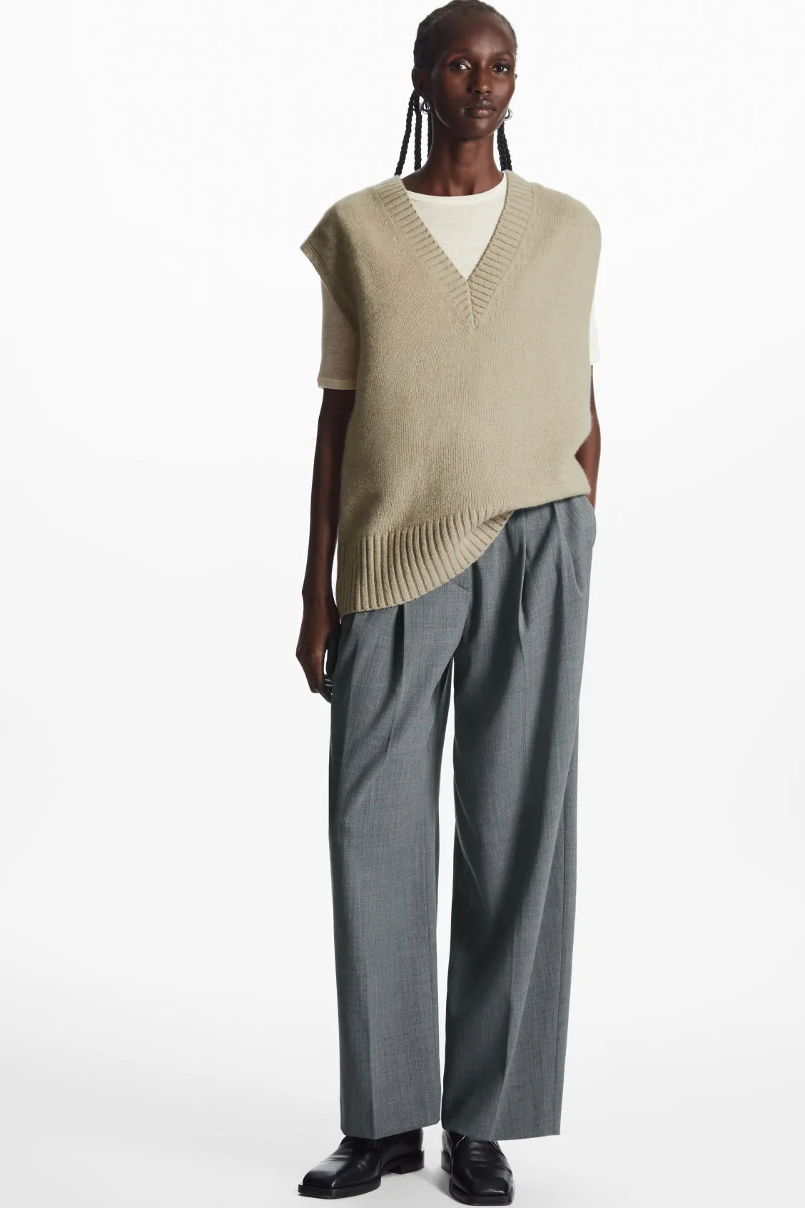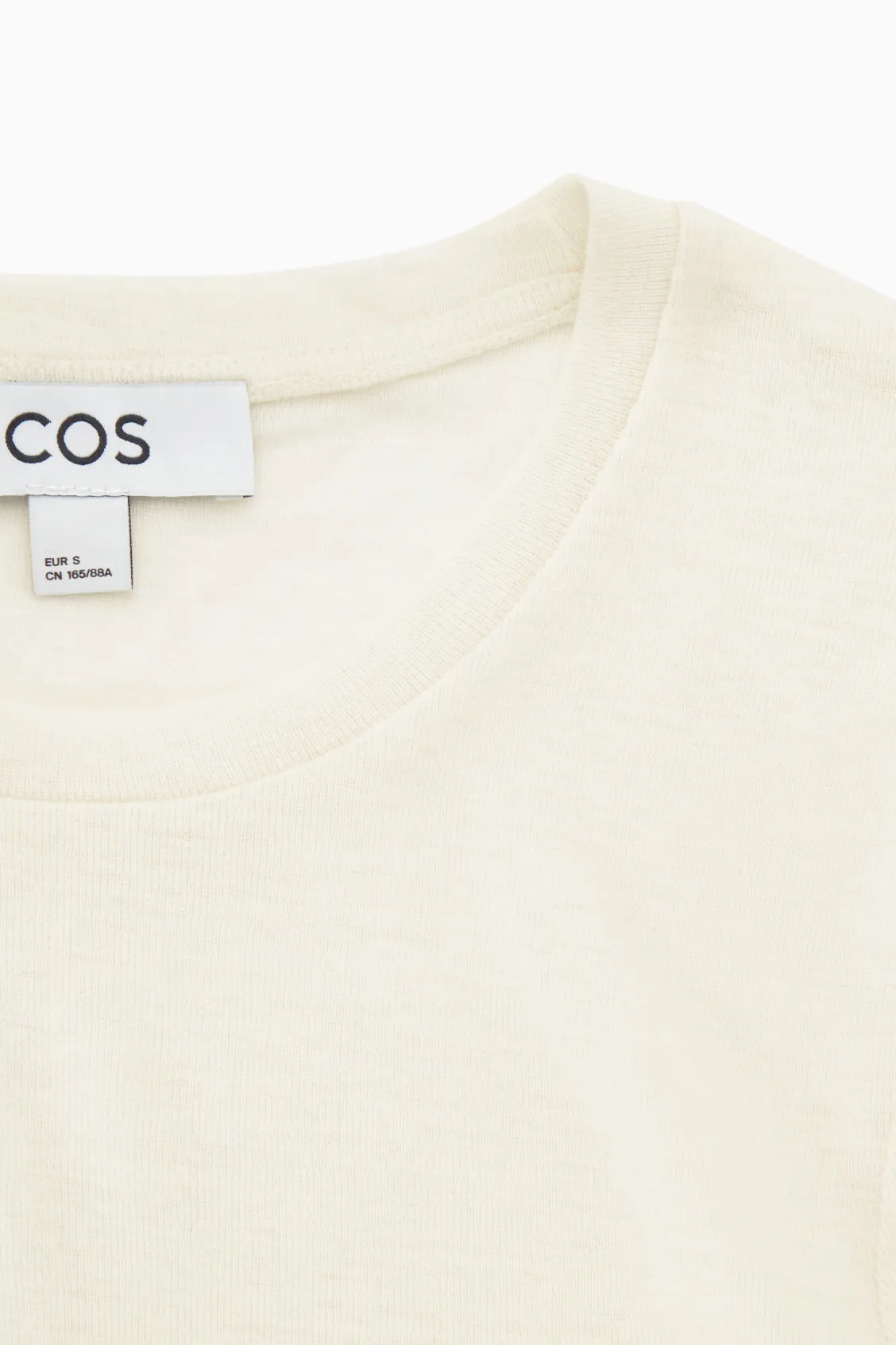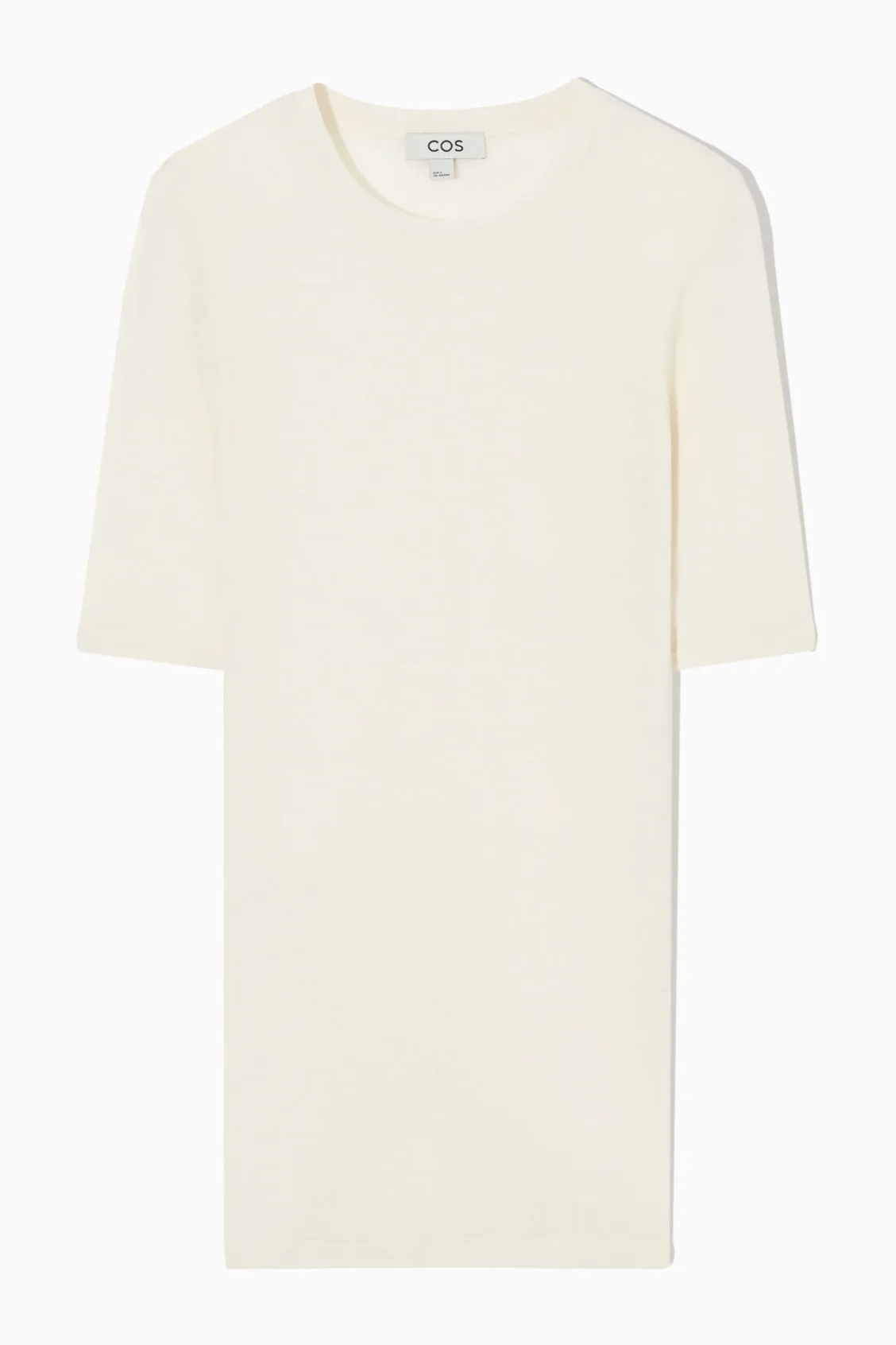 Чистая элегантность. Эта бежевая футболка из чистой мериносовой шерсти приталенного кроя с рукавами средней длины и немного более свободным вырезом создает современный образ.