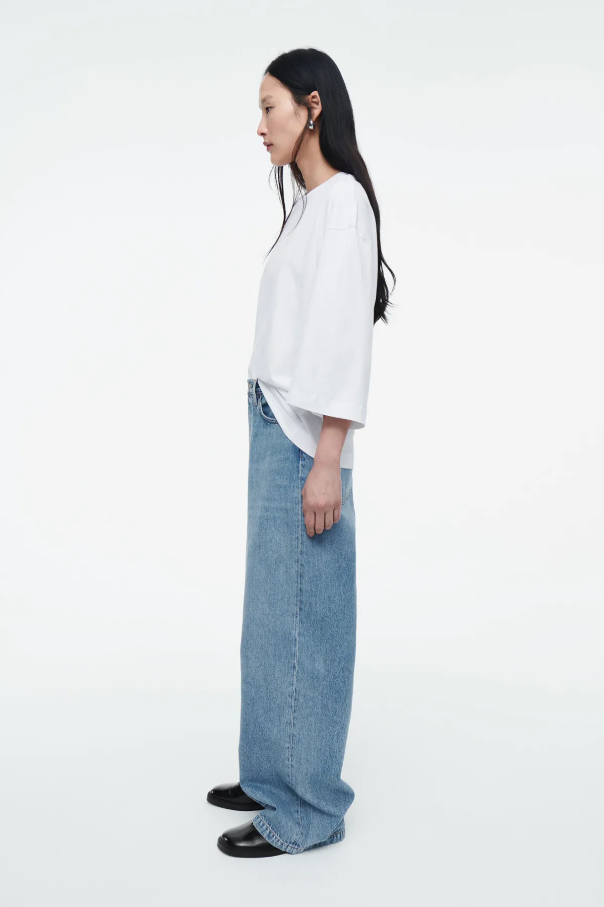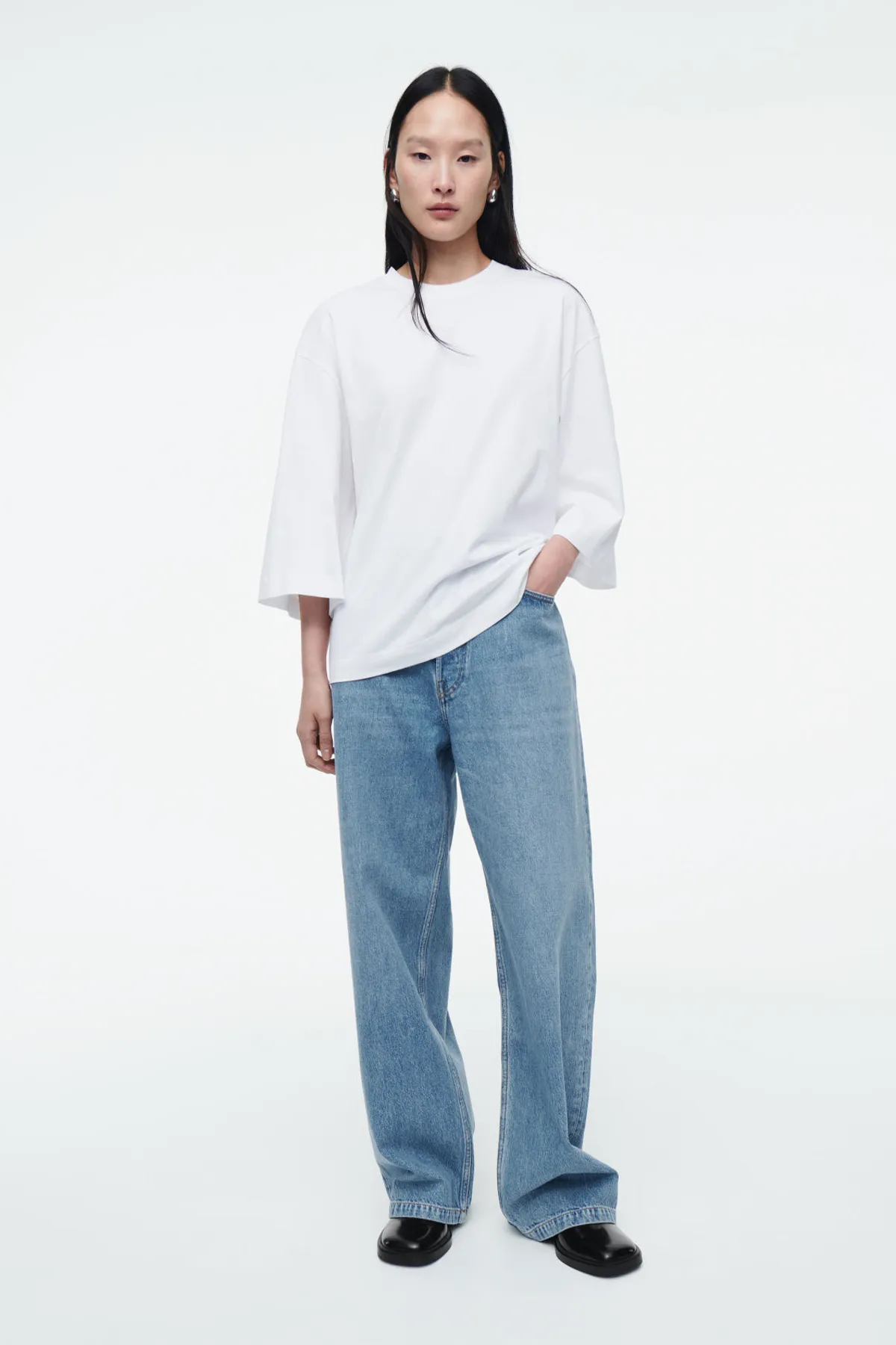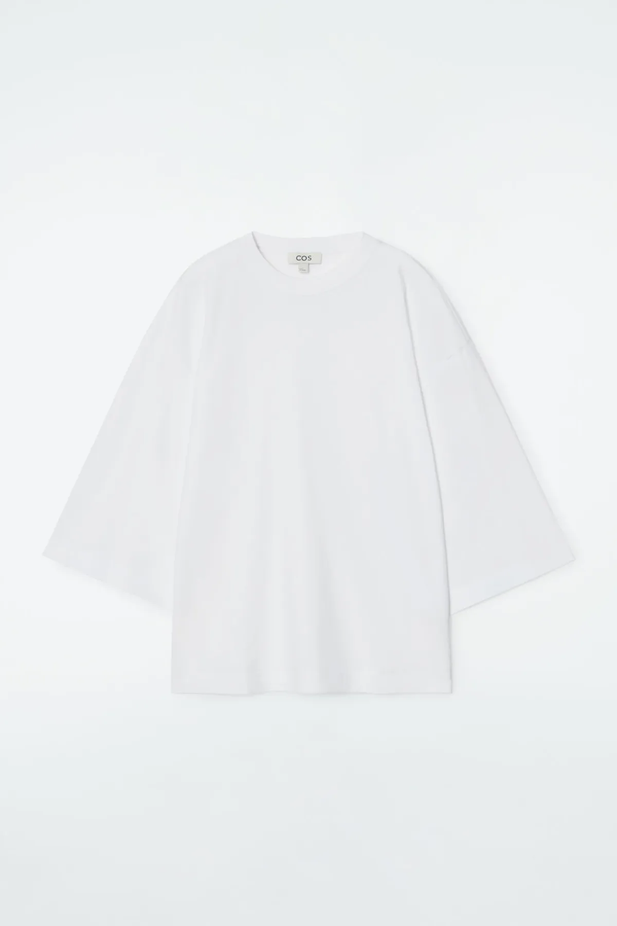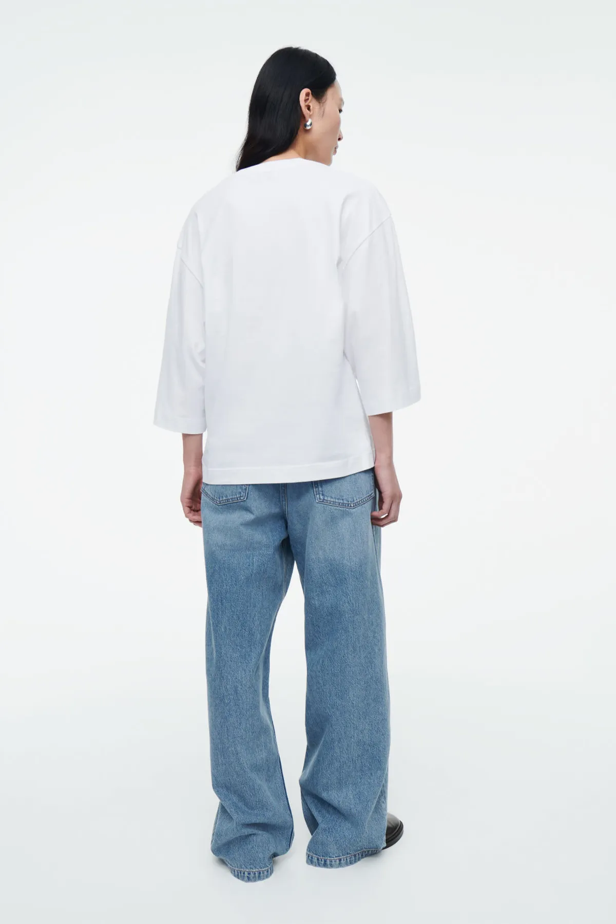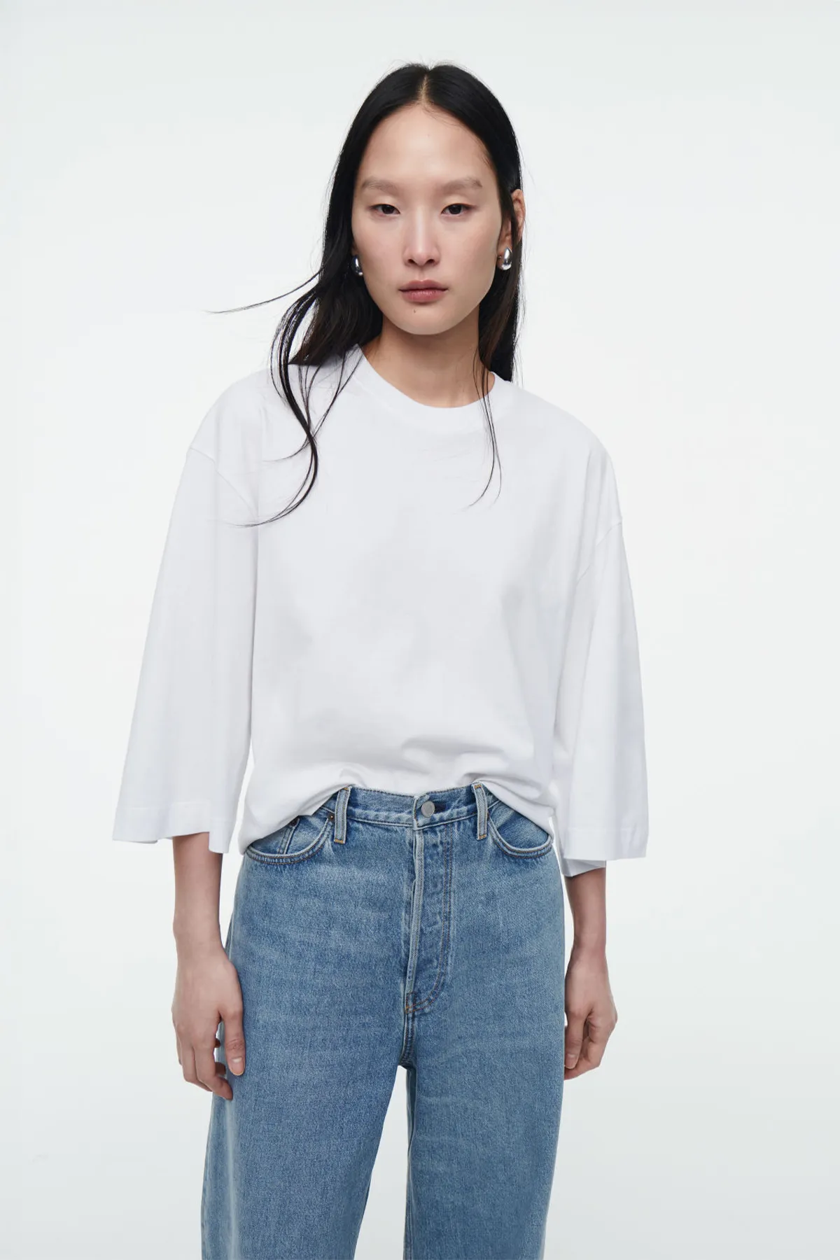 Эта современная футболка, изготовленная из мягкого органического хлопкового джерси, имеет трапециевидный крой с рукавами длиной три четверти. Она предлагается в свежем белом оттенке, который является простым, но ярким.