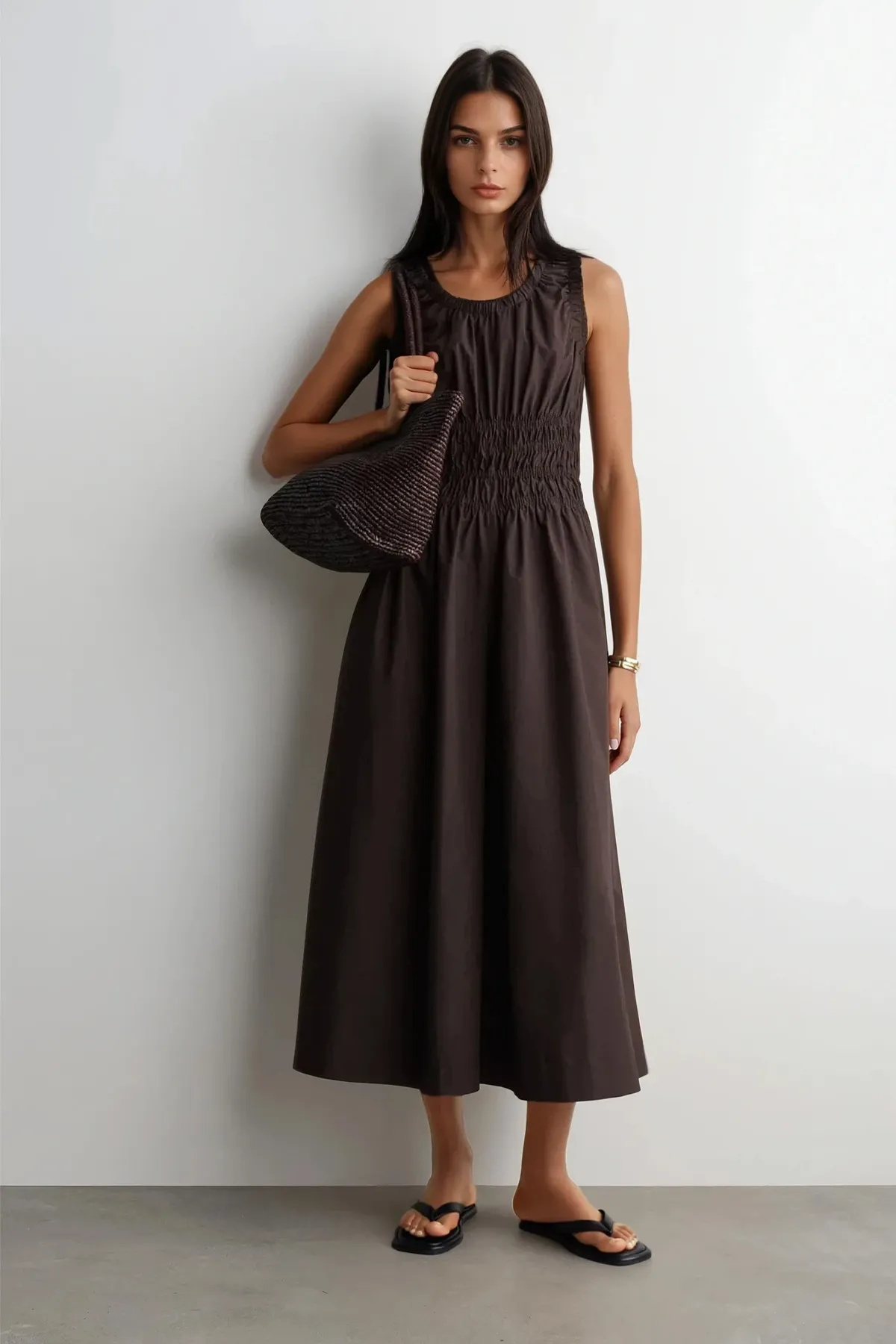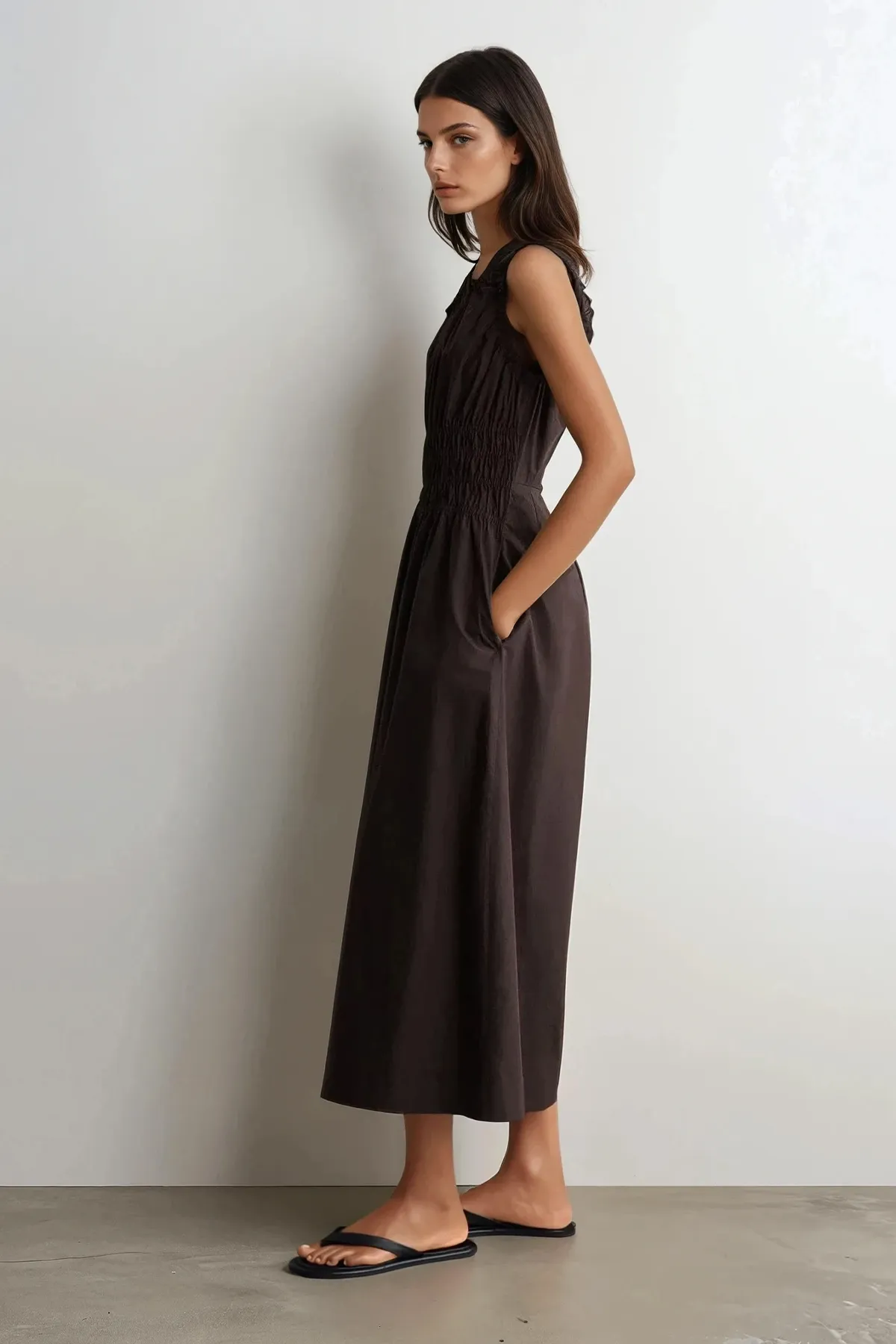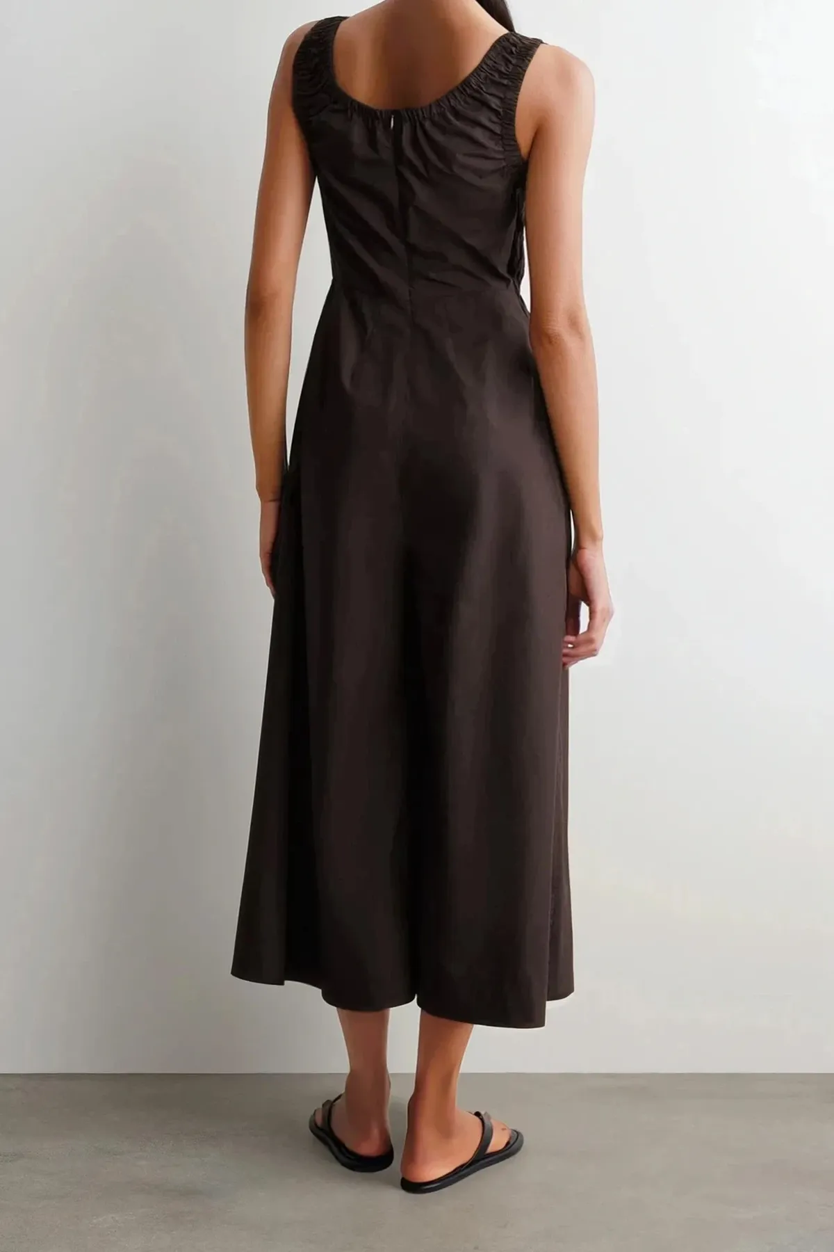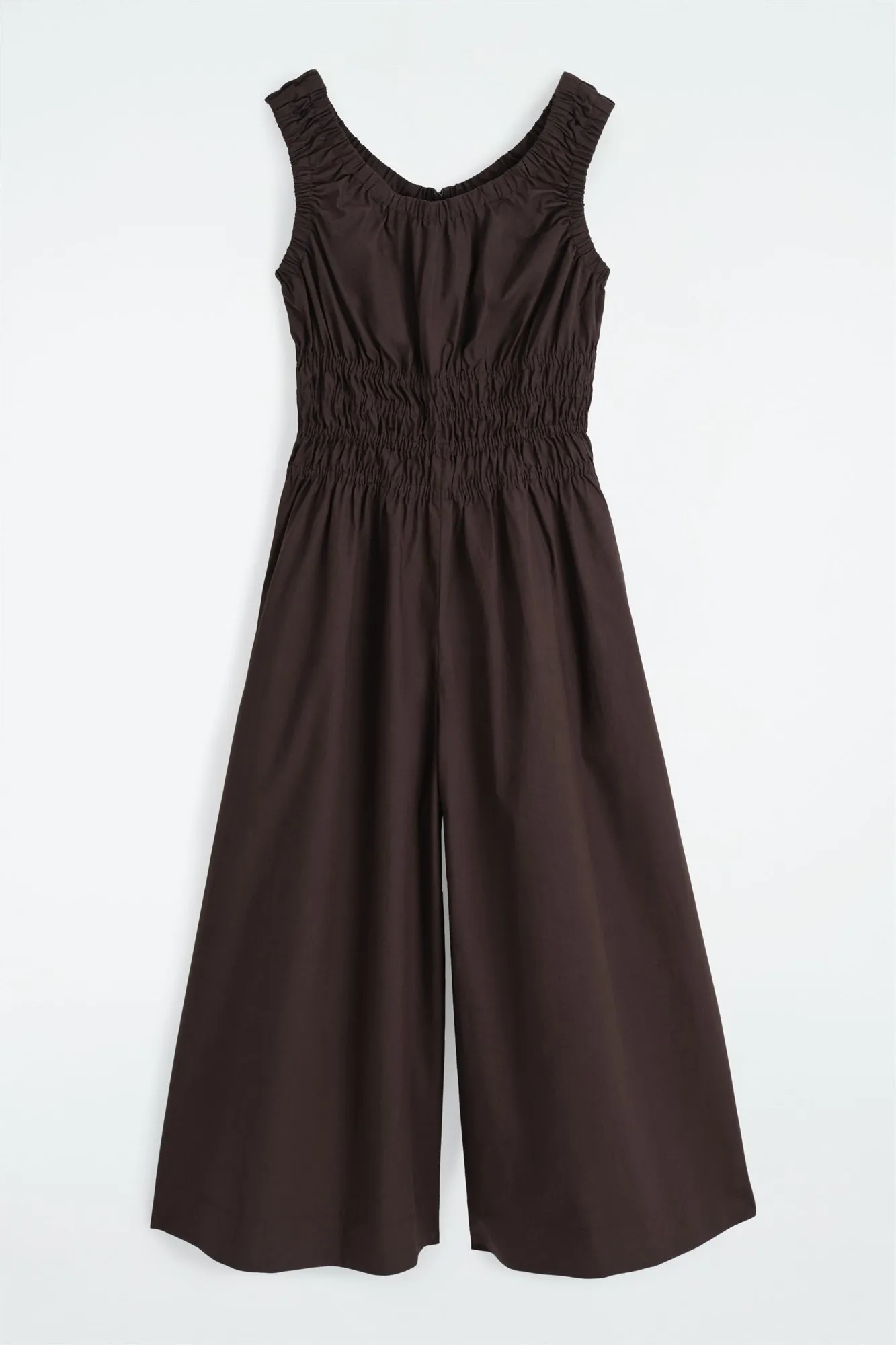 Мягкий хлопковый комбинезон насыщенного шоколадно-коричневого цвета с присборенной талией, широкими укороченными штанинами и незаметными карманами.