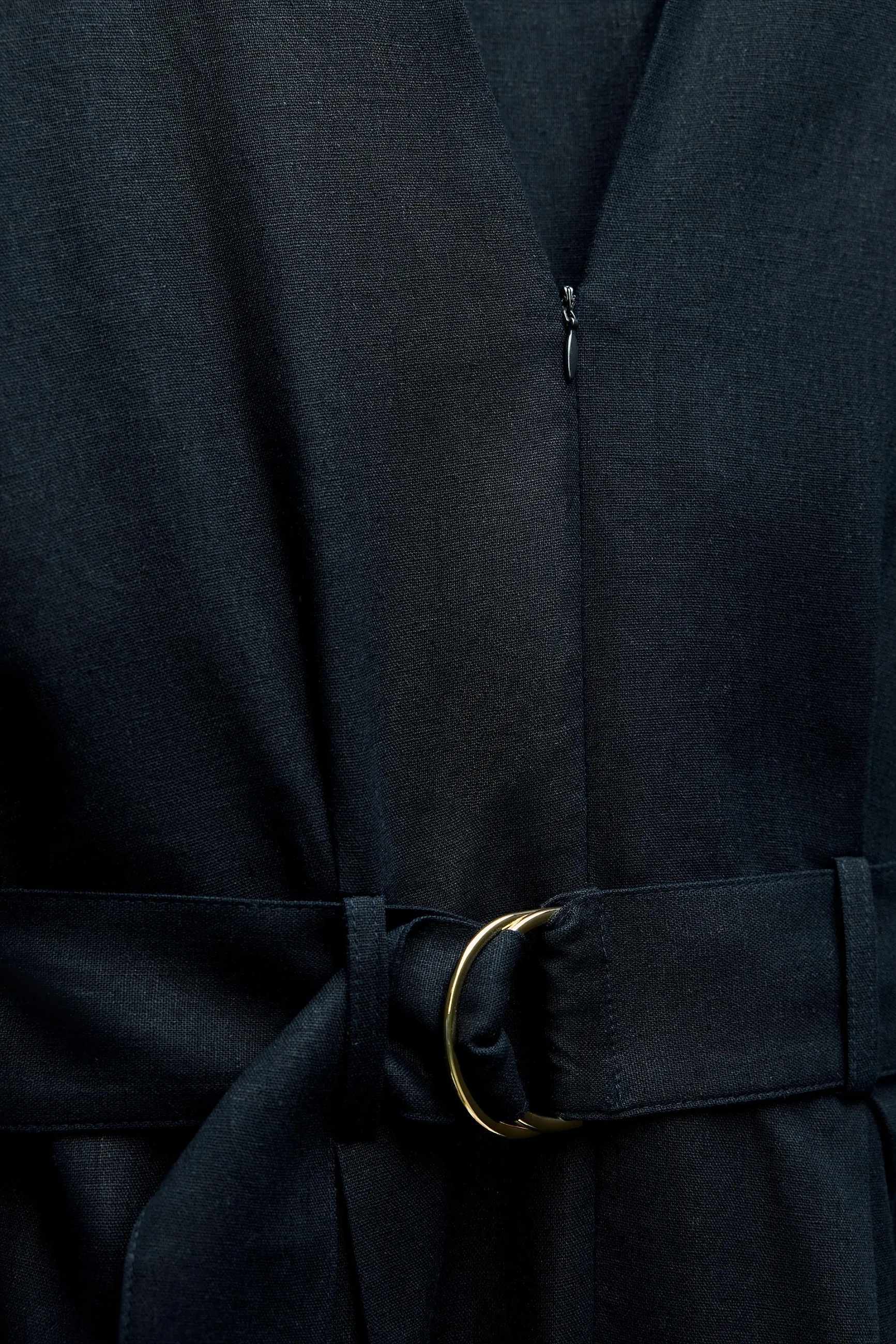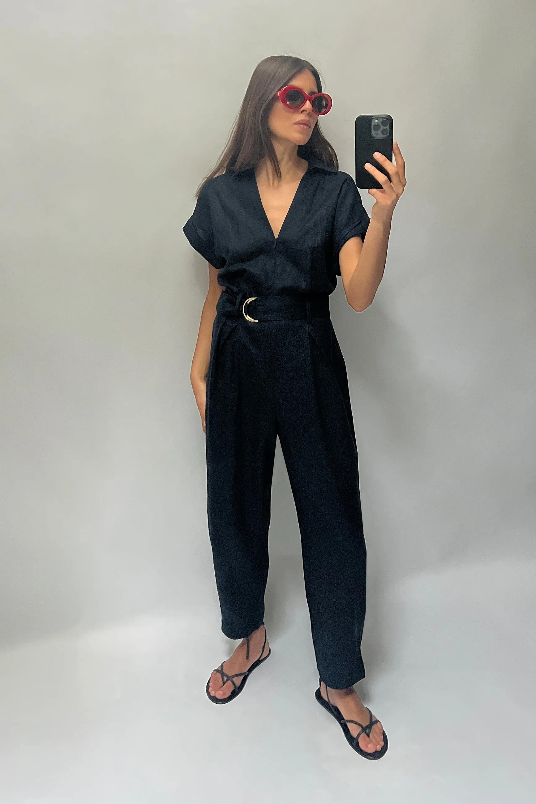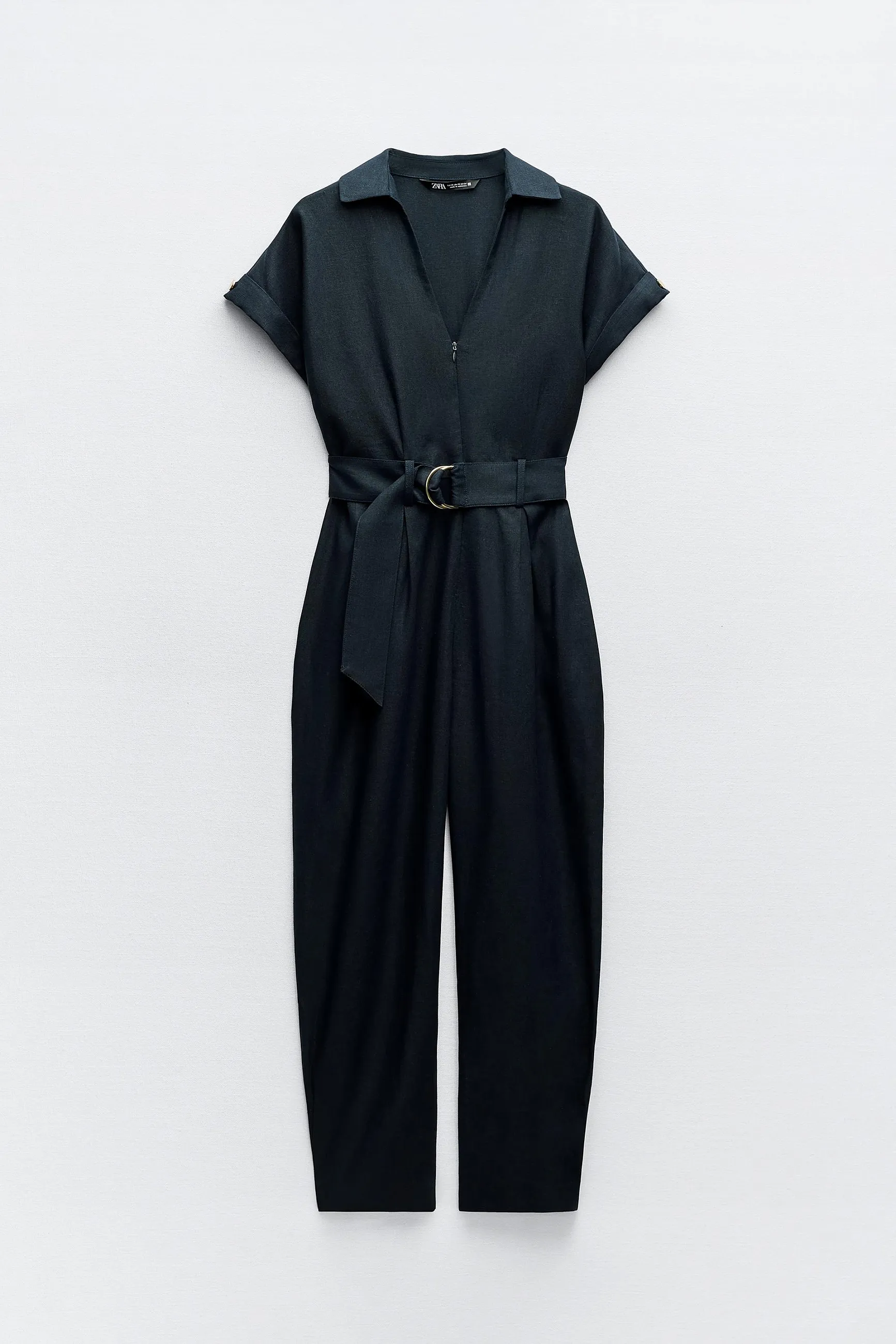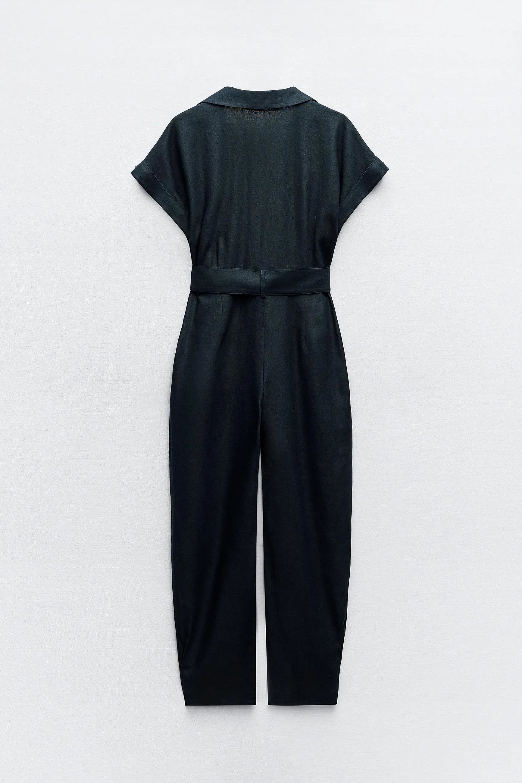 Комбинезон из смесового льна. Воротник Джонни и короткие рукава с отворотами на пуговицах. Деталь ремня из той же ткани с двойной пряжкой. Вытачки на талии и подоле. Модель с прямыми штанинами. Потайная застежка-молния спереди.