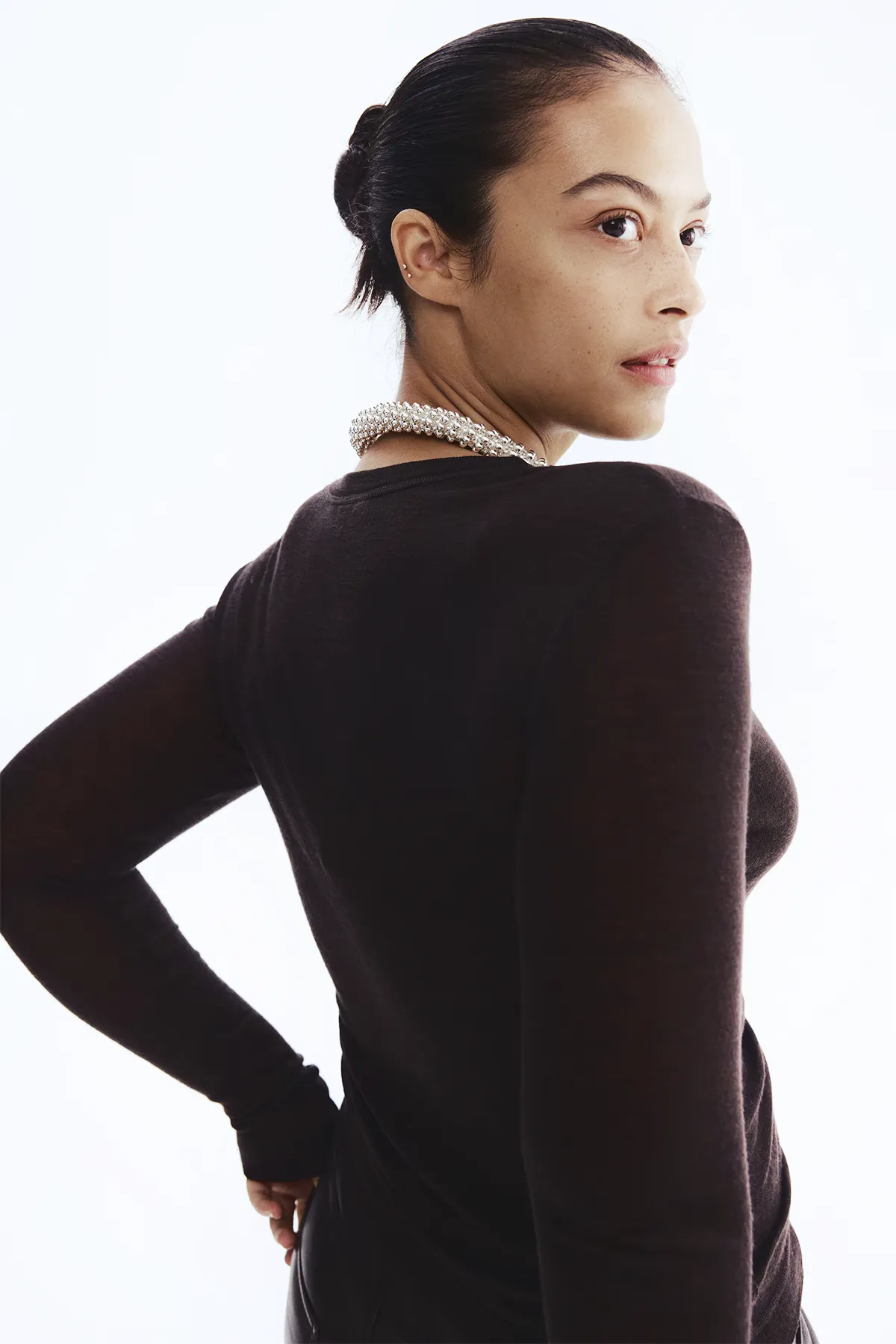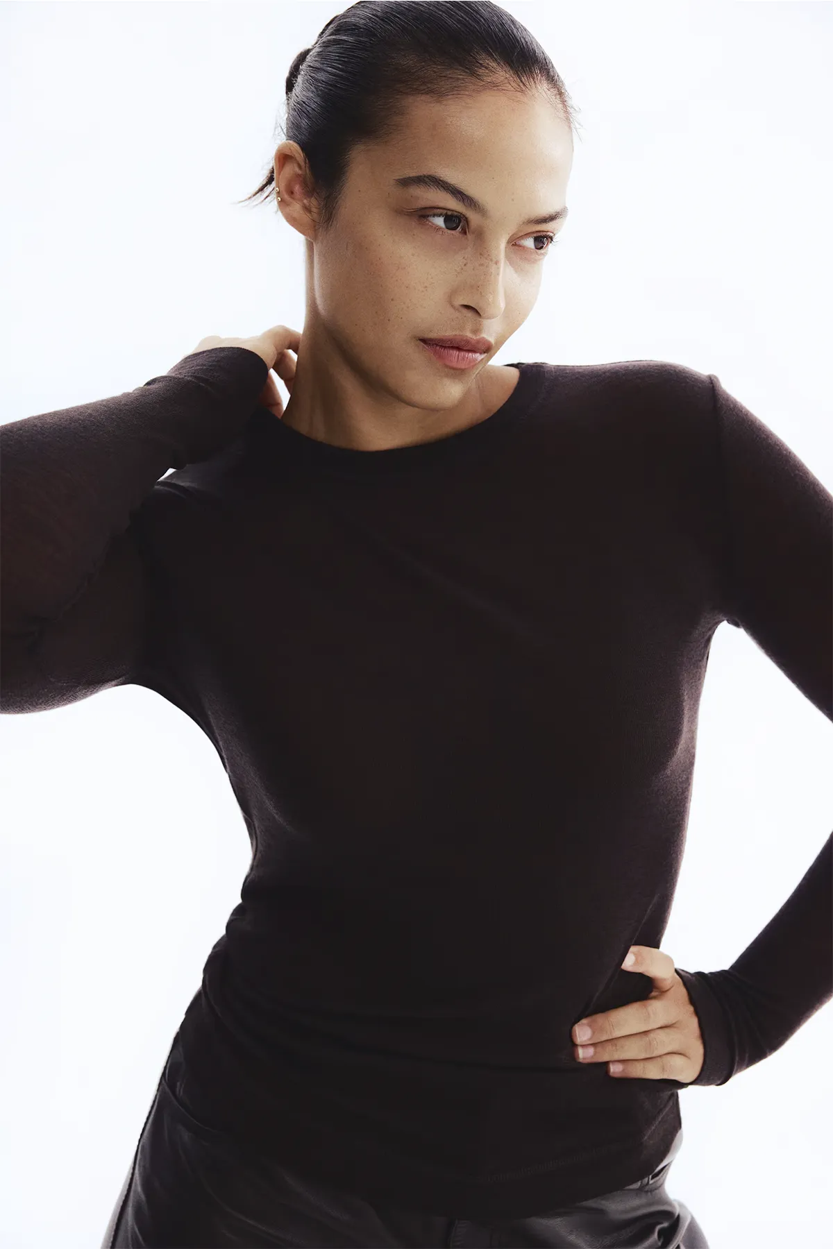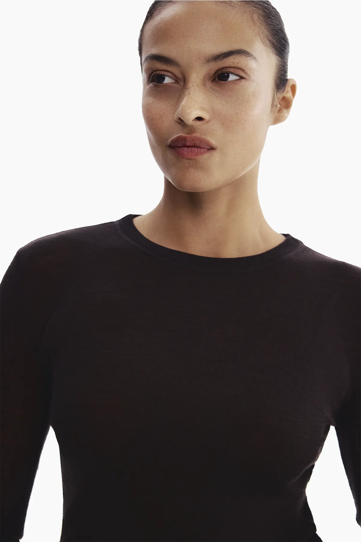 Облегающий шерстяной лонгслив из тонкого трикотажа с плоскими швами, предотвращающими натирание. Круглый ребристый вырез и удлиненные рукава.