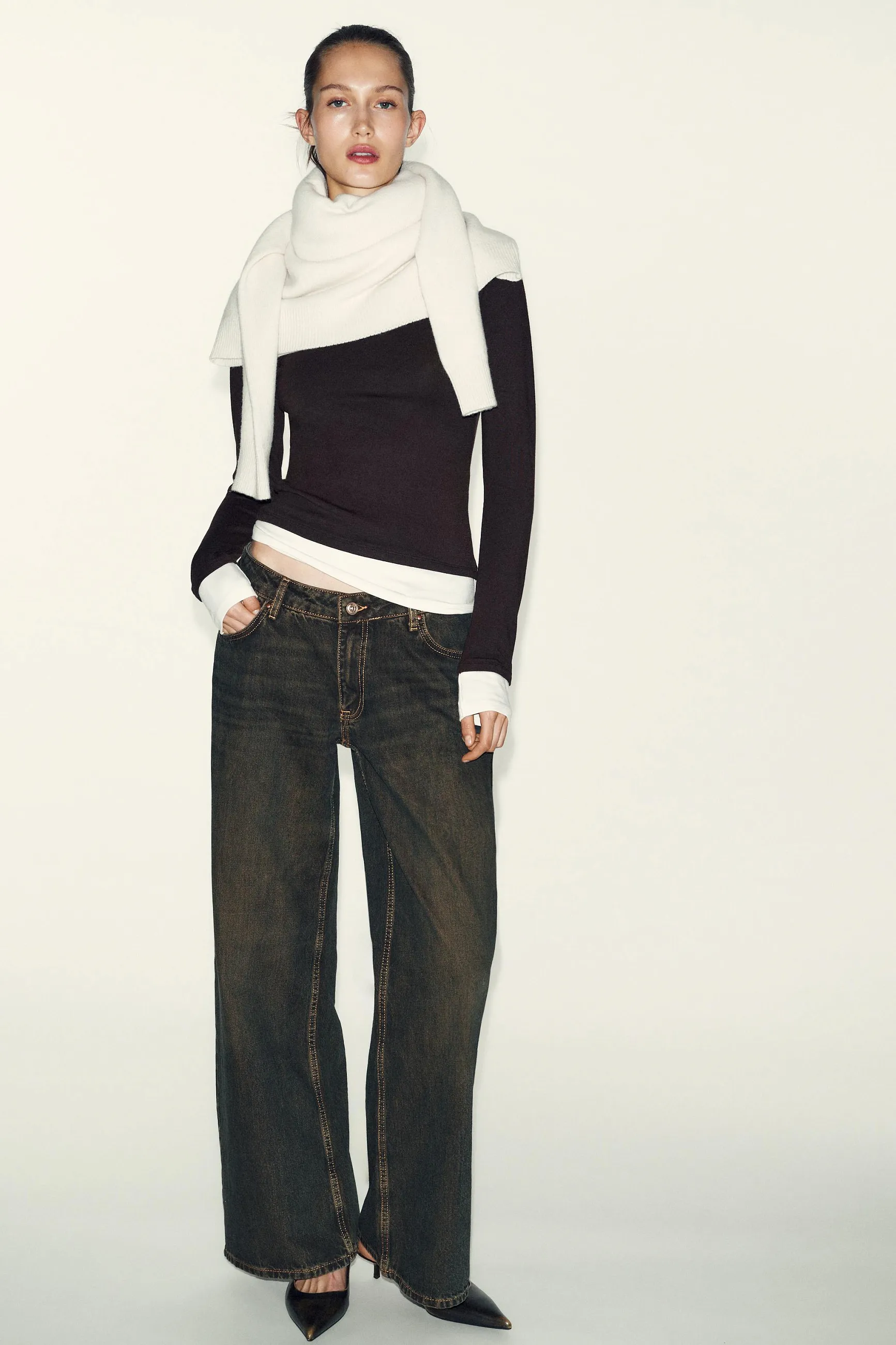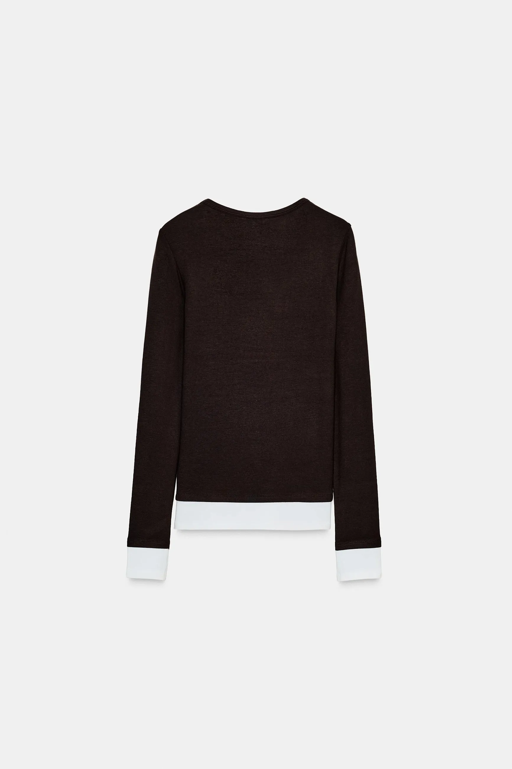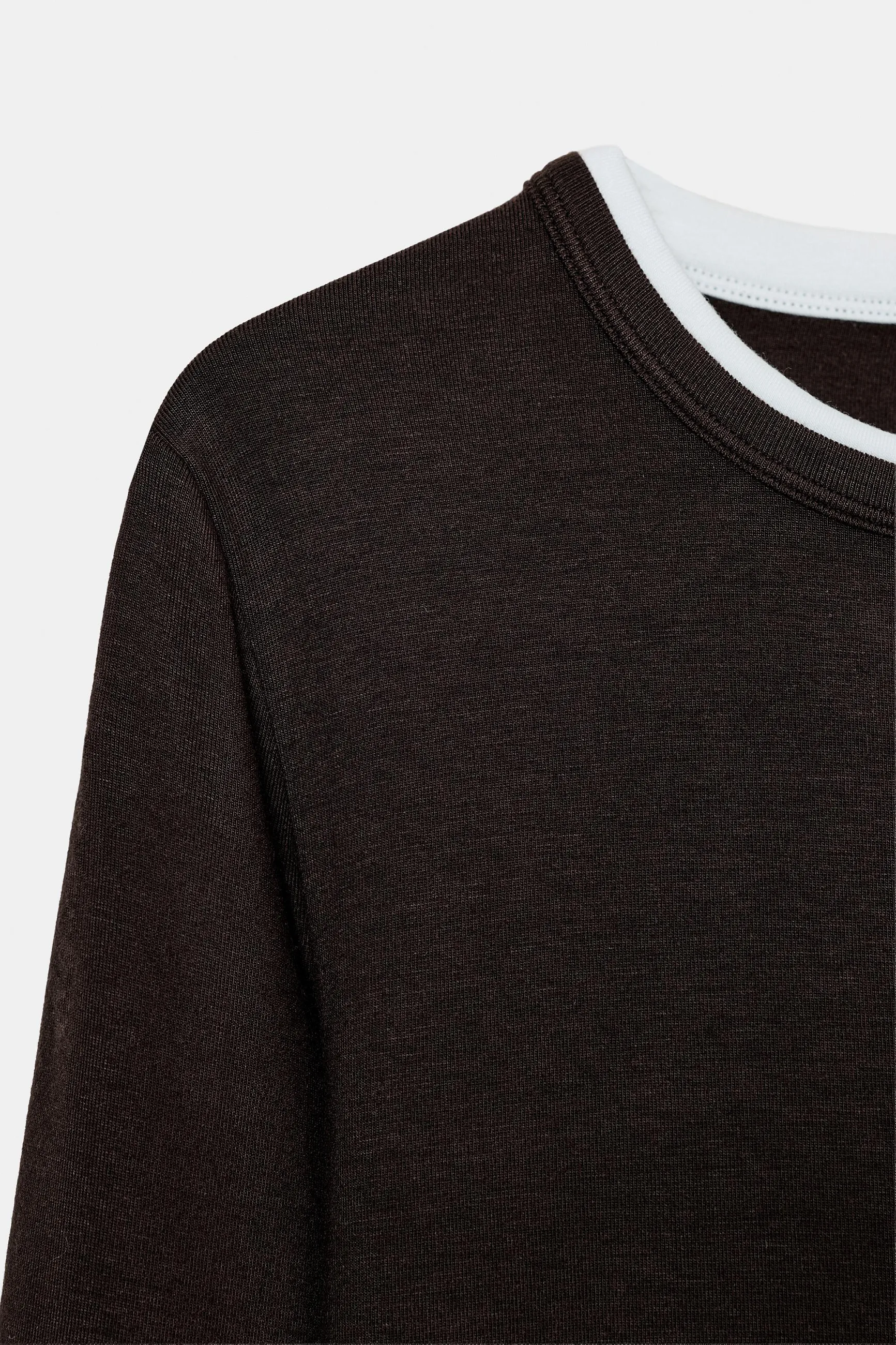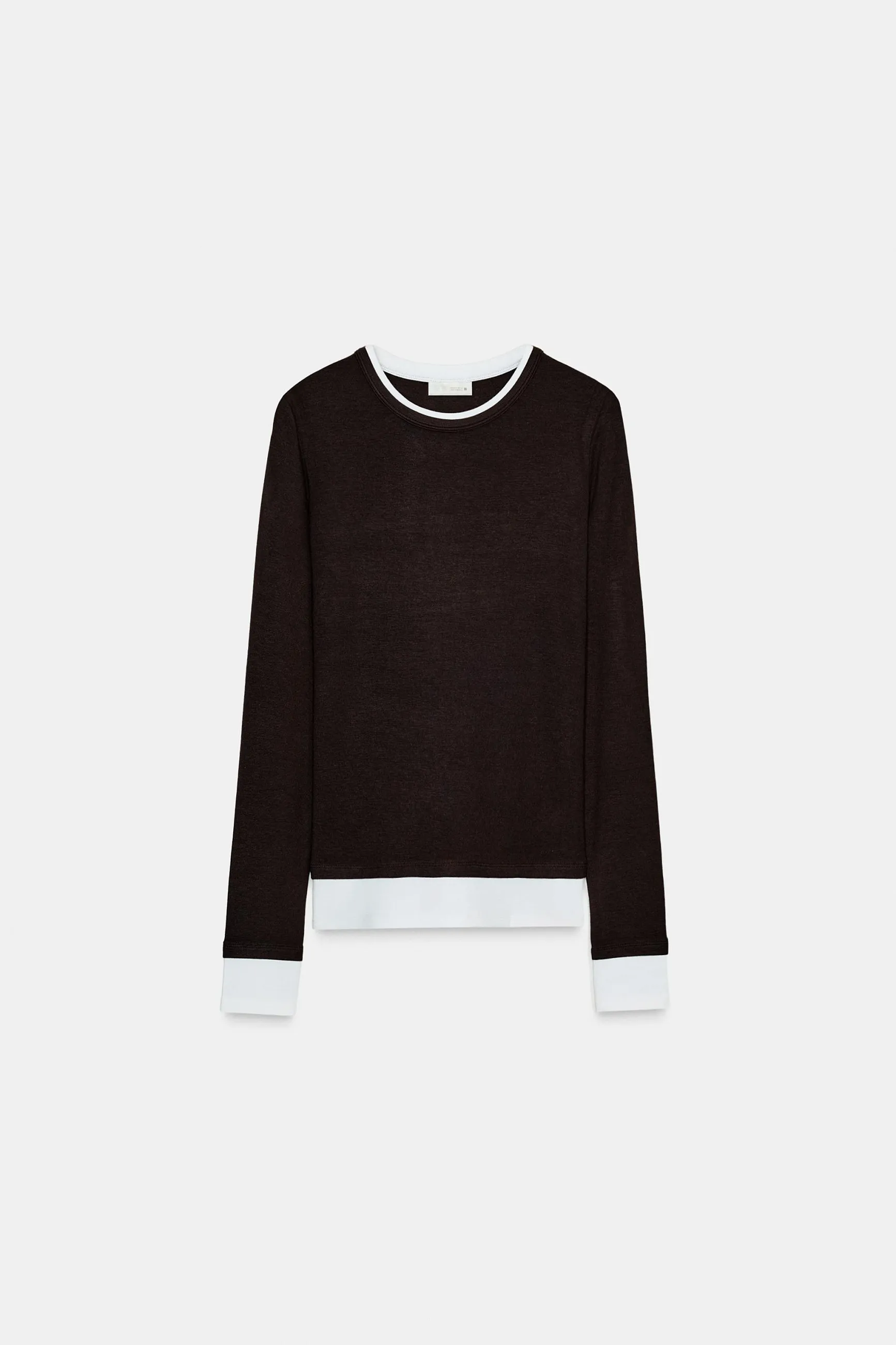 Футболка с круглым вырезом и длинными рукавами. Деталь из ткани с двойным контрастным эффектом. Прямой низ.