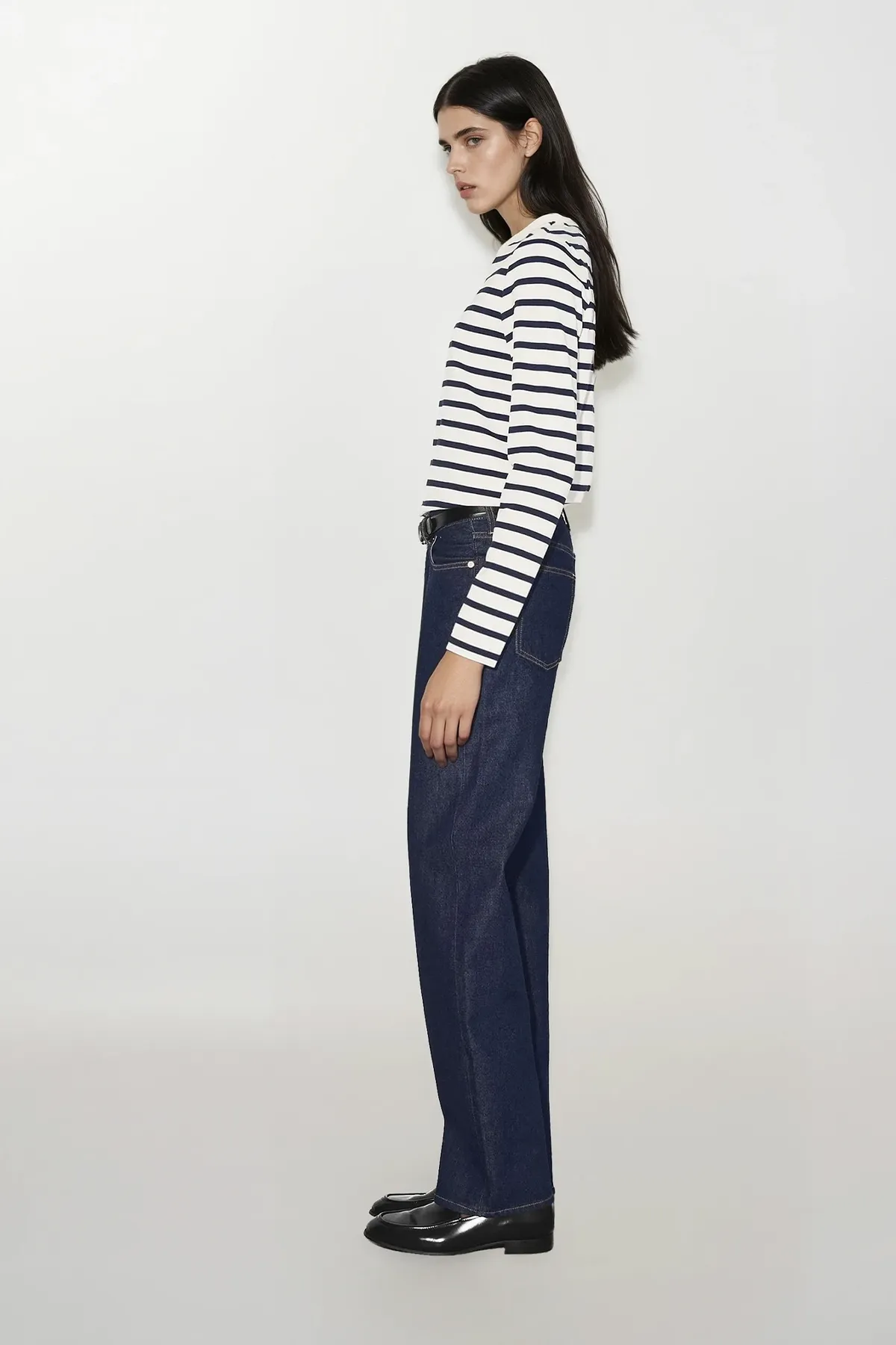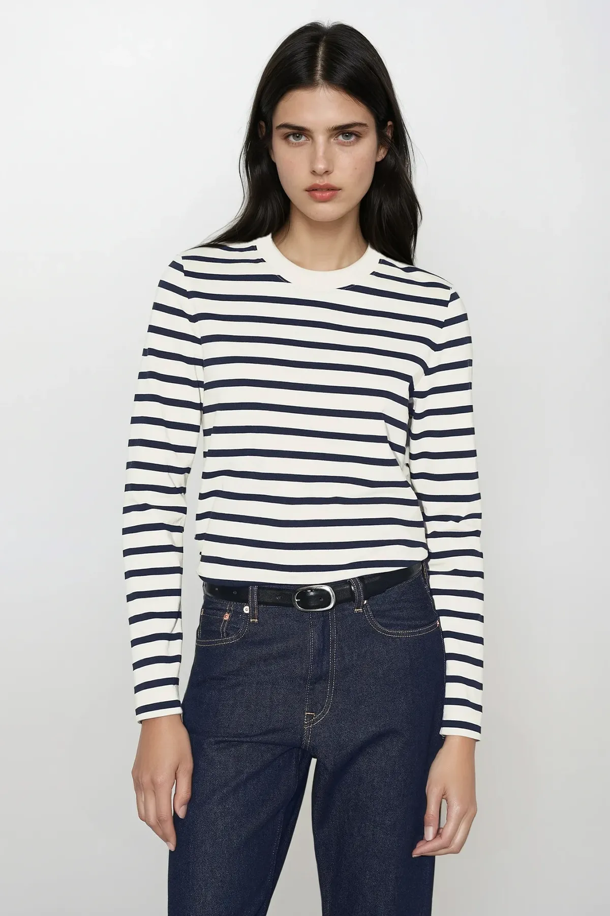 Этот лонгслив с длинными рукавами, выполненная из мягкого органического хлопкового трикотажа, имеет классический крой и слегка укороченный подол. Настоящая классика с темно-синими полосками, которая подойдет большинству вещей в вашем гардеробе.