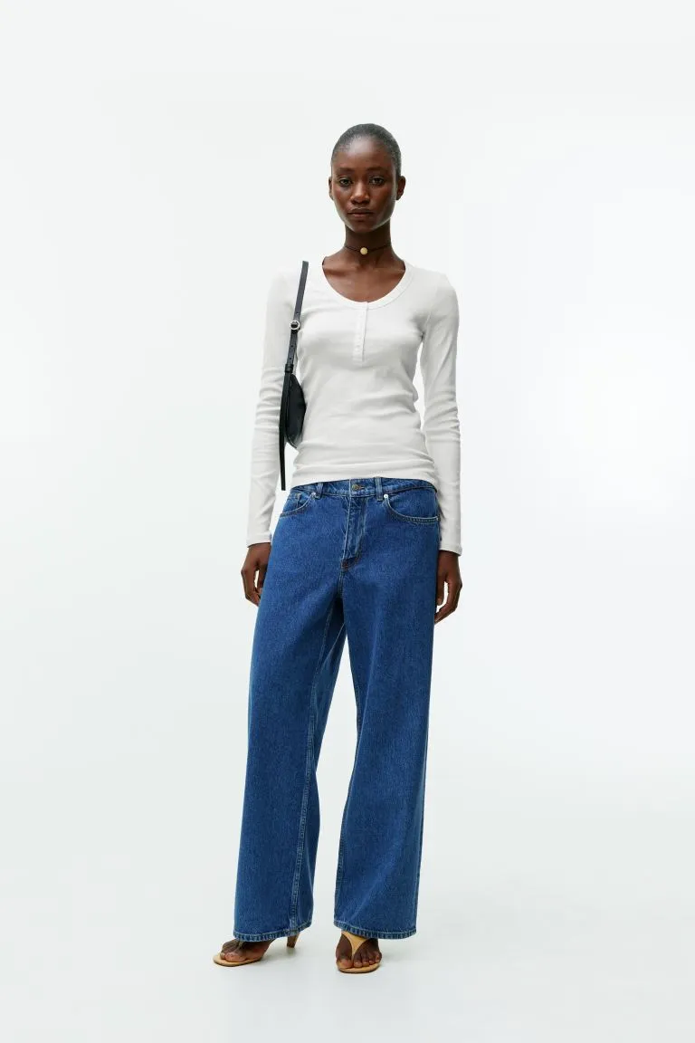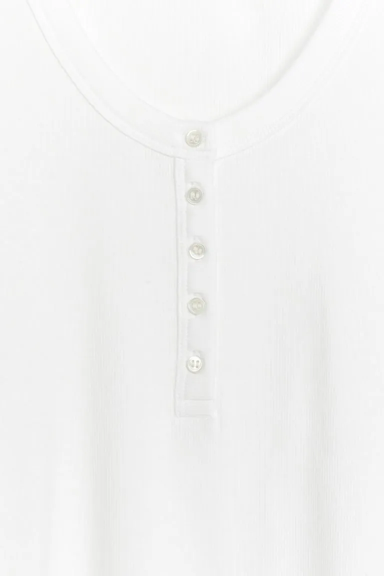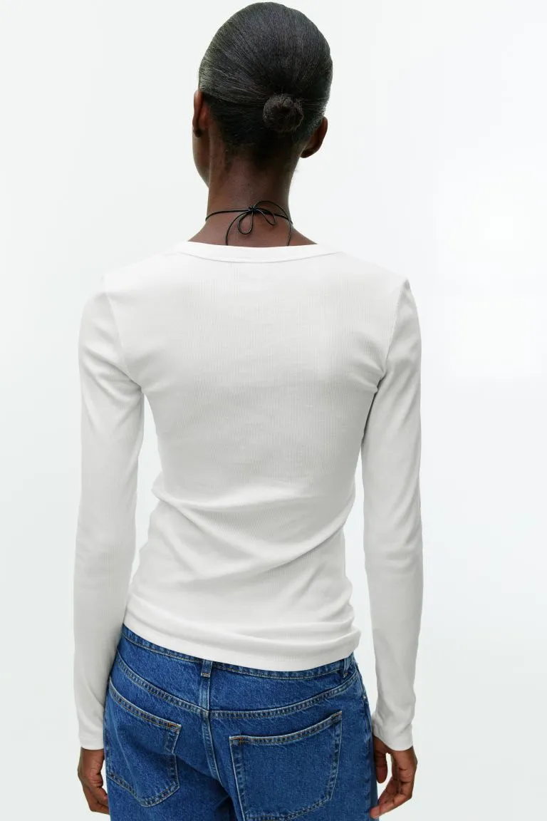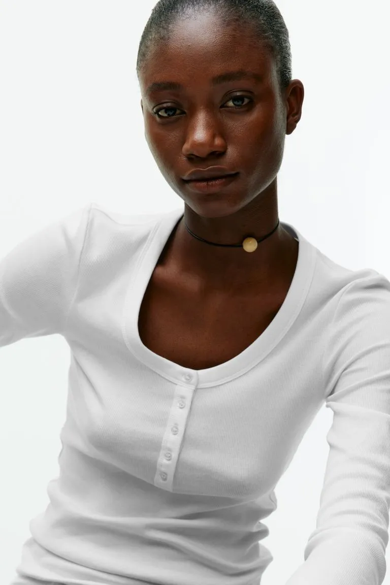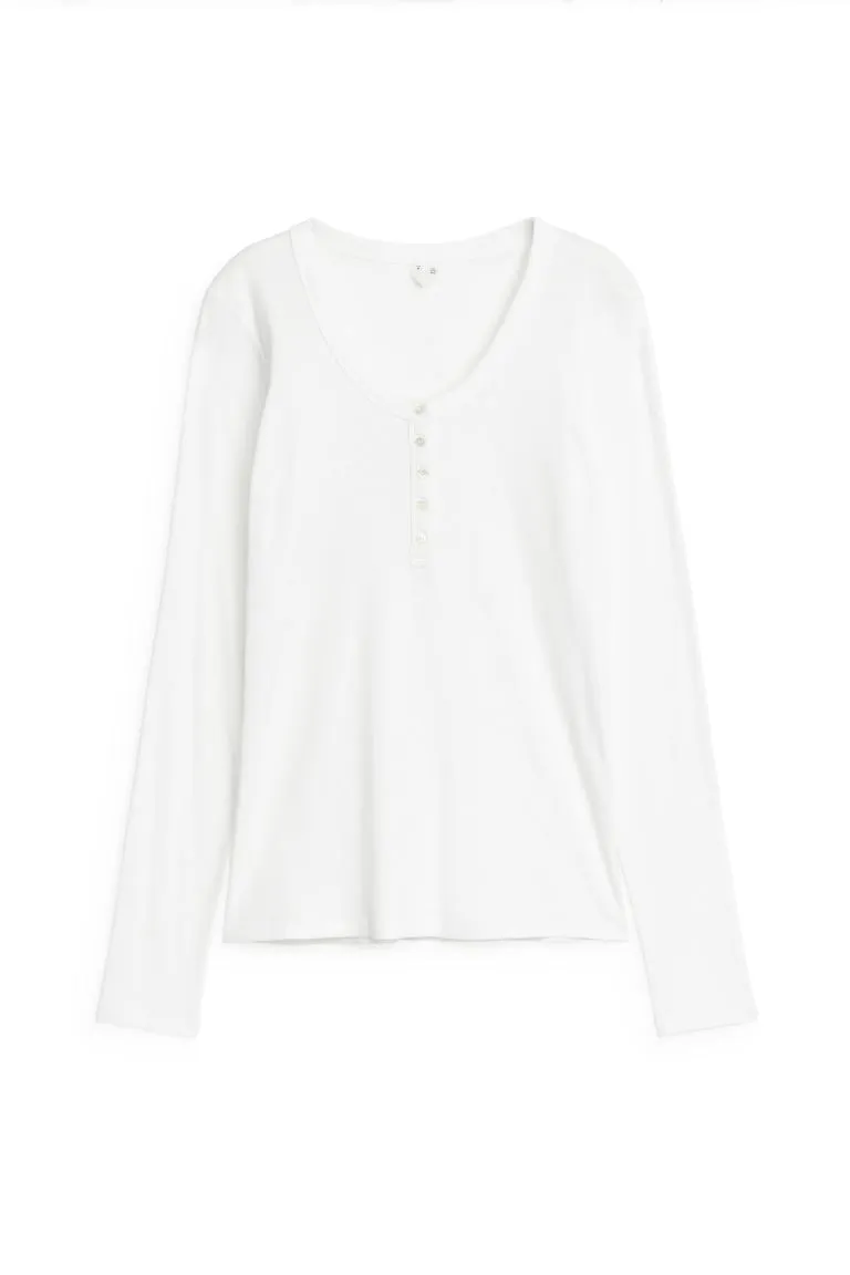 Трикотажный лонгслив в рубчик из смесового хлопка. Приталенный крой с длинными рукавами и круглым вырезом на пуговицах, который можно стилизовать для большей универсальности.