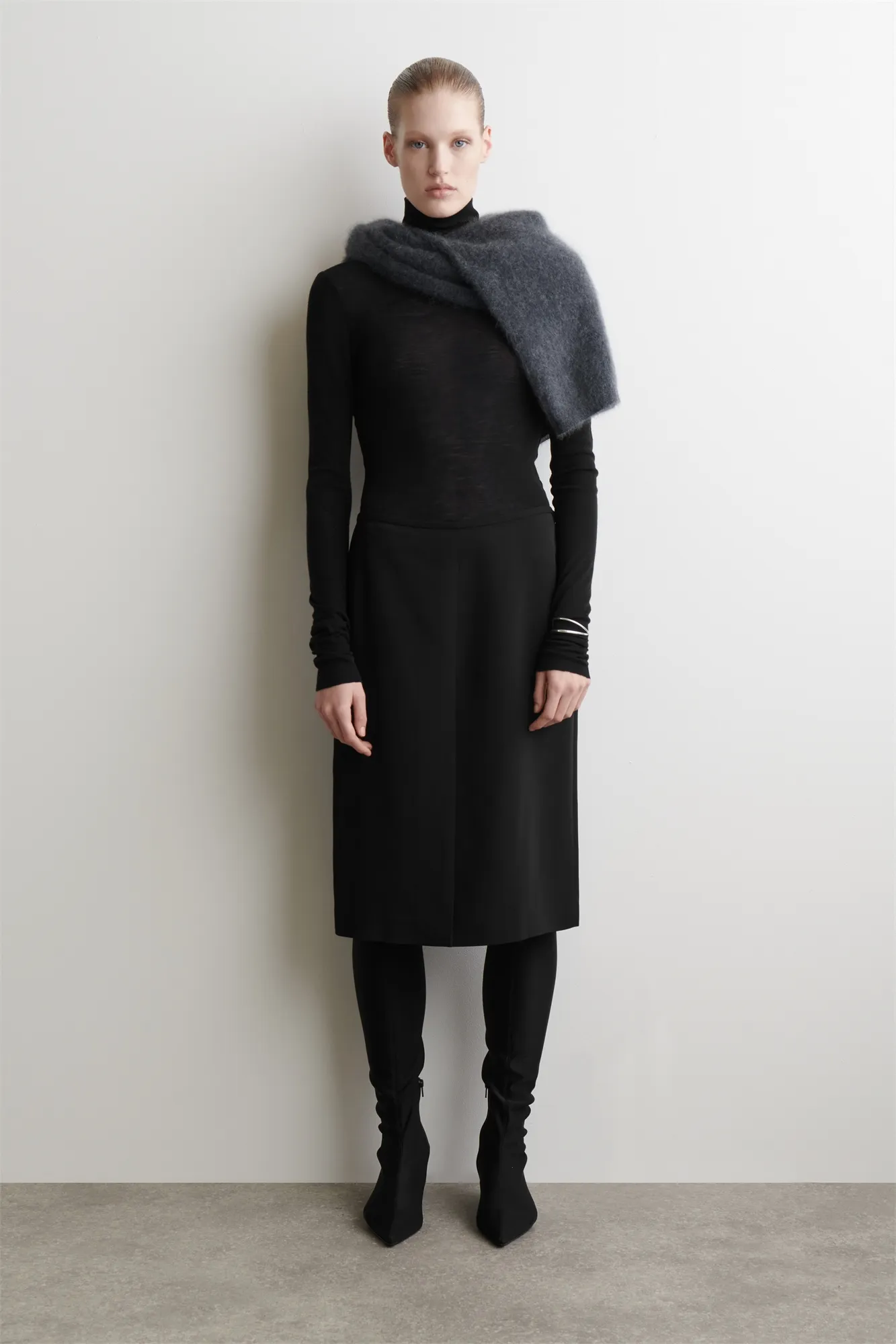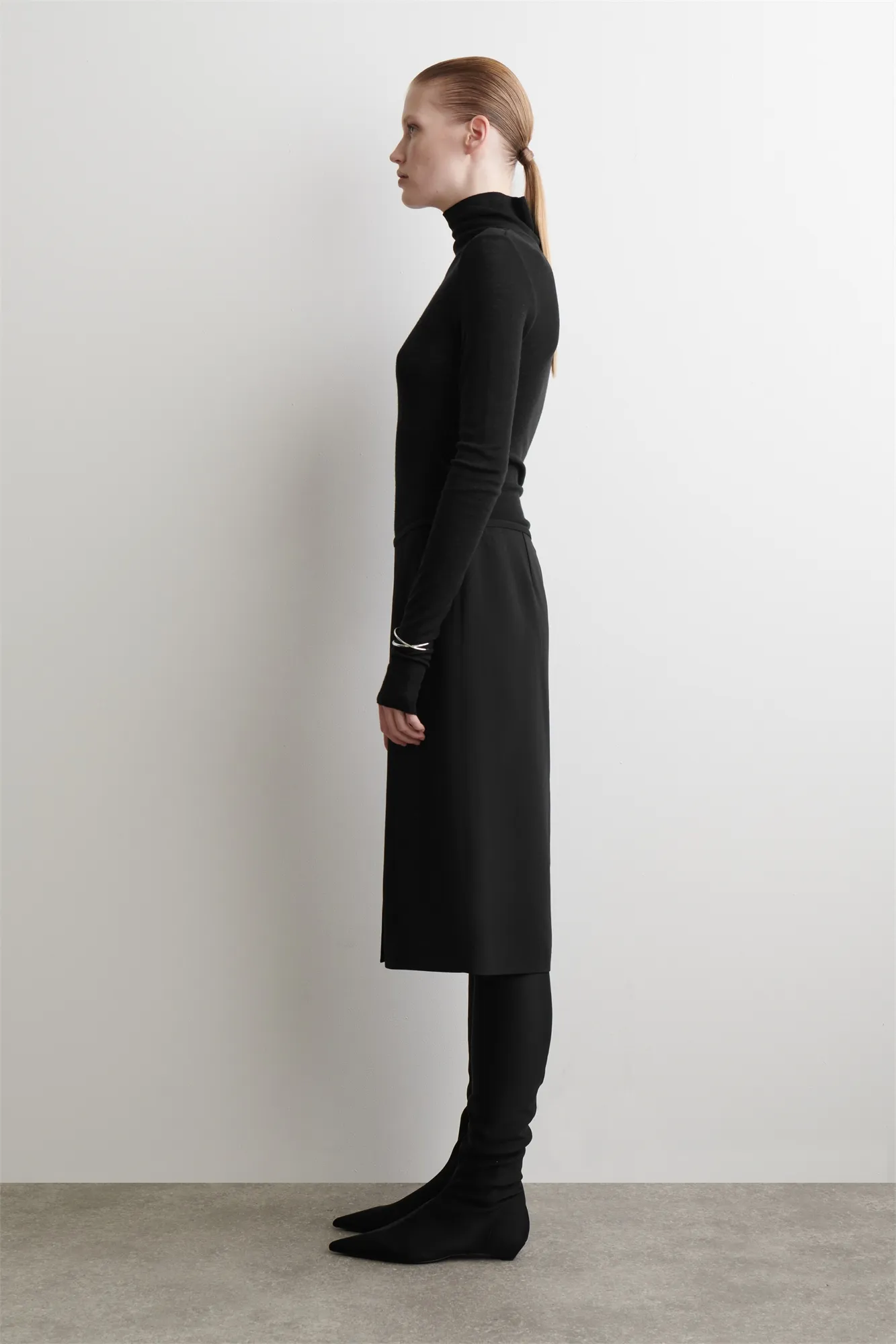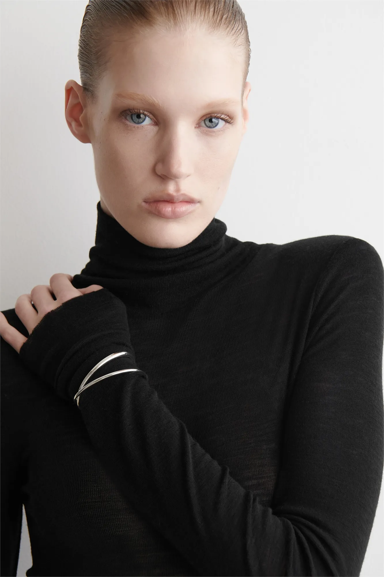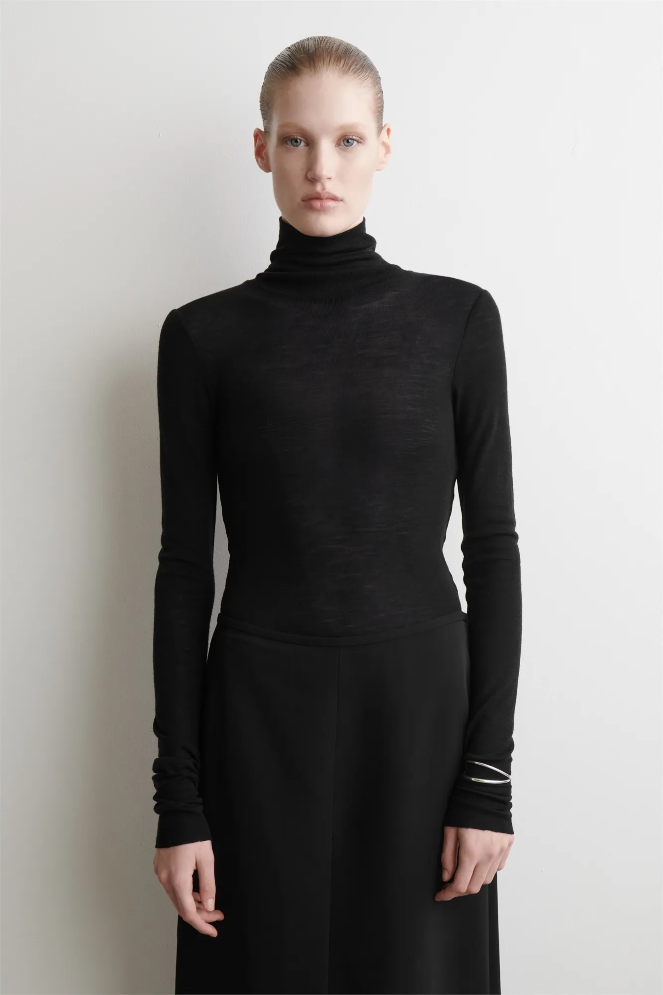 Эта классическая водолазка, выполнена из натуральной шерсти классического черного цвета с высоким воротником и облегающим кроем, идеально подходит для межсезонья.
