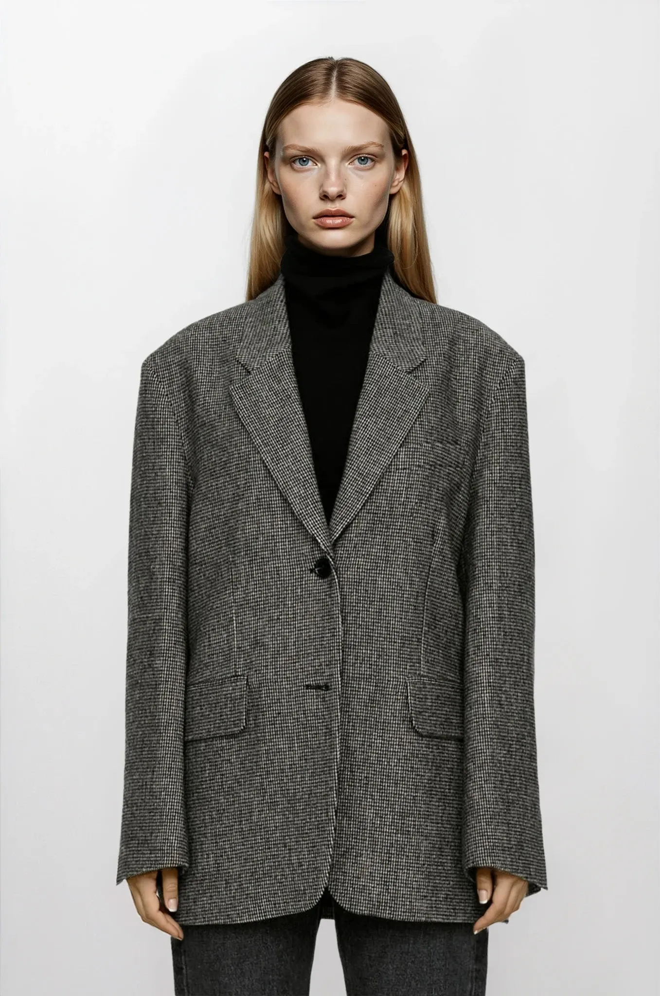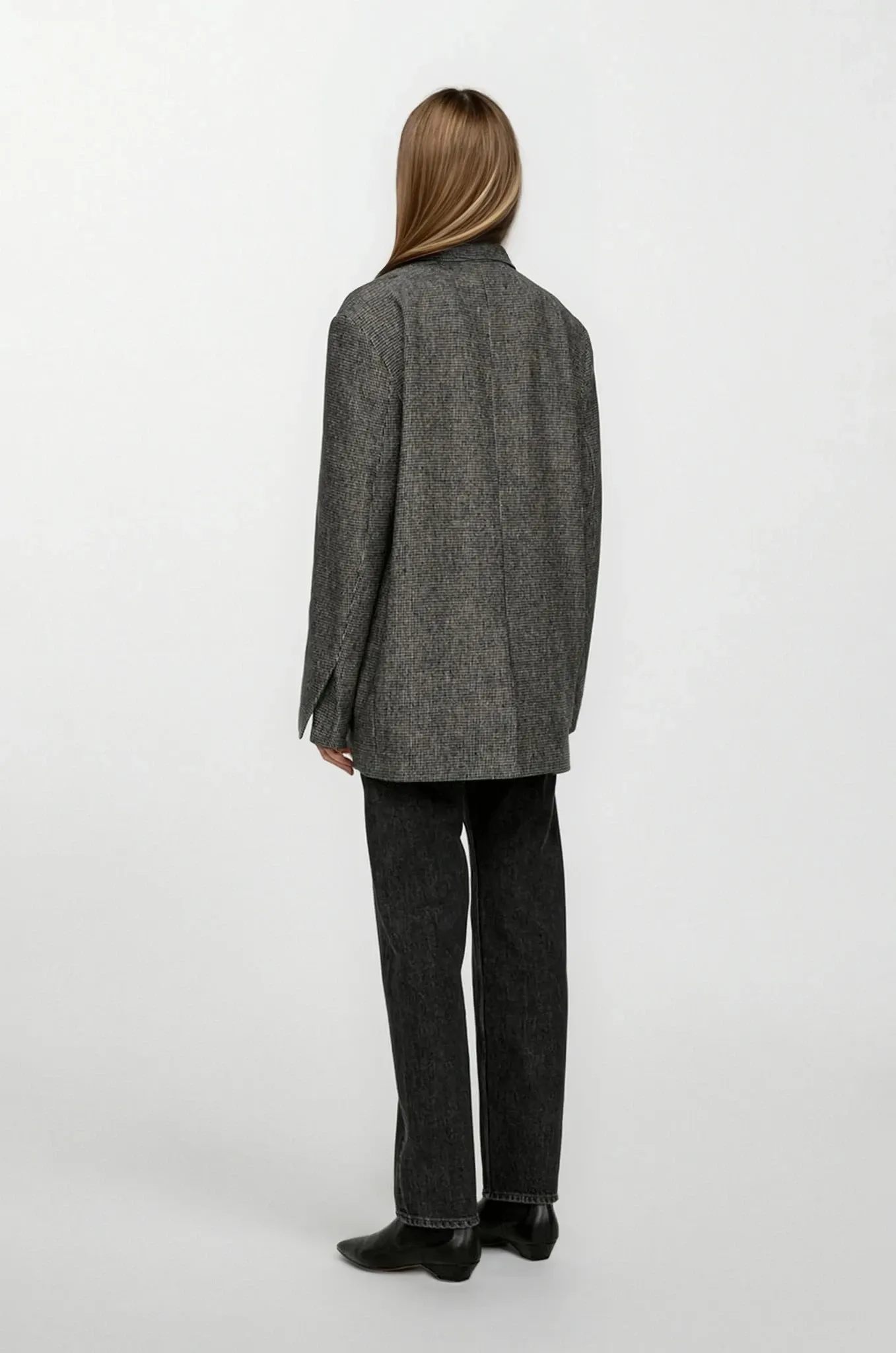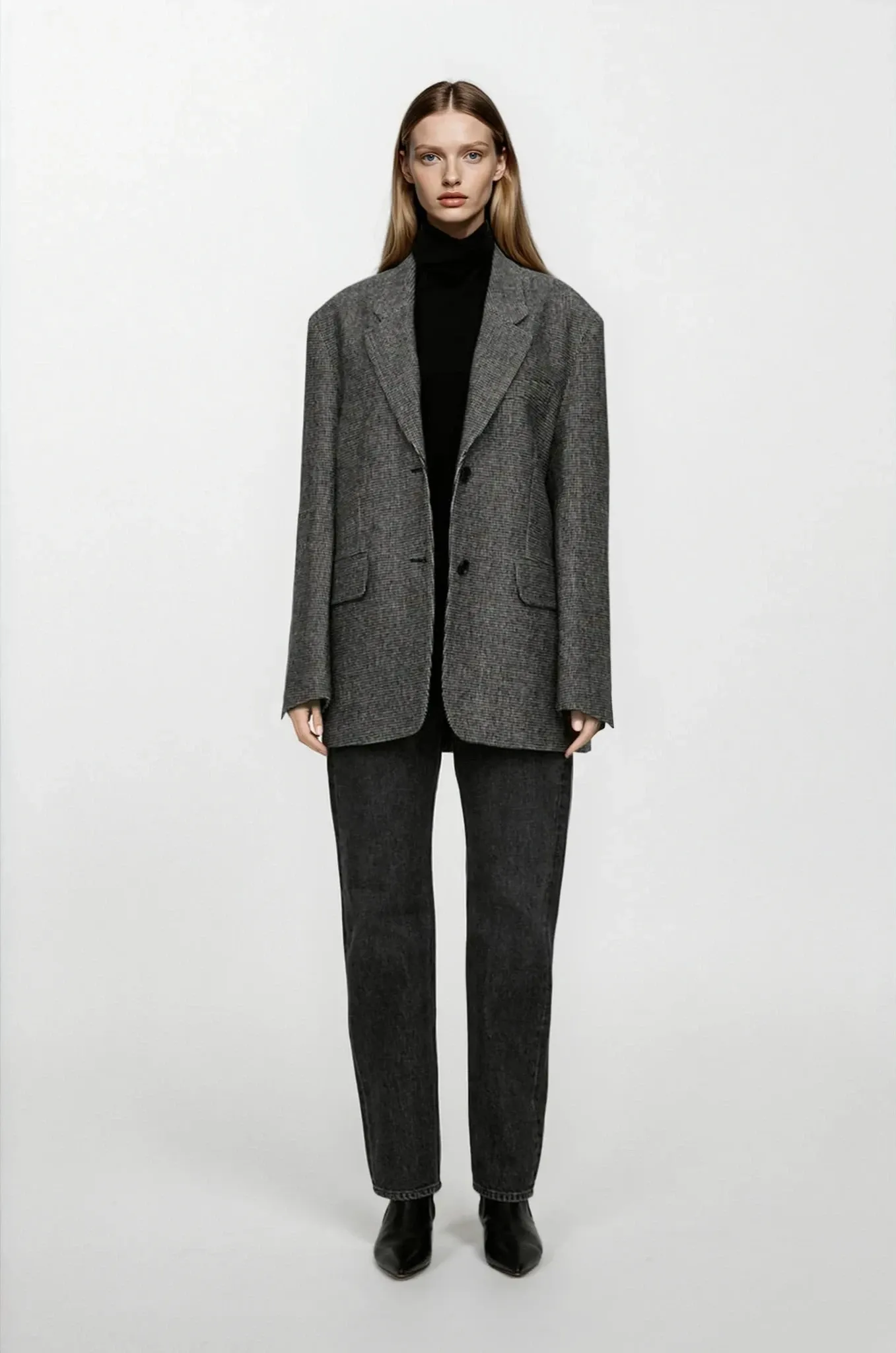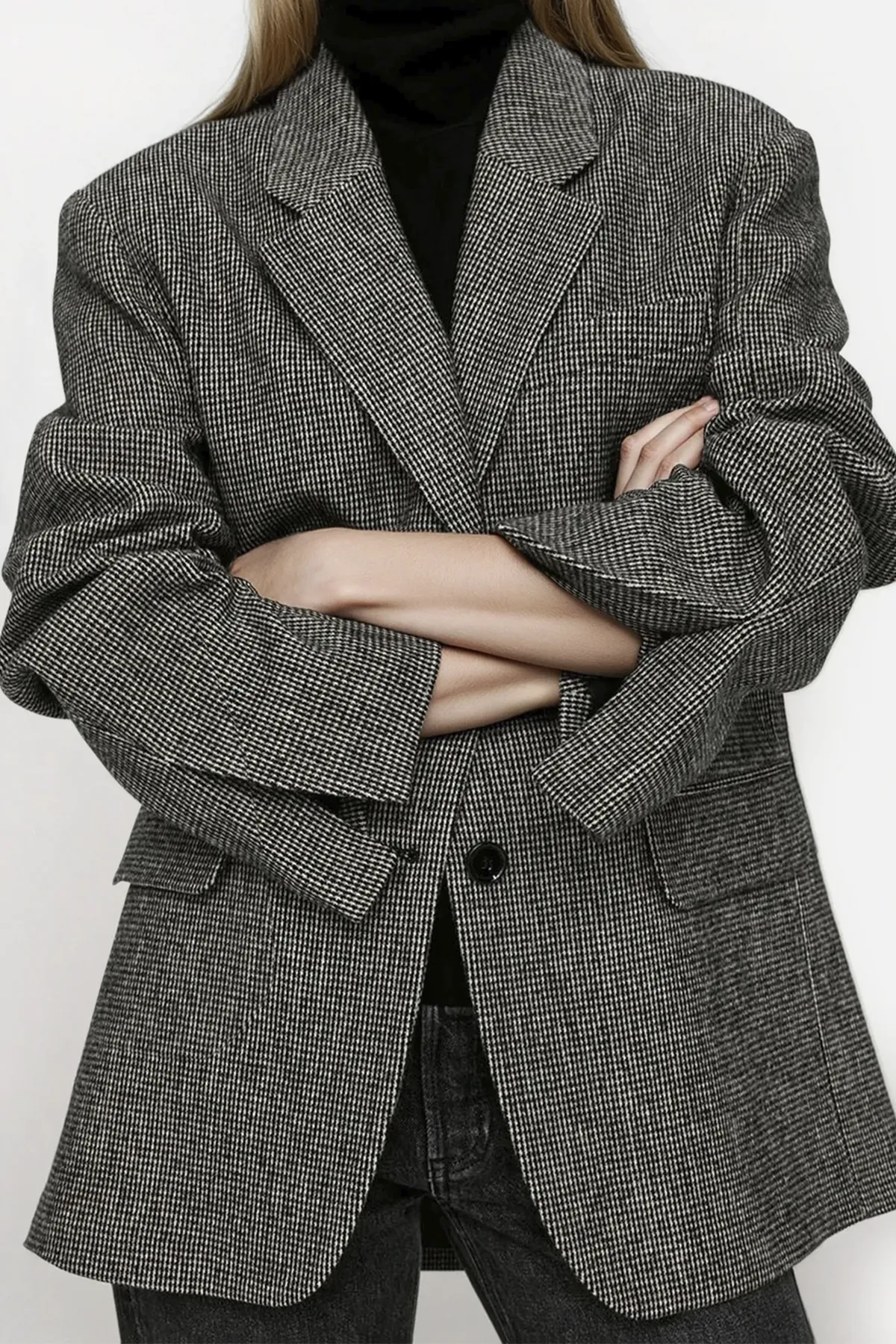 Однобортный пиджак с застежкой на пуговицы. Модель имеет прорезные карманы с клапанами спереди и прорезной карман на груди. С разрезом сзади.