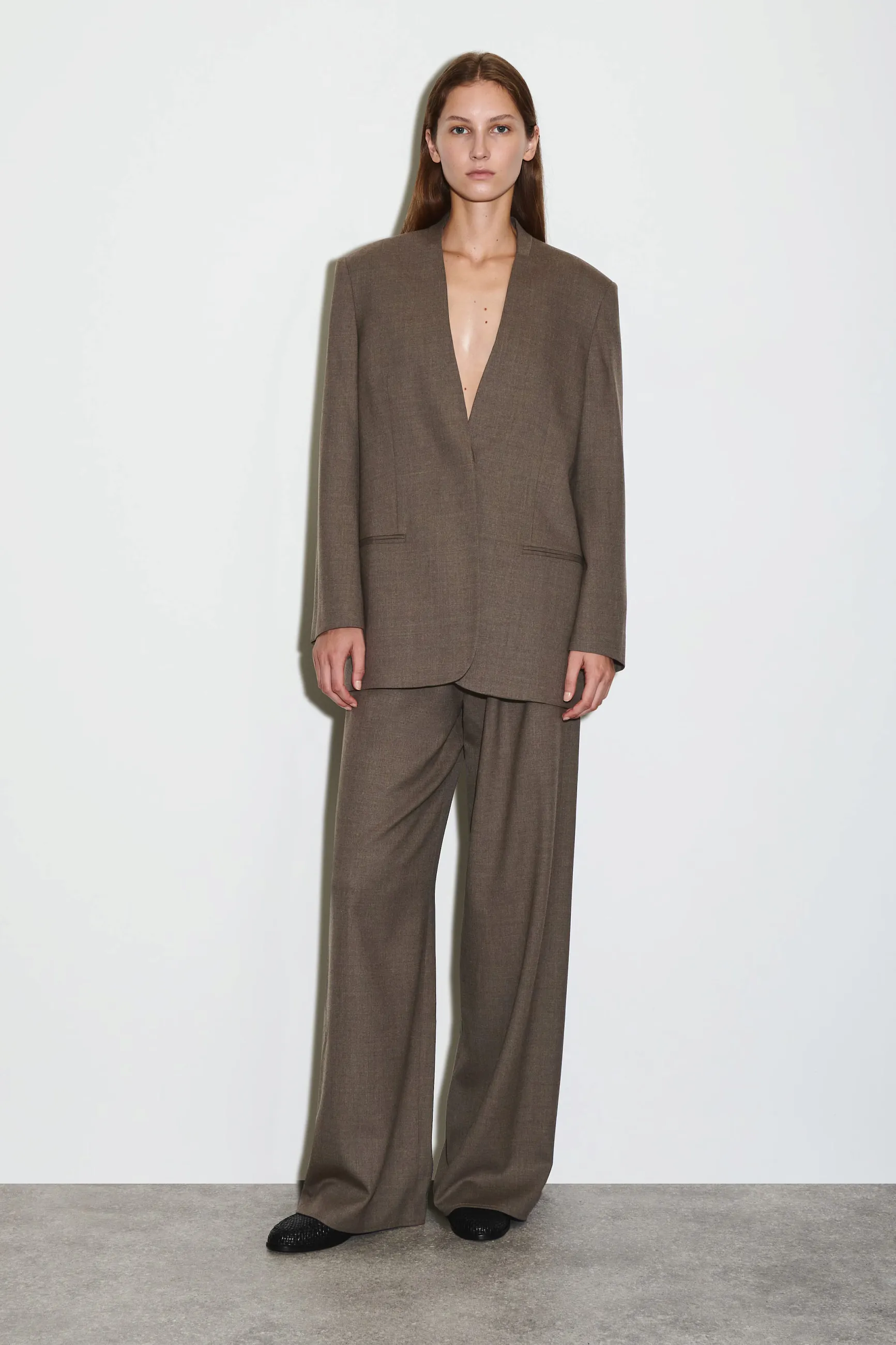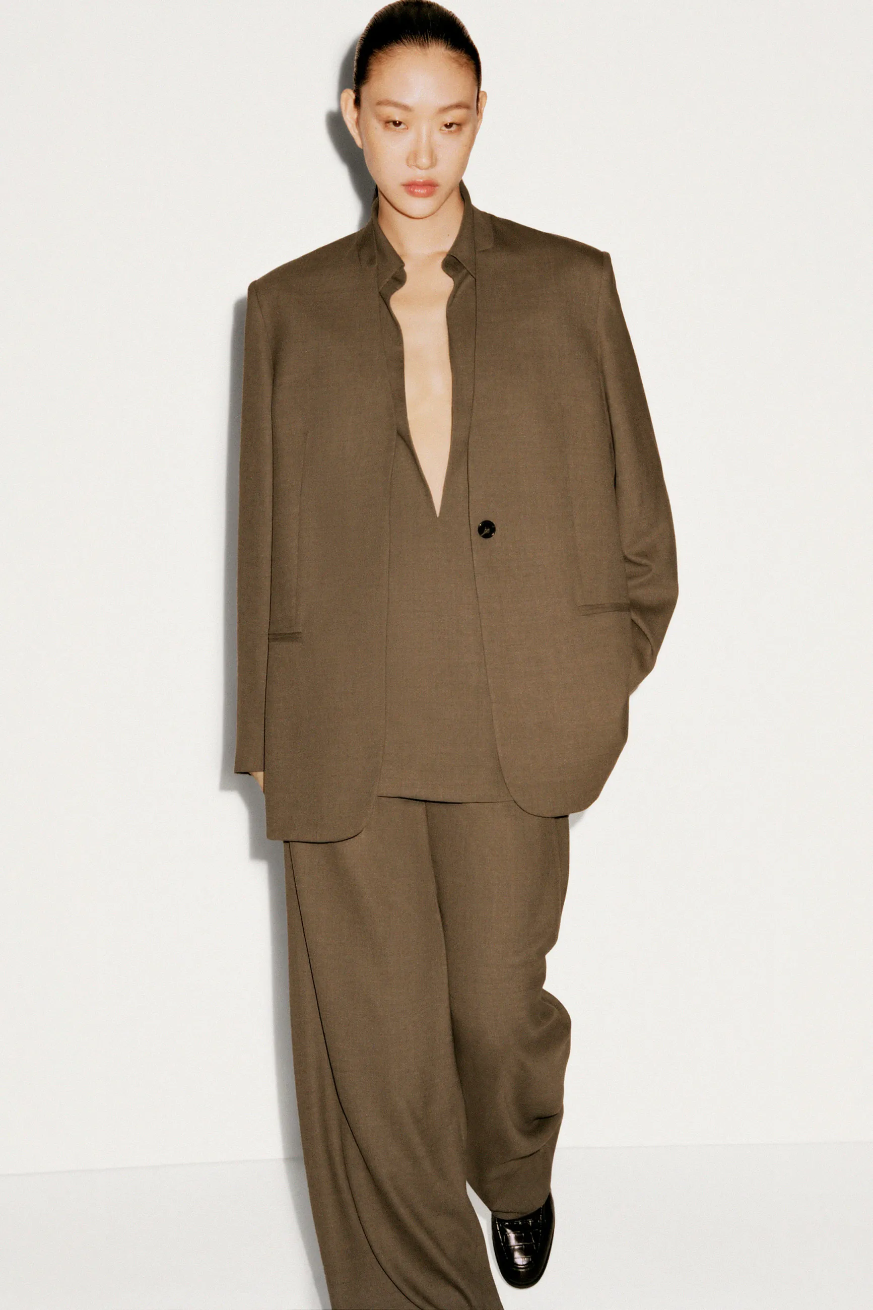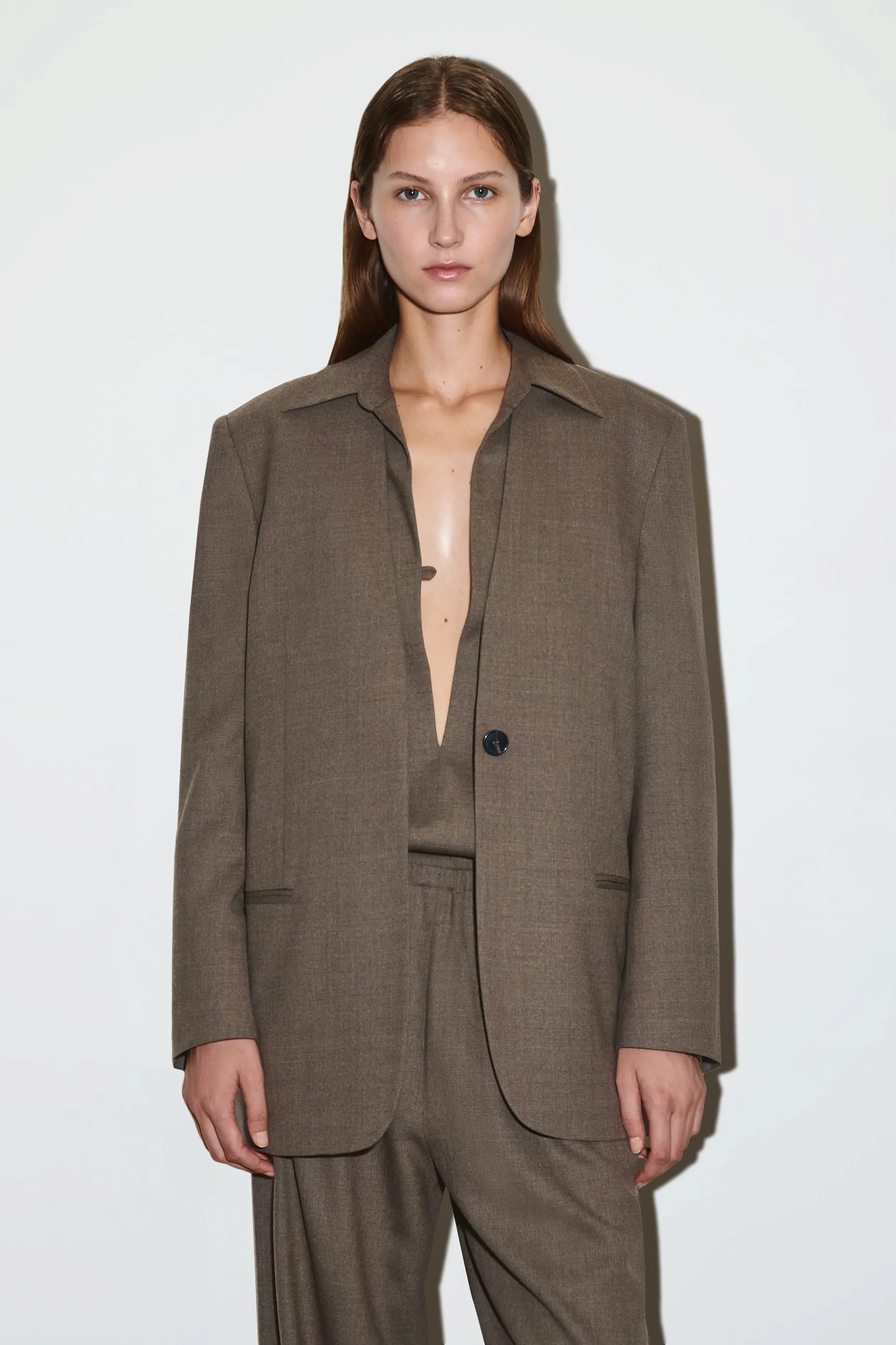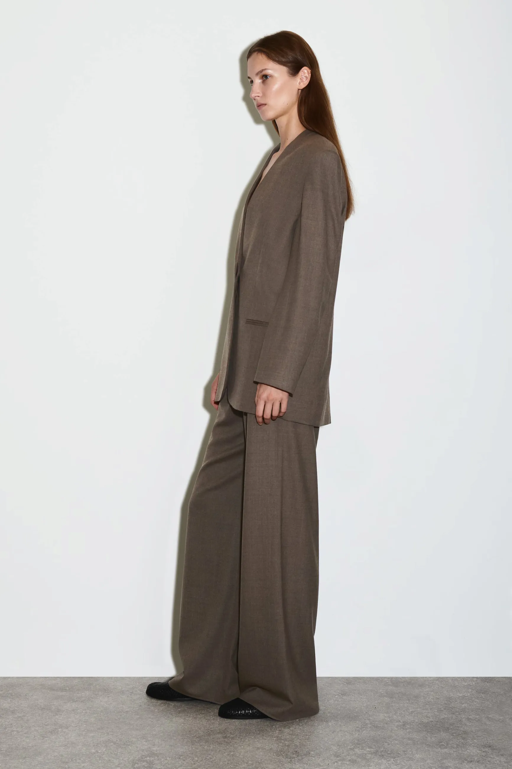 Коллекция классических моделей этого сезона отличается изысканными силуэтами и продуманными элементами дизайна. Этот элегантный пиджак без воротника из струящейся шерстяной ткани RWS отличается строгими вытачками и потайными пуговицами, что создаёт особенно сдержанный образ. Сочетайте его с подходящими брюками.