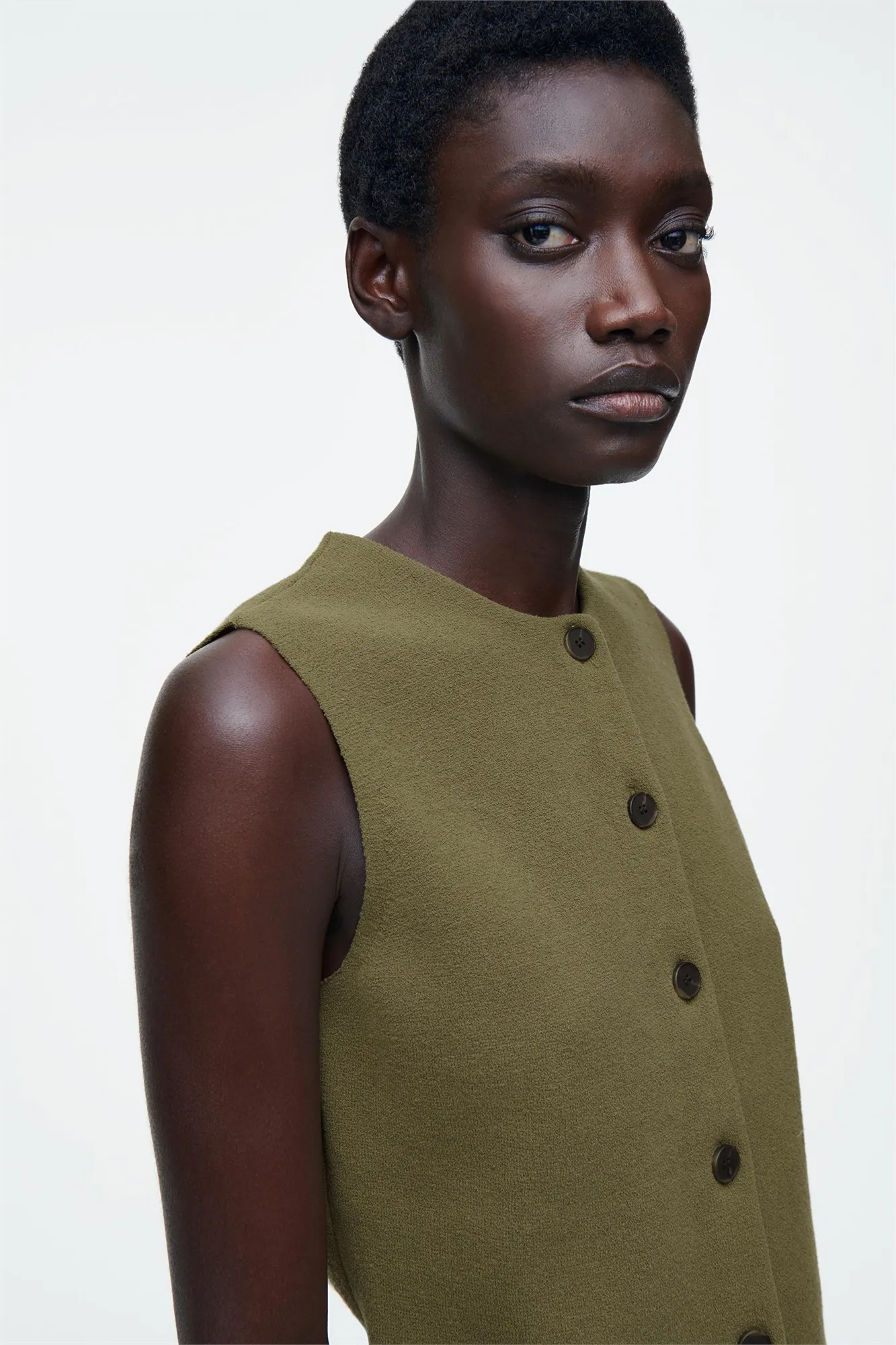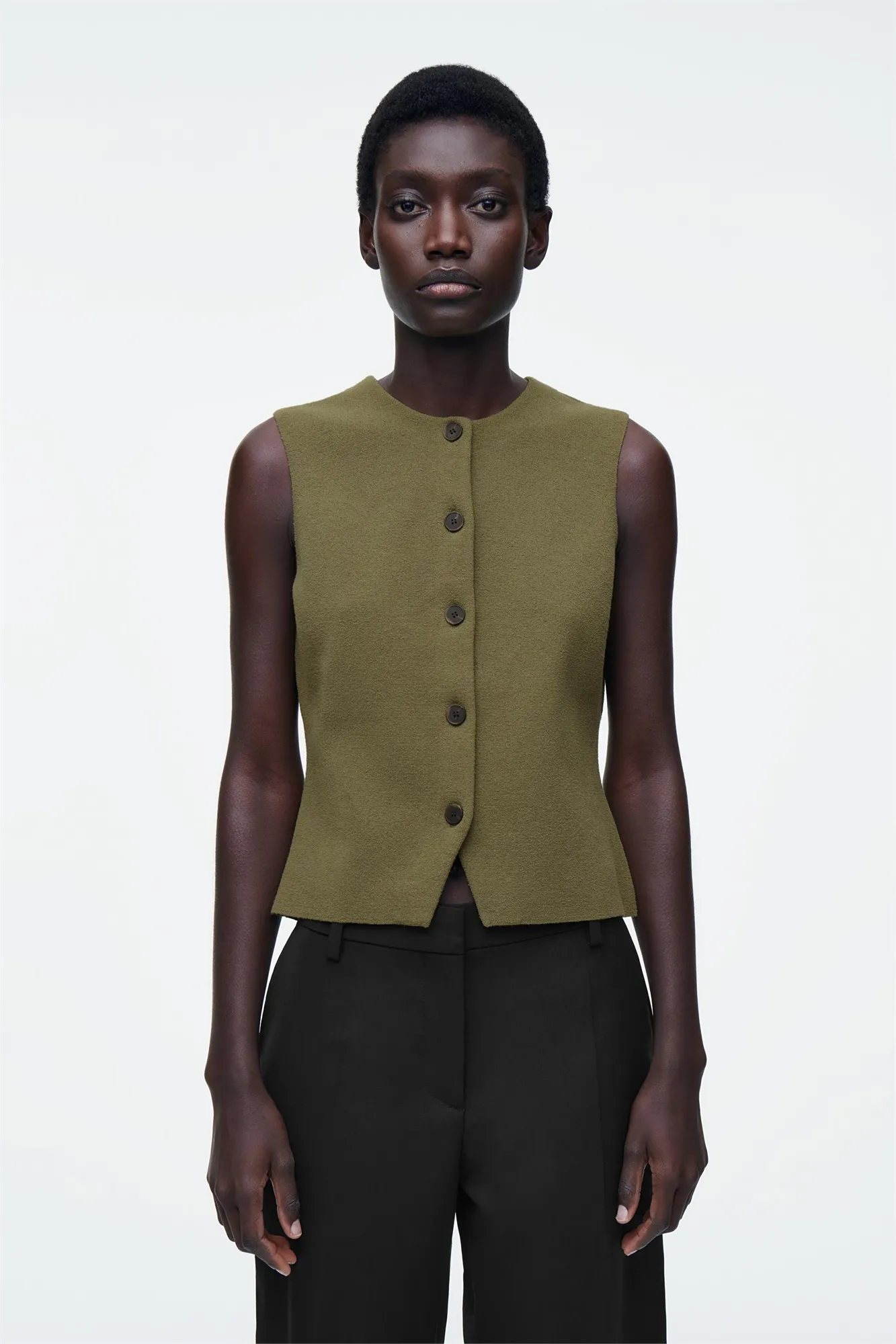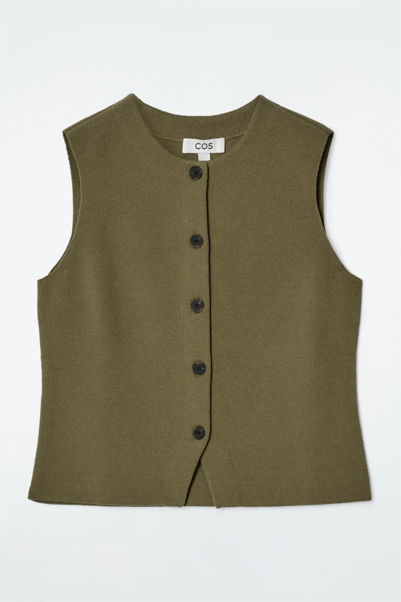 Коллекция одежды COS отличается чистотой линий и сдержанной простотой. Этот трикотажный жилет из хлопка оливкового цвета имеет круглую горловину и V-образный вырез по подолу. Сочетайте их с джинсами или брюками.