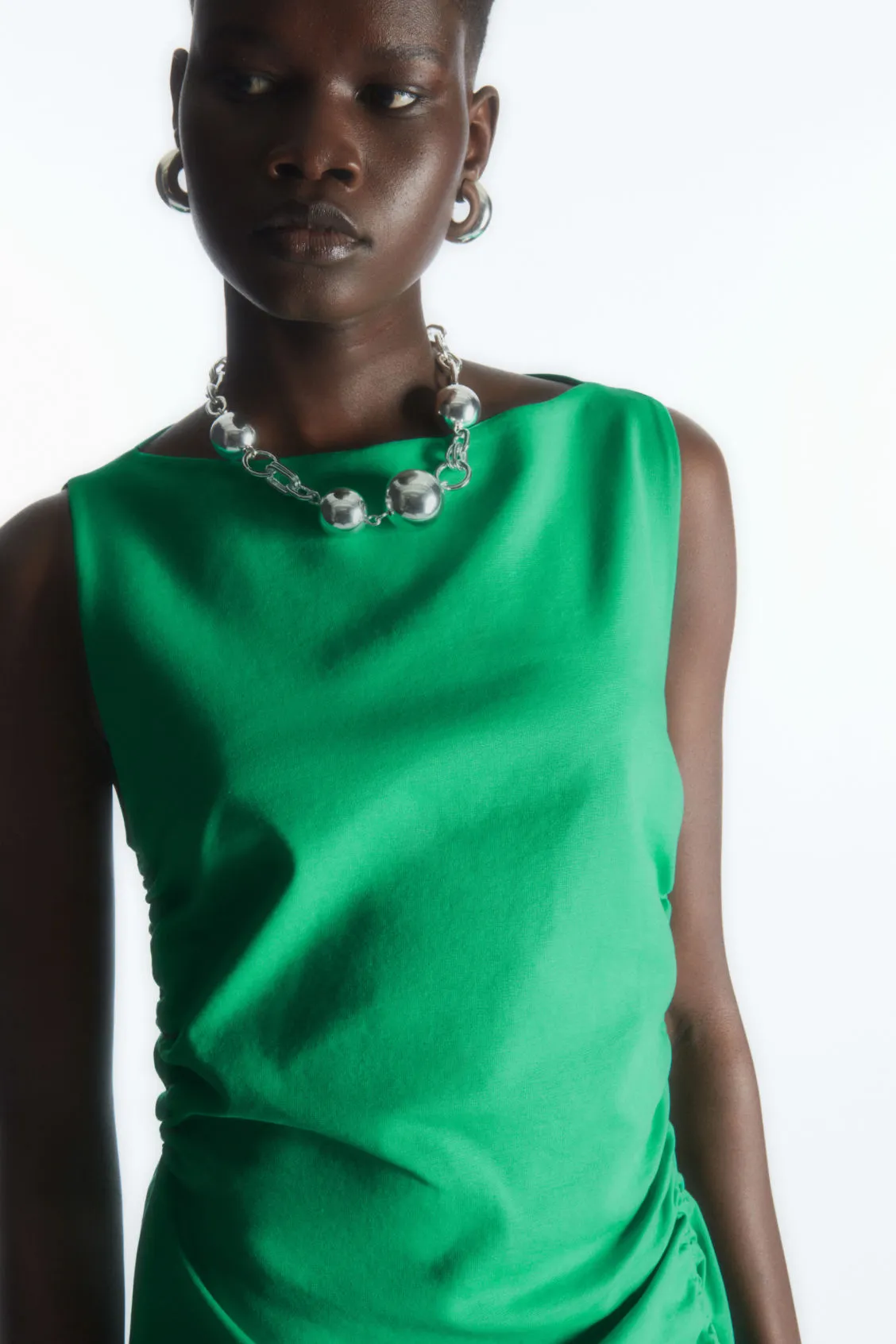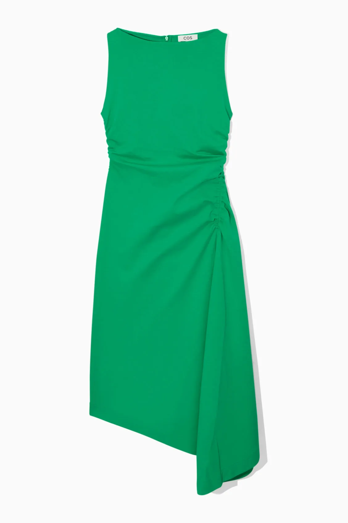 Силуэт этого платья перекликается с фирменным стилем из архивов COS. Созданное для того, чтобы подчеркнуть фигуру, оно имеет сборки на бедрах, которые создают мягкие рюши, изящный вырез лодочкой и асимметричный низ. Оно изготовлено из дышащей хлопчатобумажной смеси, что делает его естественным выбором для солнечных дней.