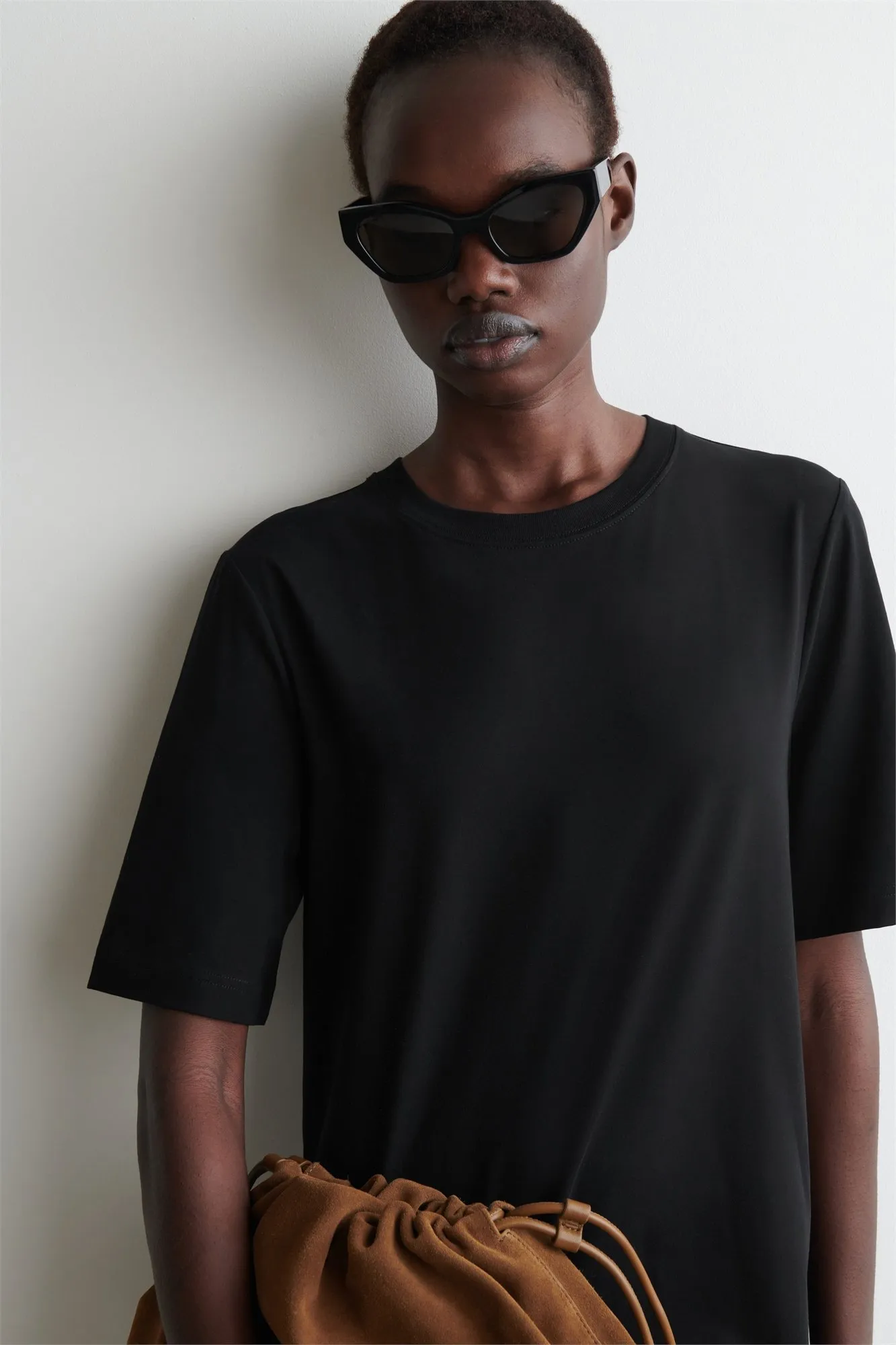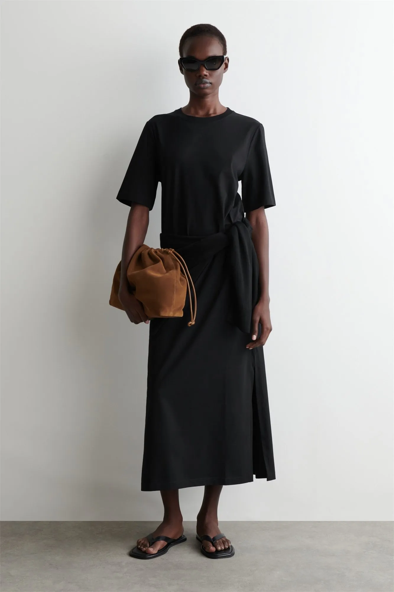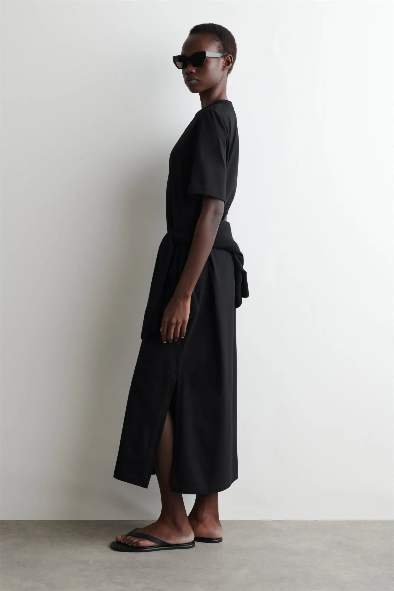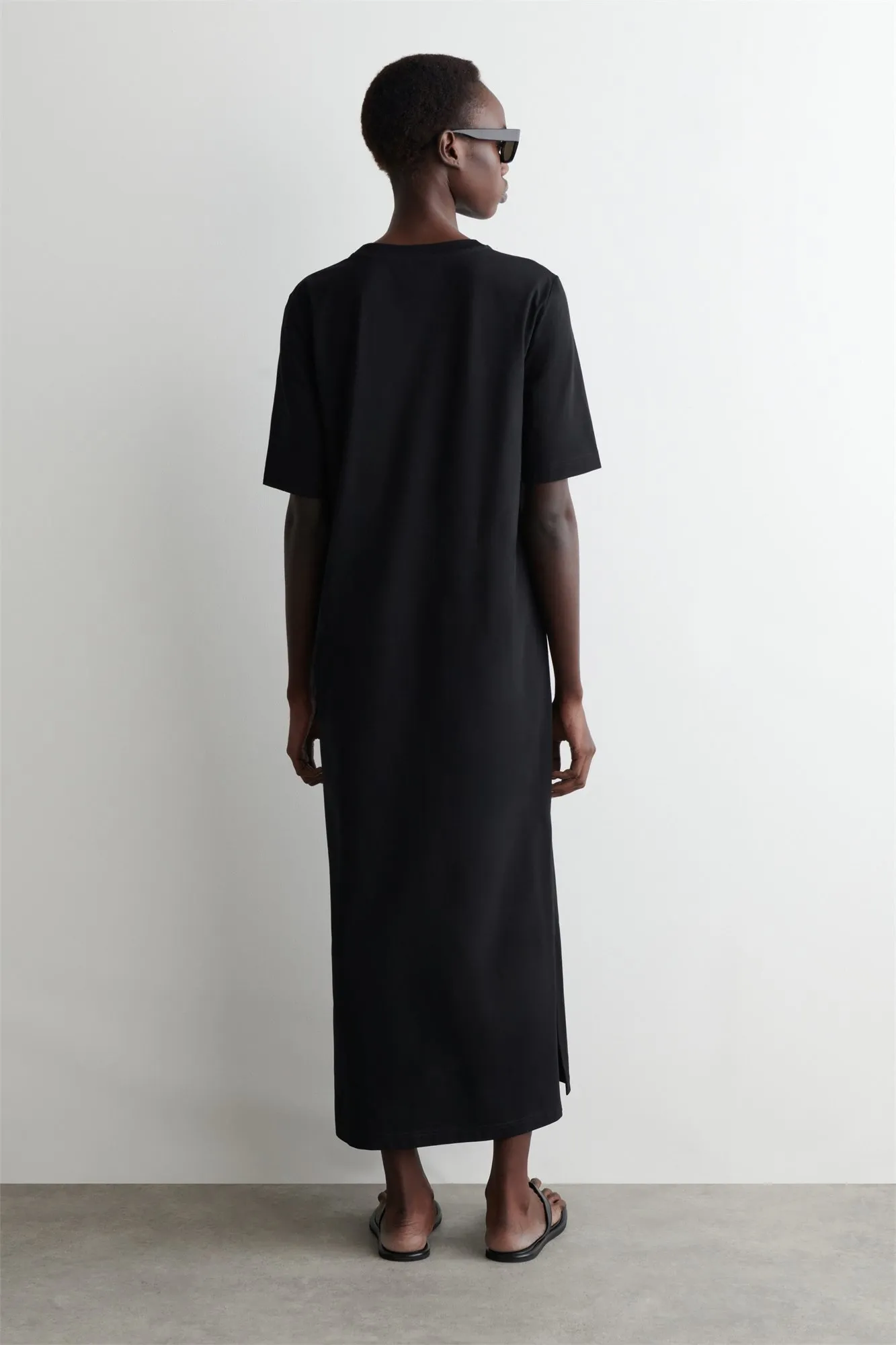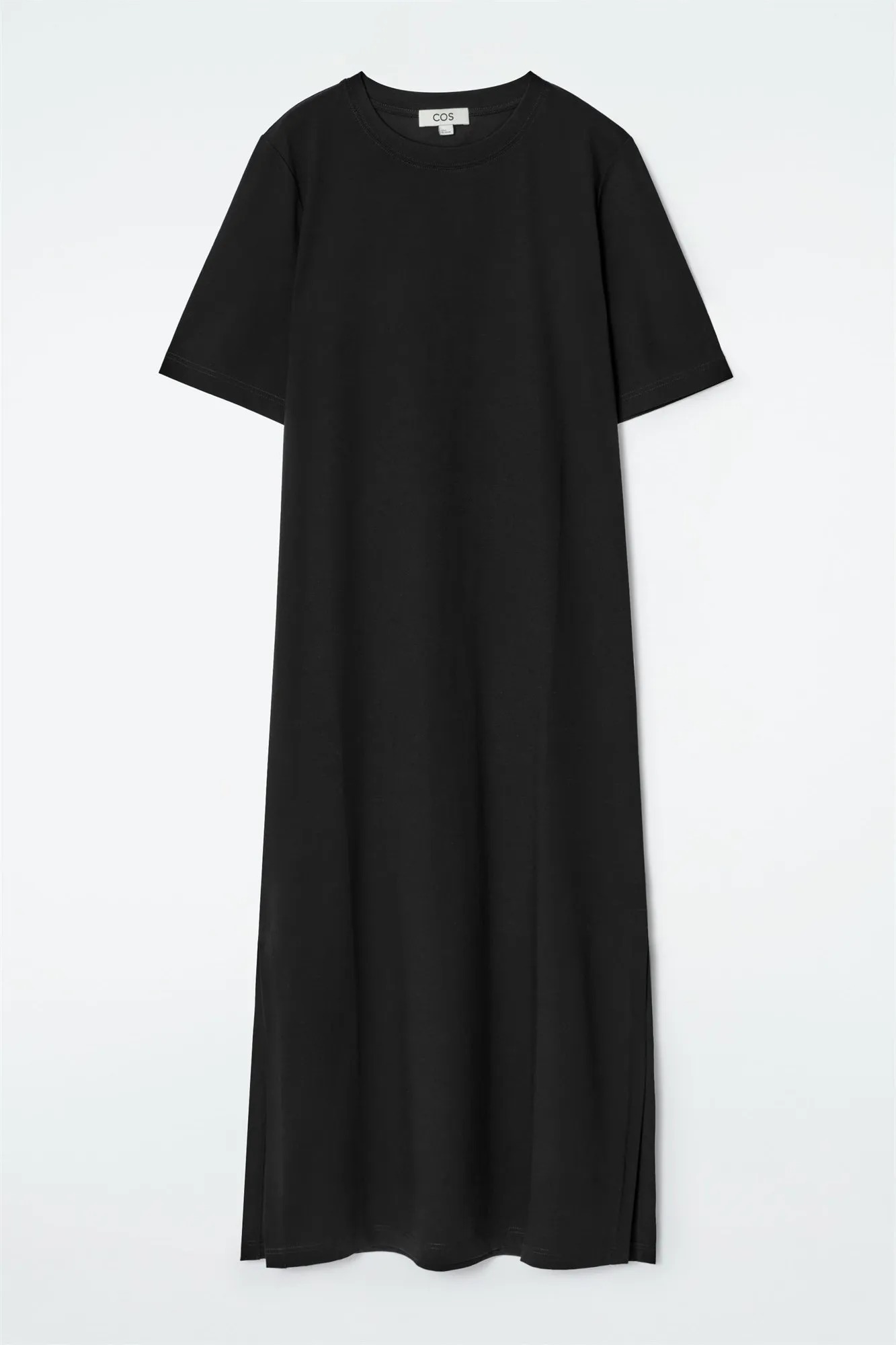 Это платье-футболка из мягкого, дышащего хлопка станет идеальным выбором для мягкой погоды. Модель длины миди черного цвета имеет круглую горловину и удлиненные разрезы по бокам.