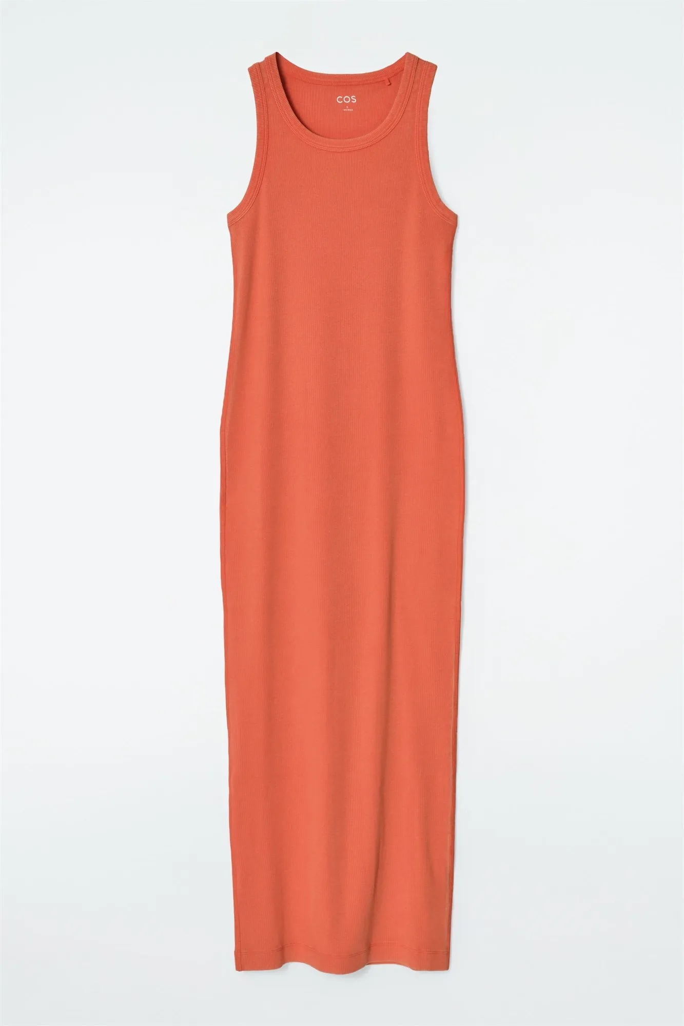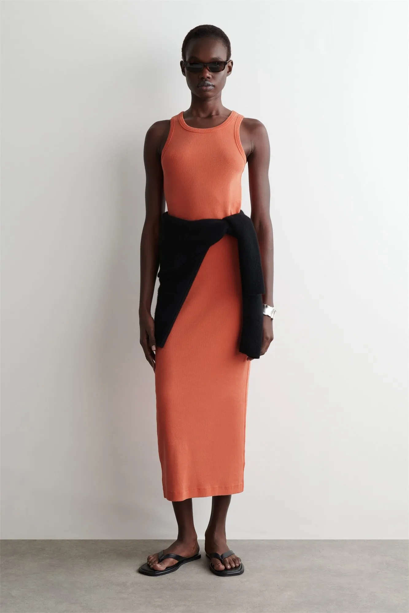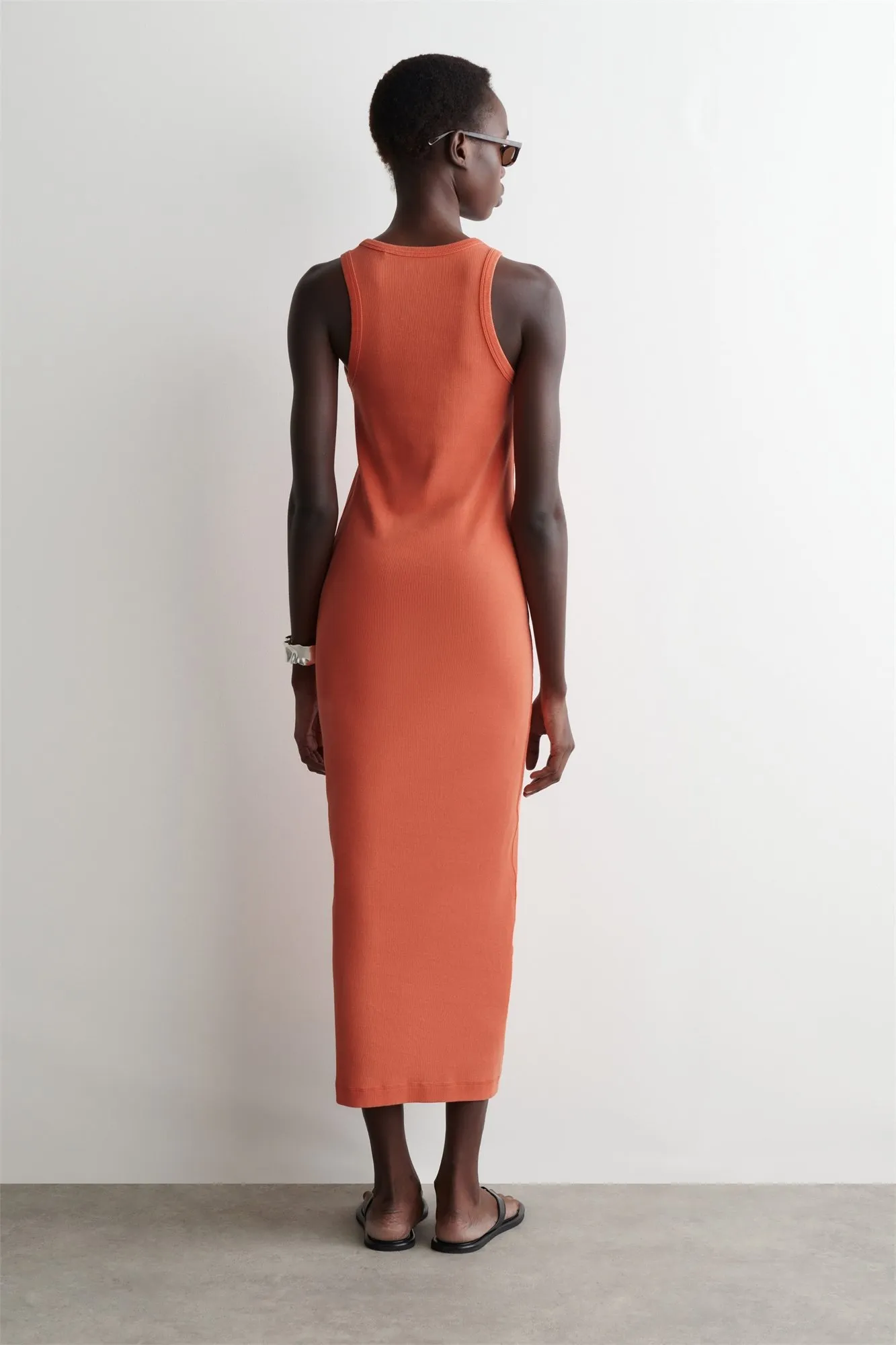 Это платье без рукавов — универсальный выбор для теплых месяцев. Модель с круглым вырезом выполнена в ярко-оранжевом цвете из органического хлопка с добавлением эластичного материала. Облегающий крой подчеркнет ваш силуэт.