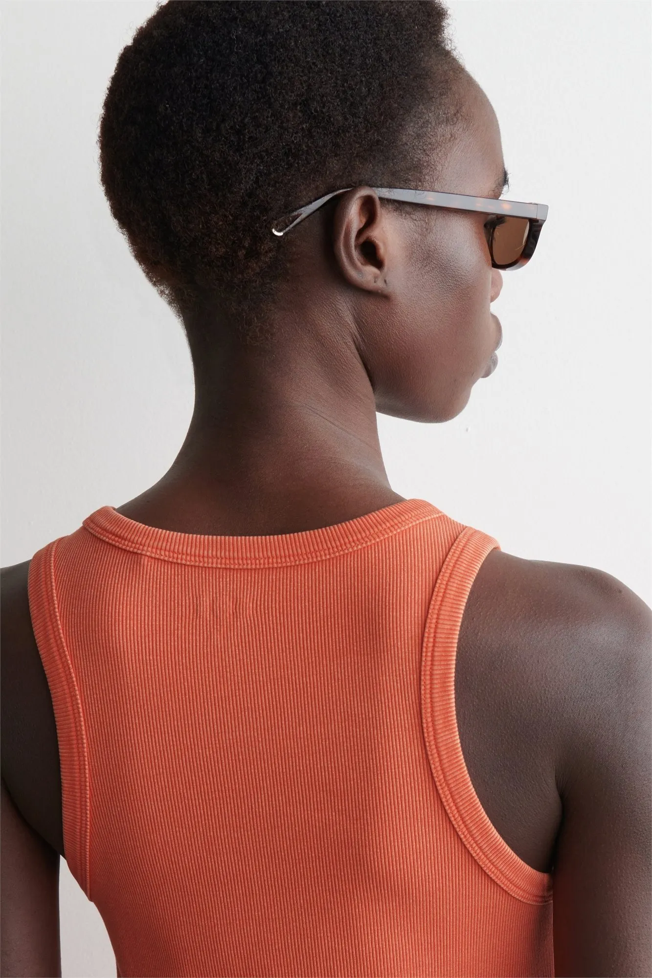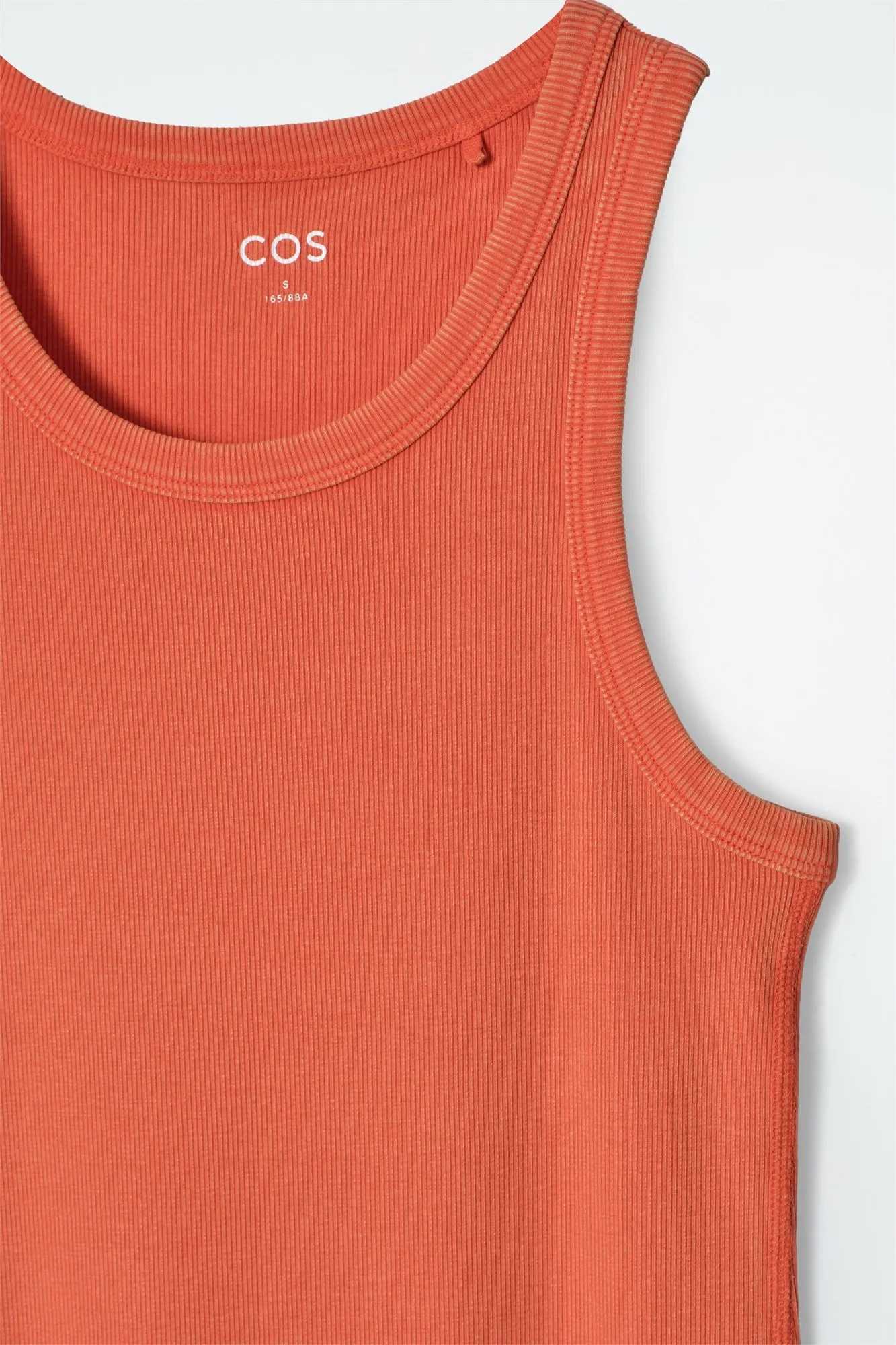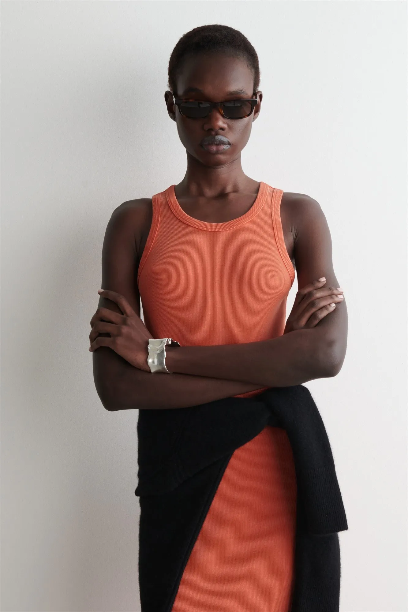 Это платье без рукавов — универсальный выбор для теплых месяцев. Модель с круглым вырезом выполнена в ярко-оранжевом цвете из органического хлопка с добавлением эластичного материала. Облегающий крой подчеркнет ваш силуэт.