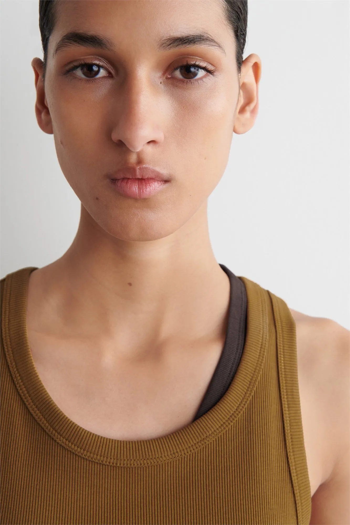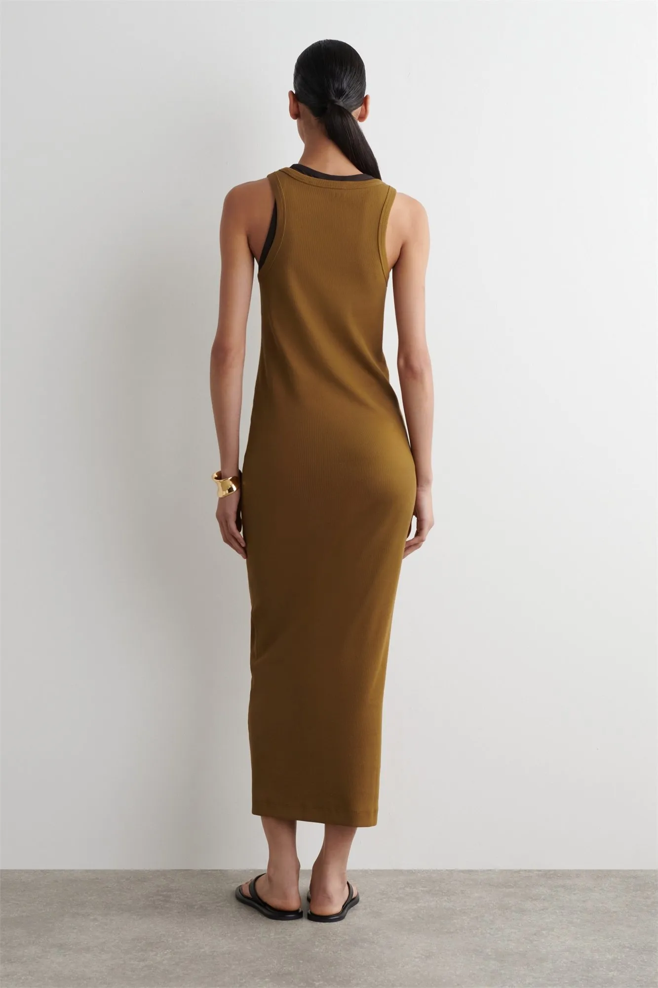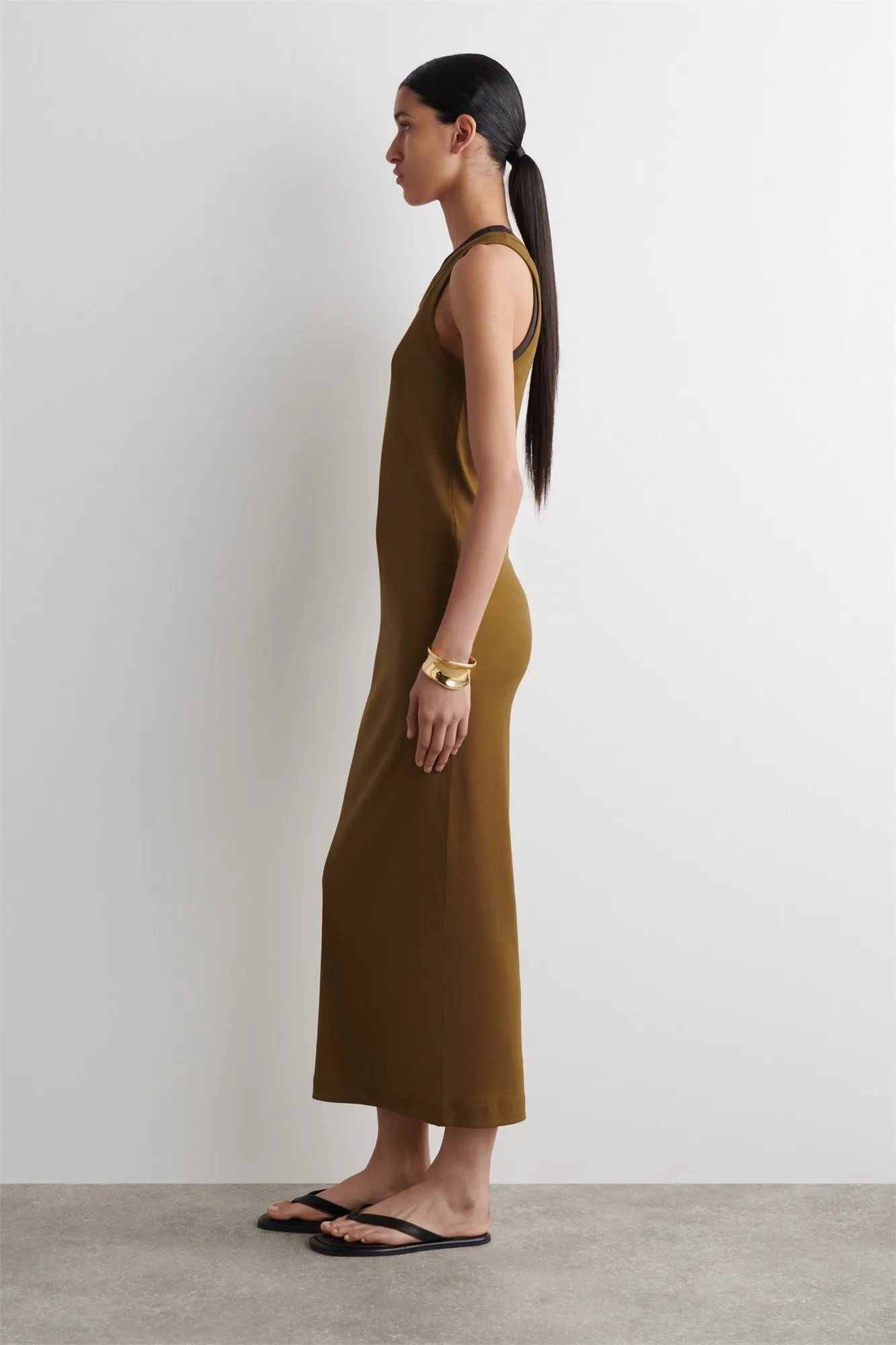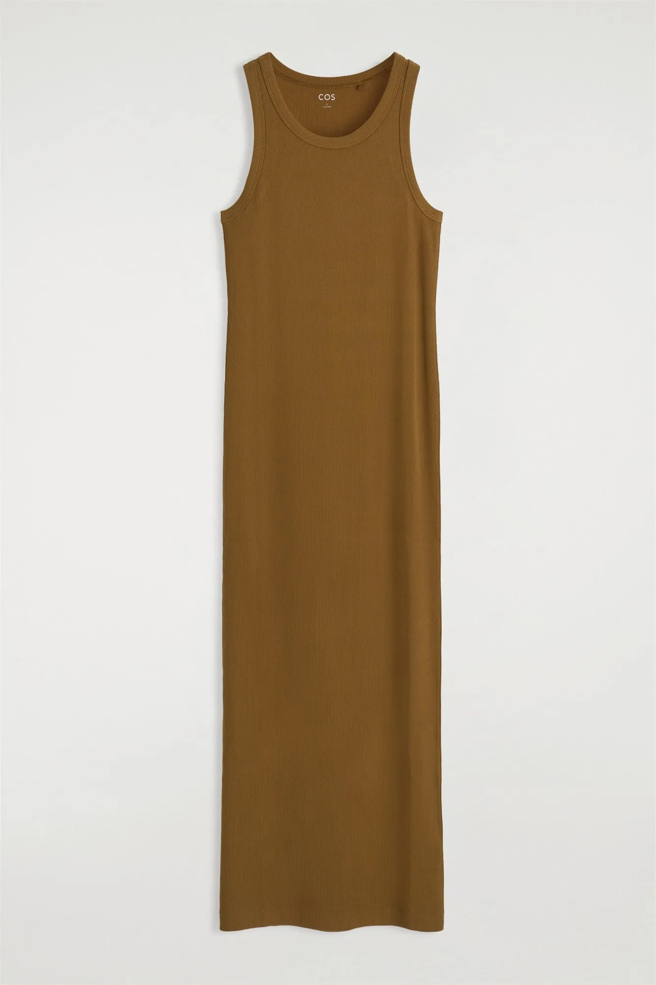 Это платье без рукавов — универсальный выбор для теплых месяцев. Модель с круглым вырезом выполнена в цвете охры из органического хлопка с добавлением эластичного материала. Облегающий крой подчеркивает ваш силуэт