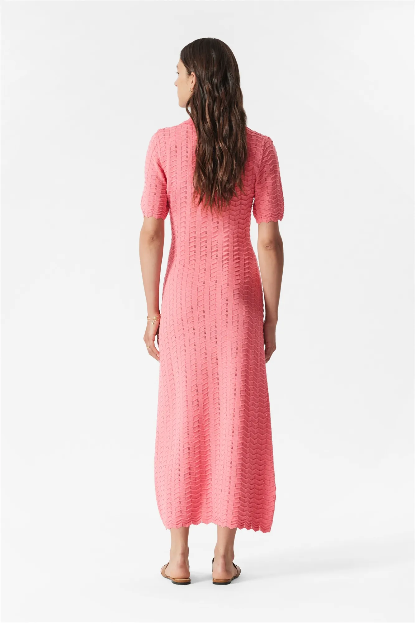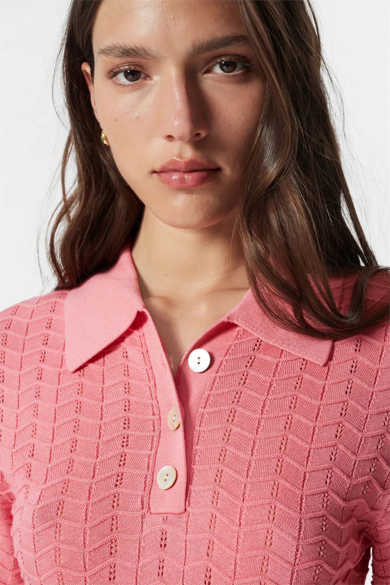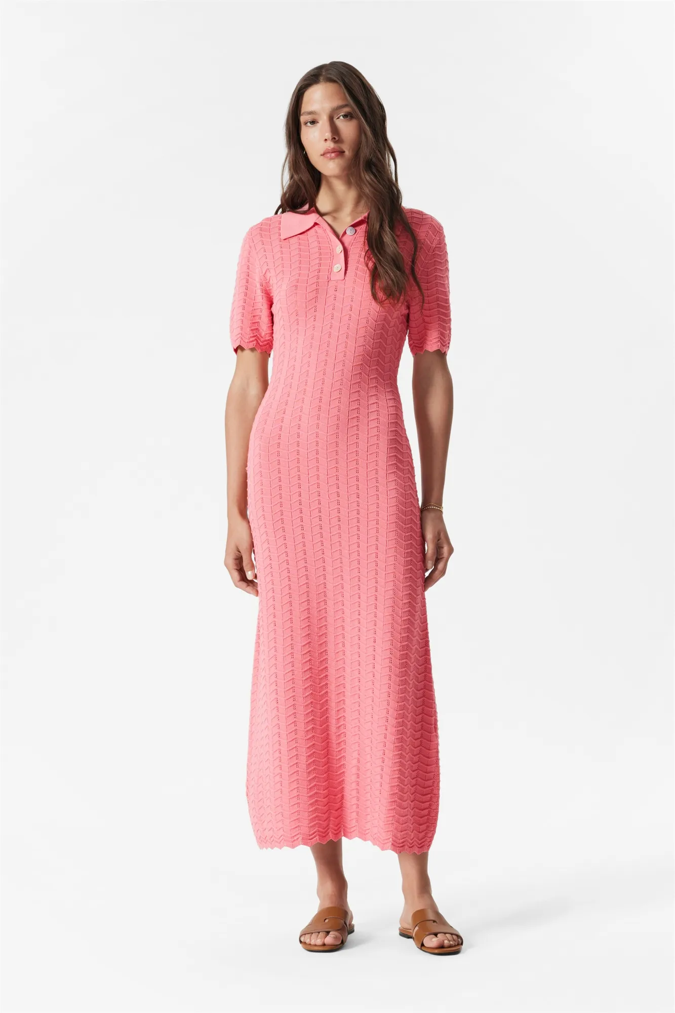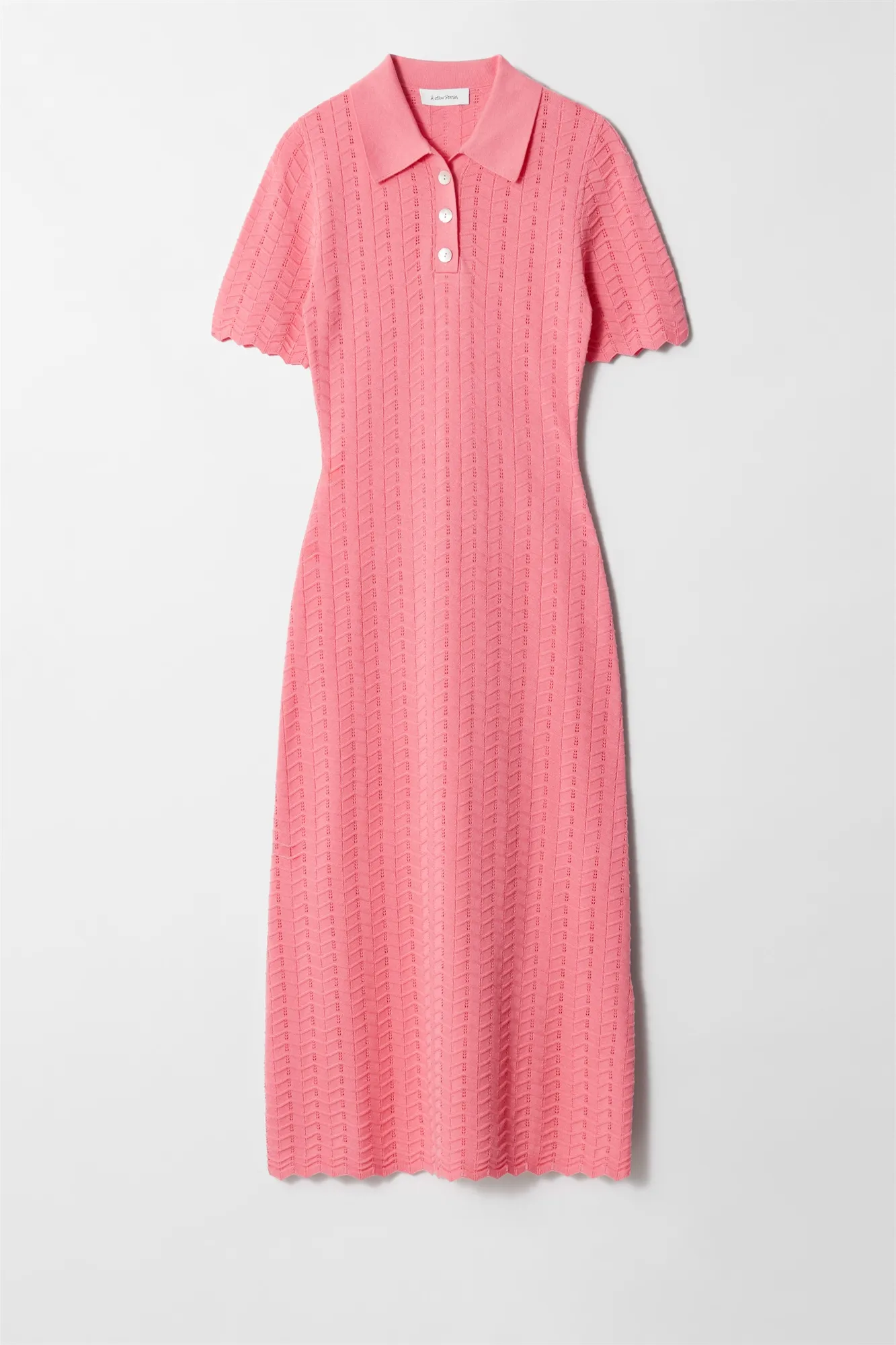 Это платье миди выполнено из мягкой эластичной хлопковой ткани ажурной вязки. Оно имеет облегающий силуэт с классическим воротником, планкой на пуговицах и короткими рукавами. Платье украшено декоративными фестончатыми краями.