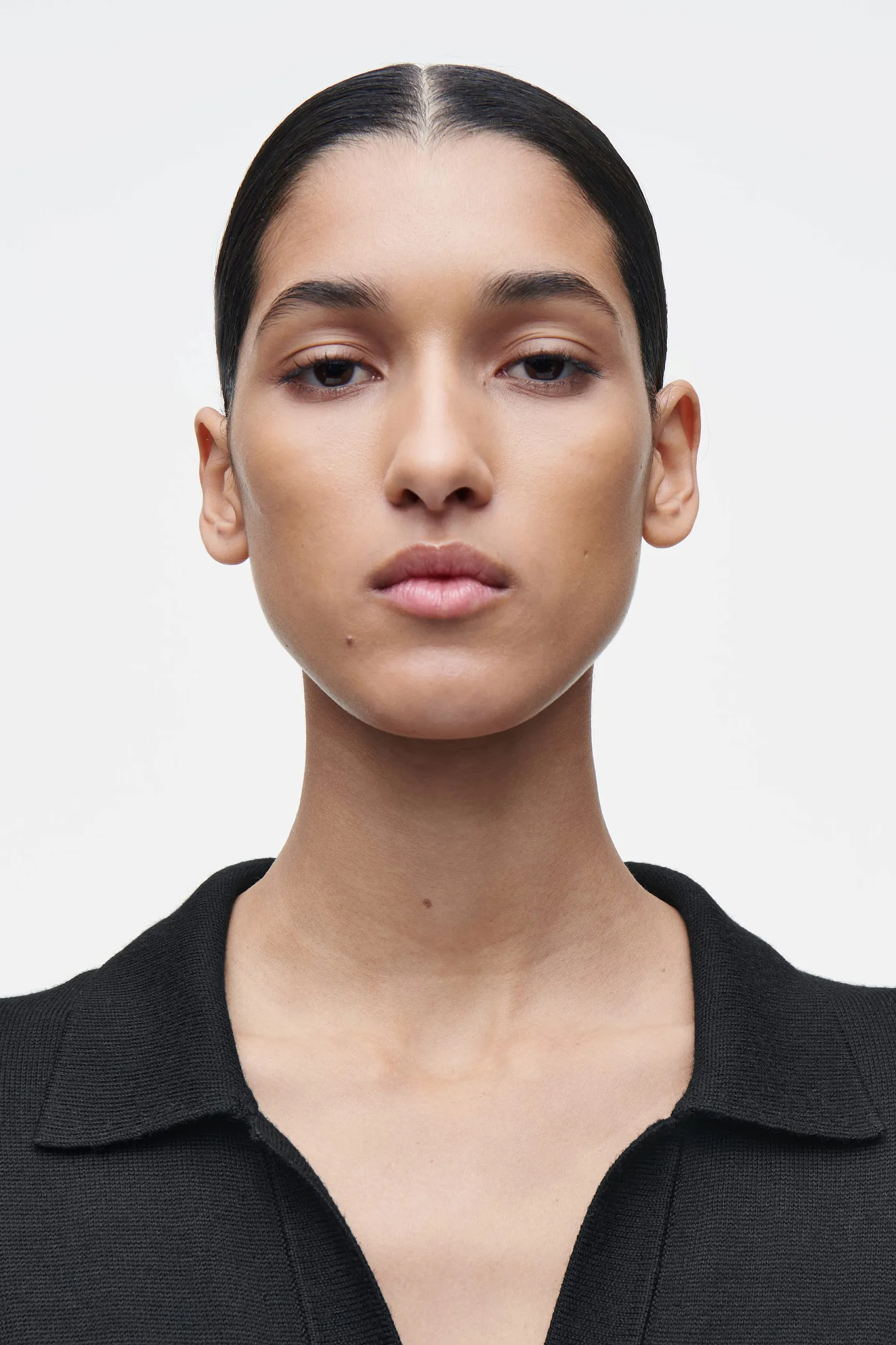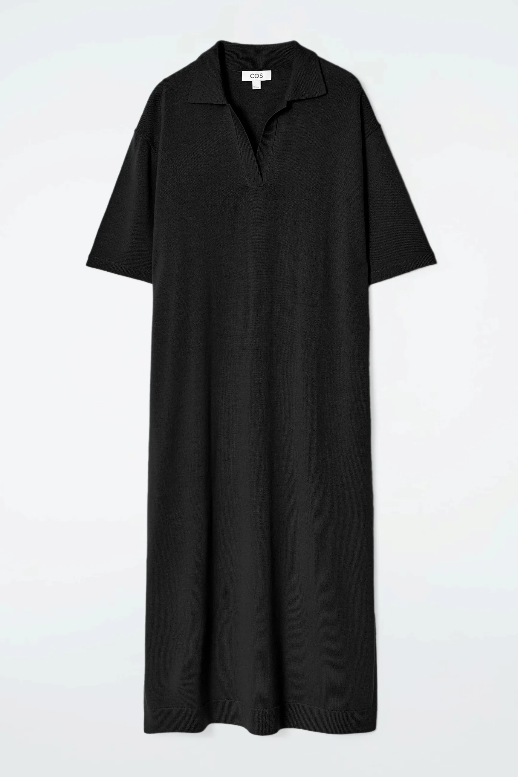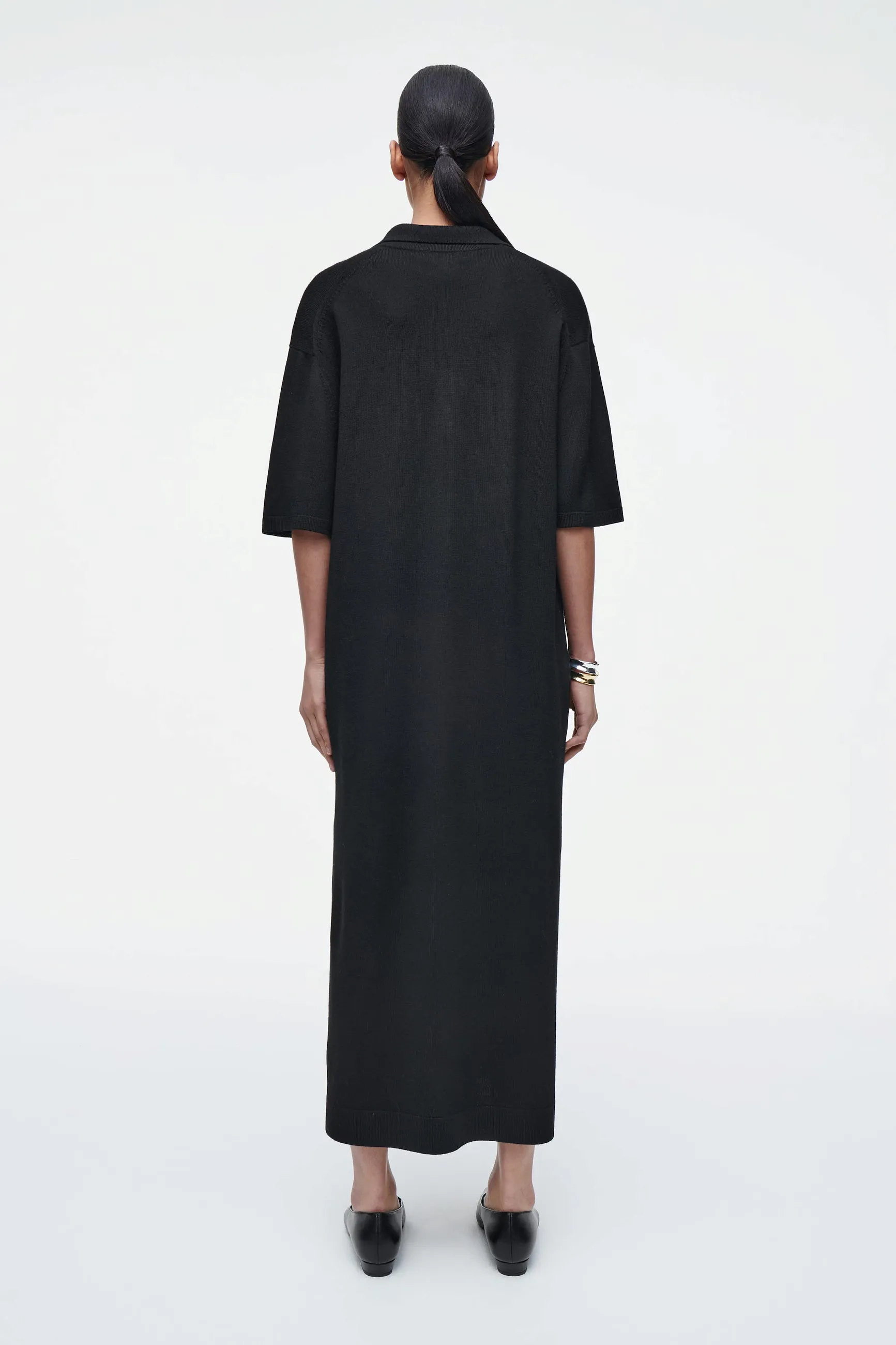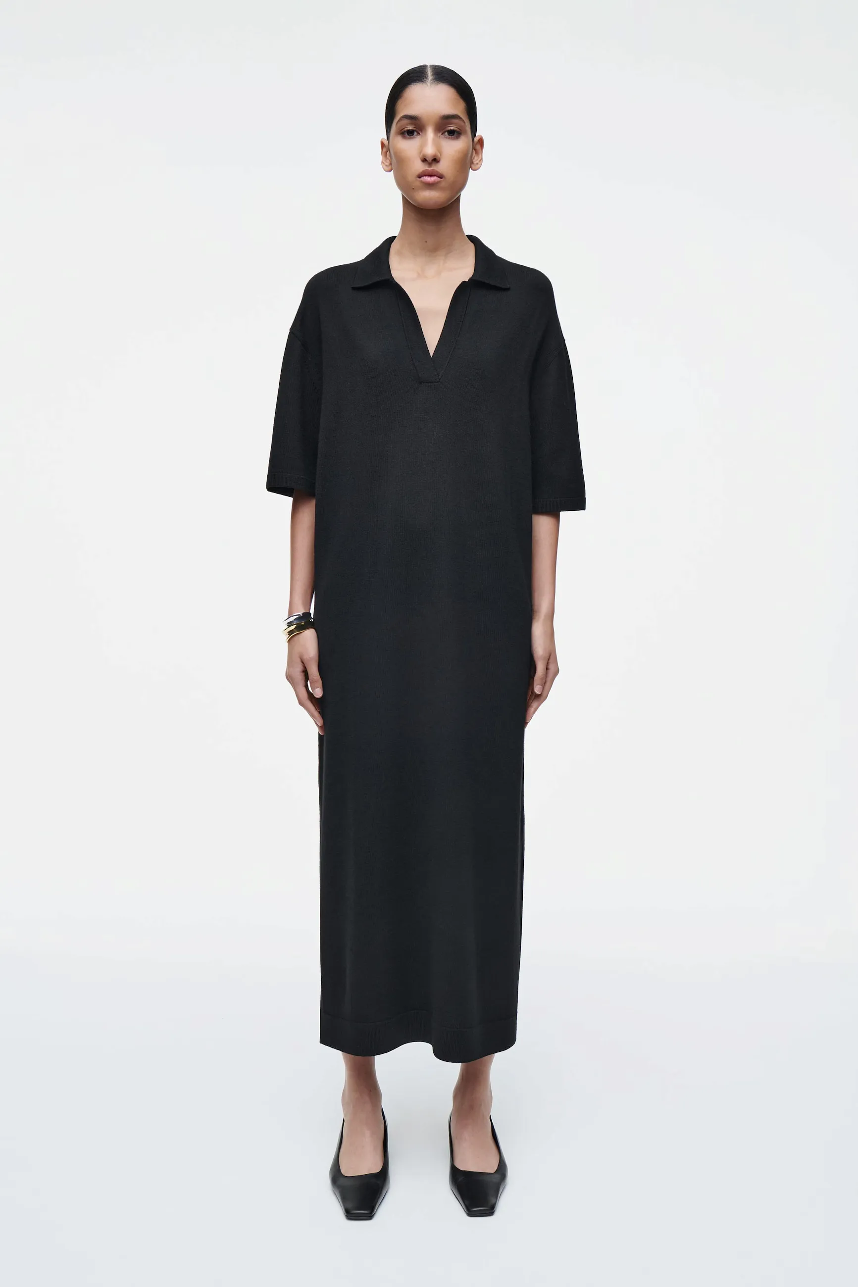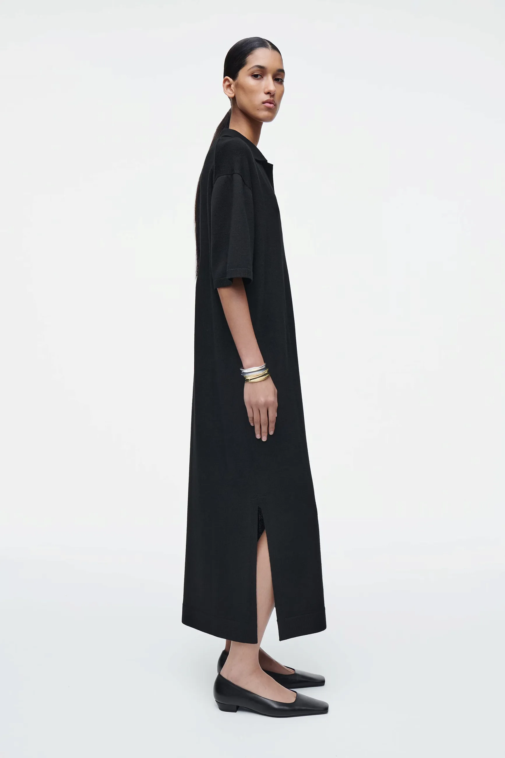 Это элегантное платье-поло в спортивном стиле — идеальный выбор для повседневных образов. Платье выполнено из ультралёгкой шерсти NATIVA™ классического чёрного цвета. Оно имеет открытый воротник, короткие рукава и широкий подол с разрезом.