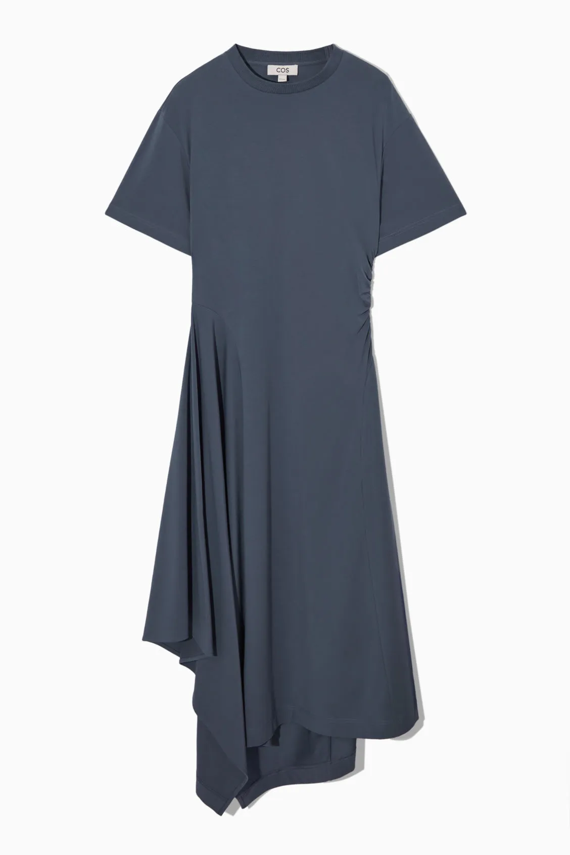 Команда дизайнеров COS придала повседневному платью-футболке элегантное обновление. Модель из эластичного серо-голубого хлопкового джерси с рюшами по бокам и асимметричным низом средней длины, подчеркивающим летящий силуэт. Носите его с мюлями и массивными серьгами.