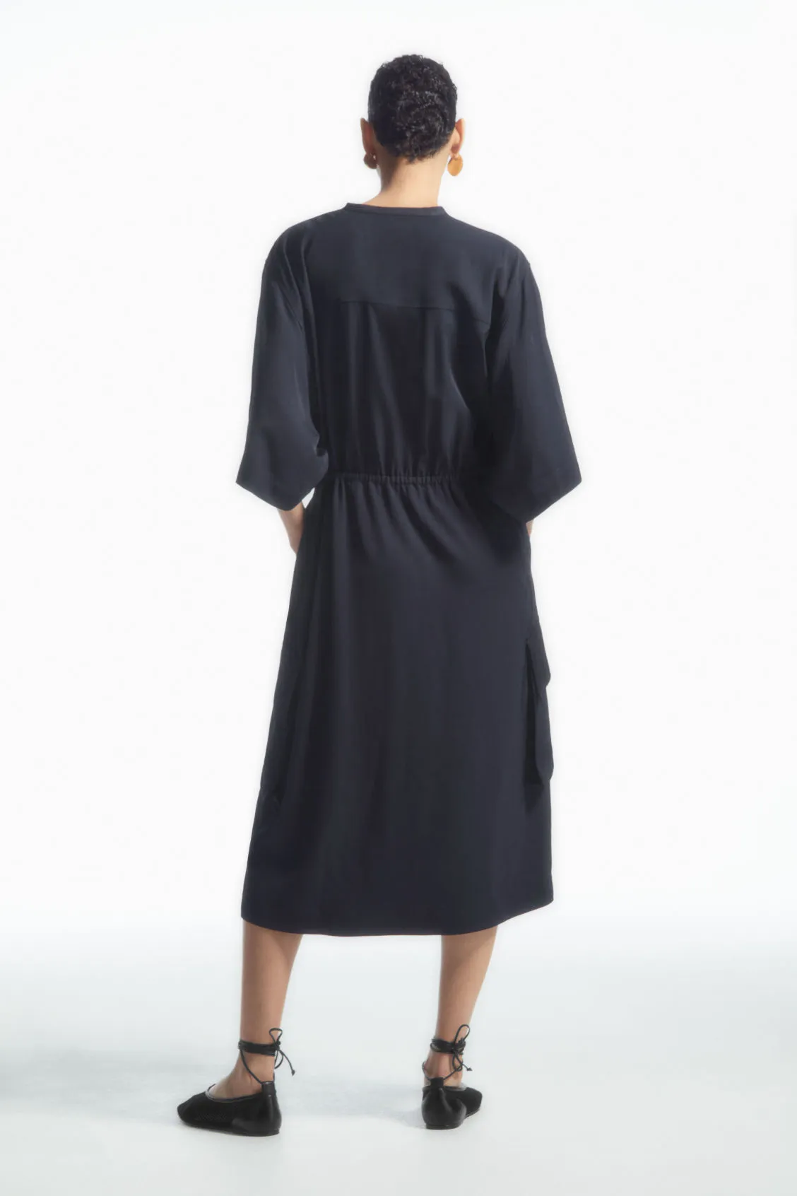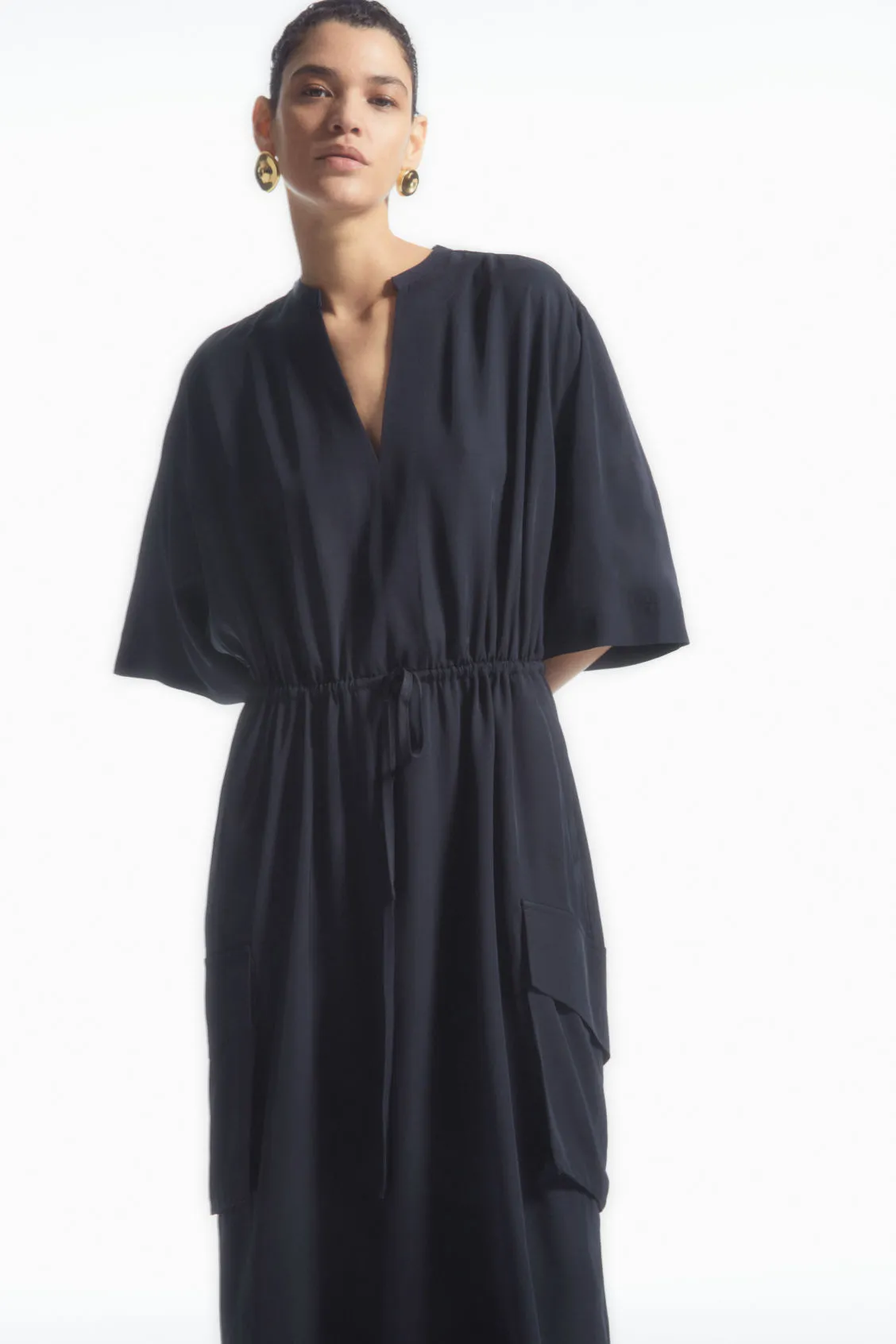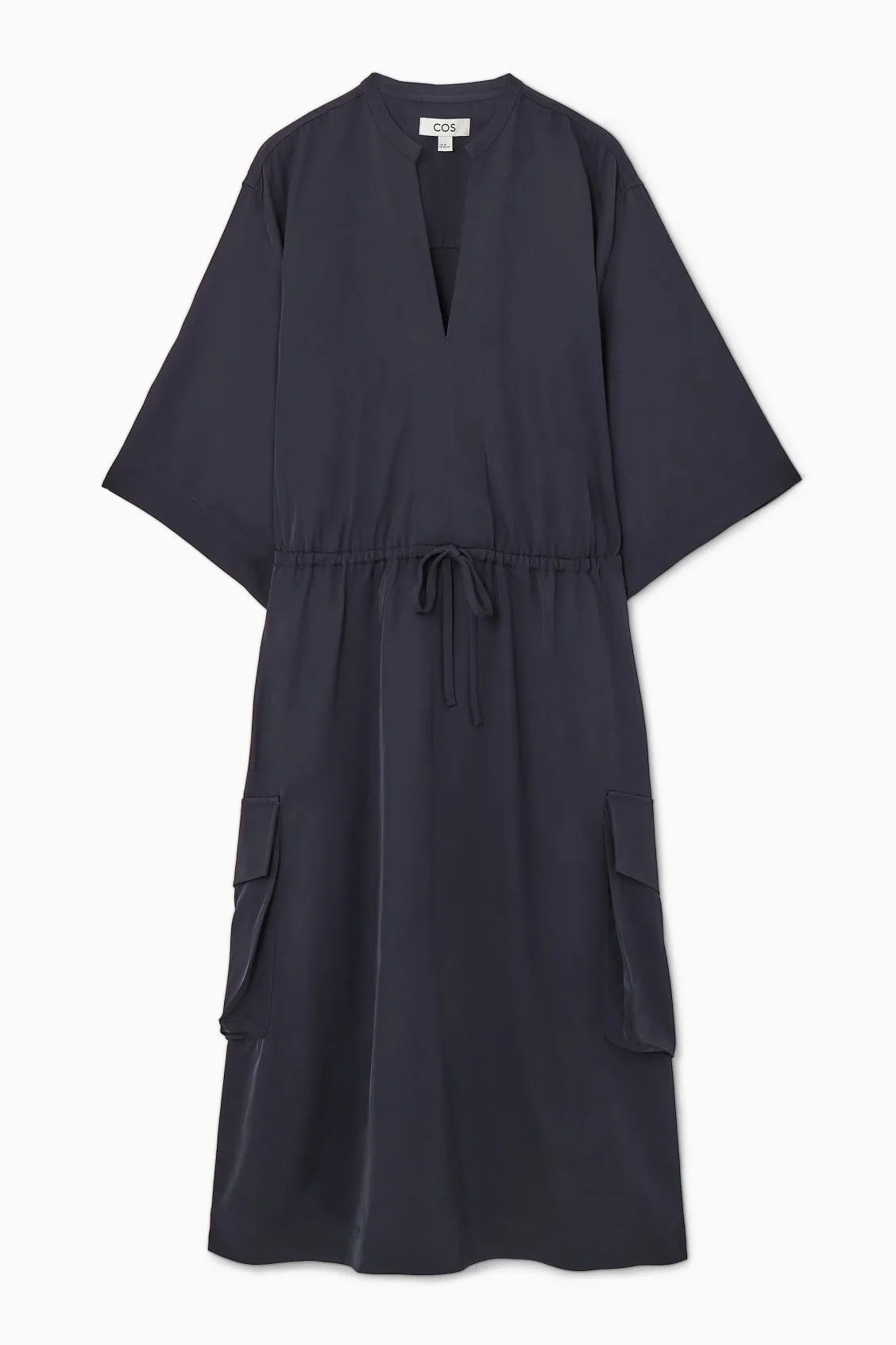 Это современное платье с утонченной функциональной эстетикой выполнено из темно-синего твила и имеет глубокий V-образный вырез, короткие рукава и большие грузовые карманы с каждой стороны. Посадку можно индивидуально отрегулировать с помощью завязок соответствующего цвета.