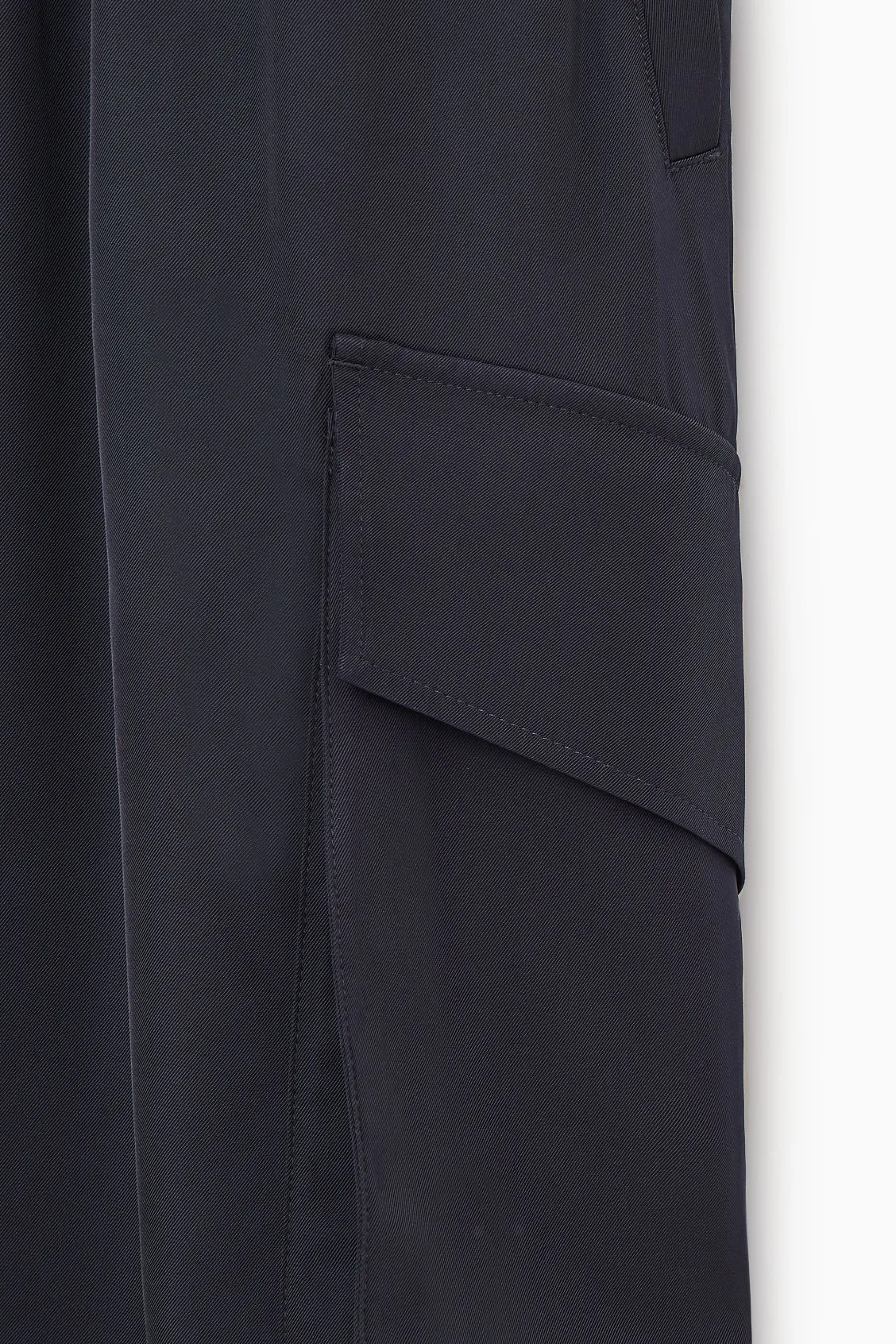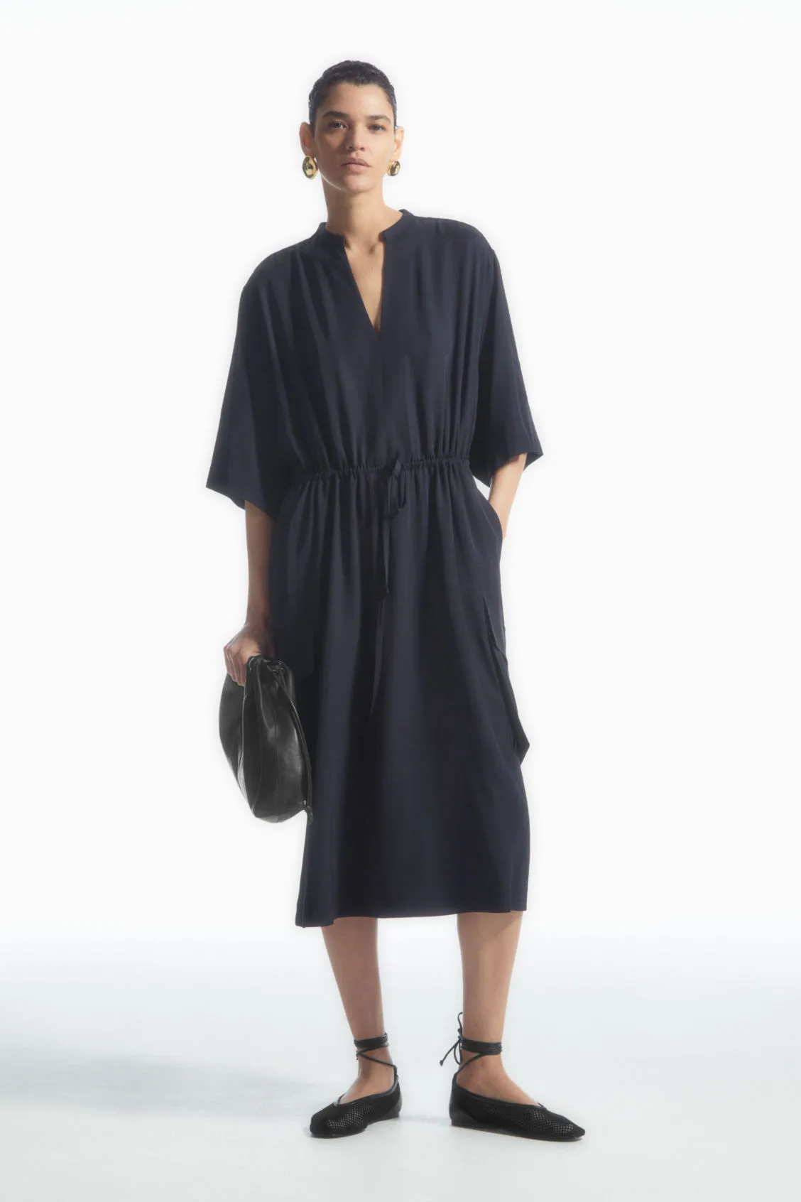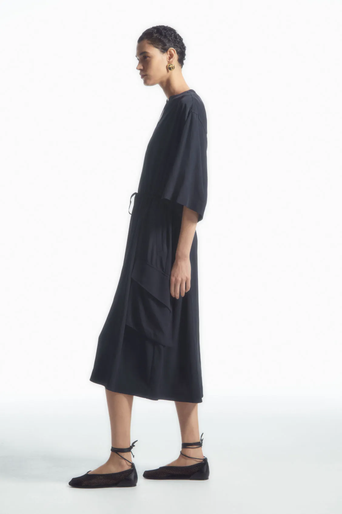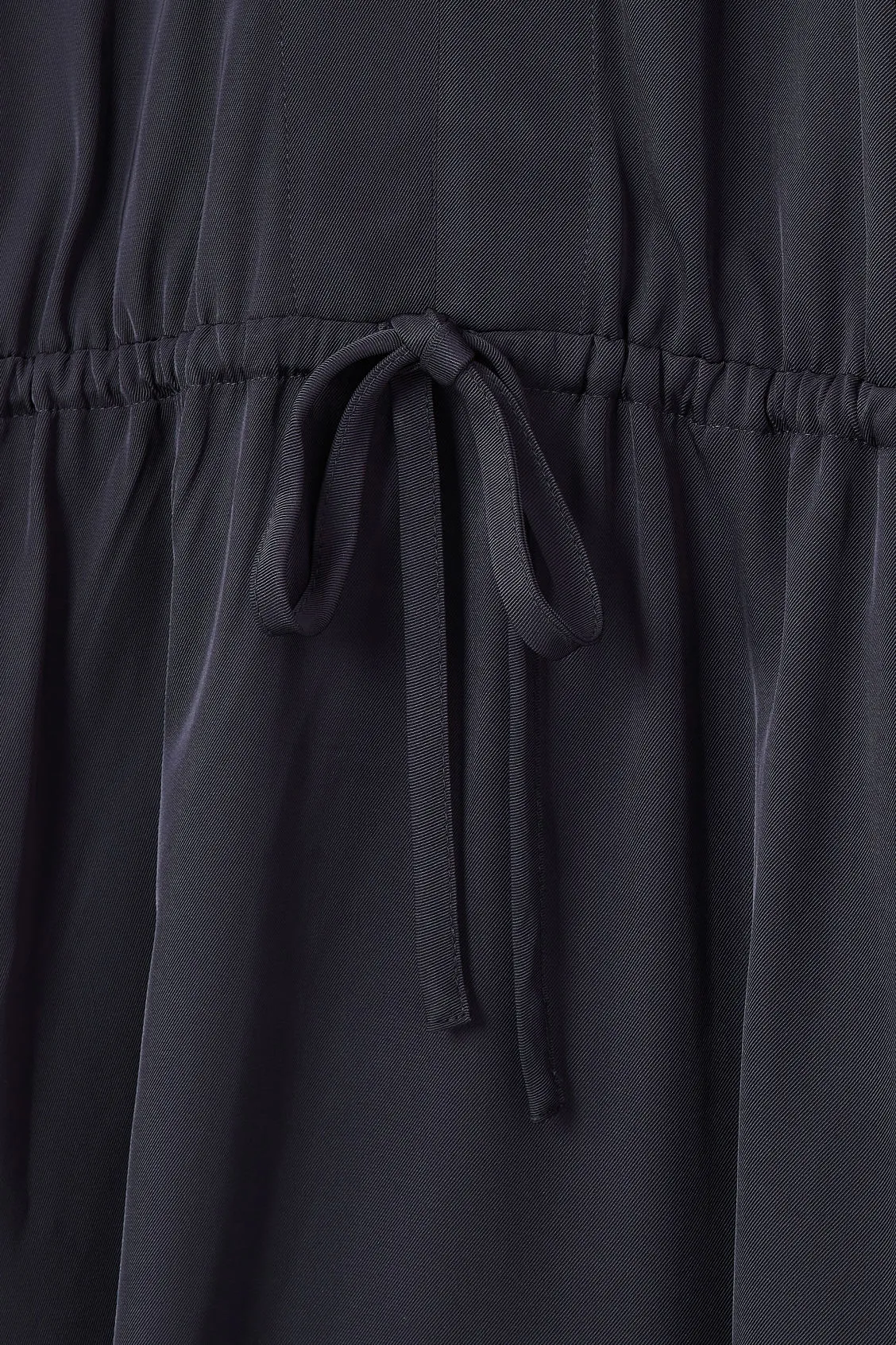Это современное платье с утонченной функциональной эстетикой выполнено из темно-синего твила и имеет глубокий V-образный вырез, короткие рукава и большие грузовые карманы с каждой стороны. Посадку можно индивидуально отрегулировать с помощью завязок соответствующего цвета.