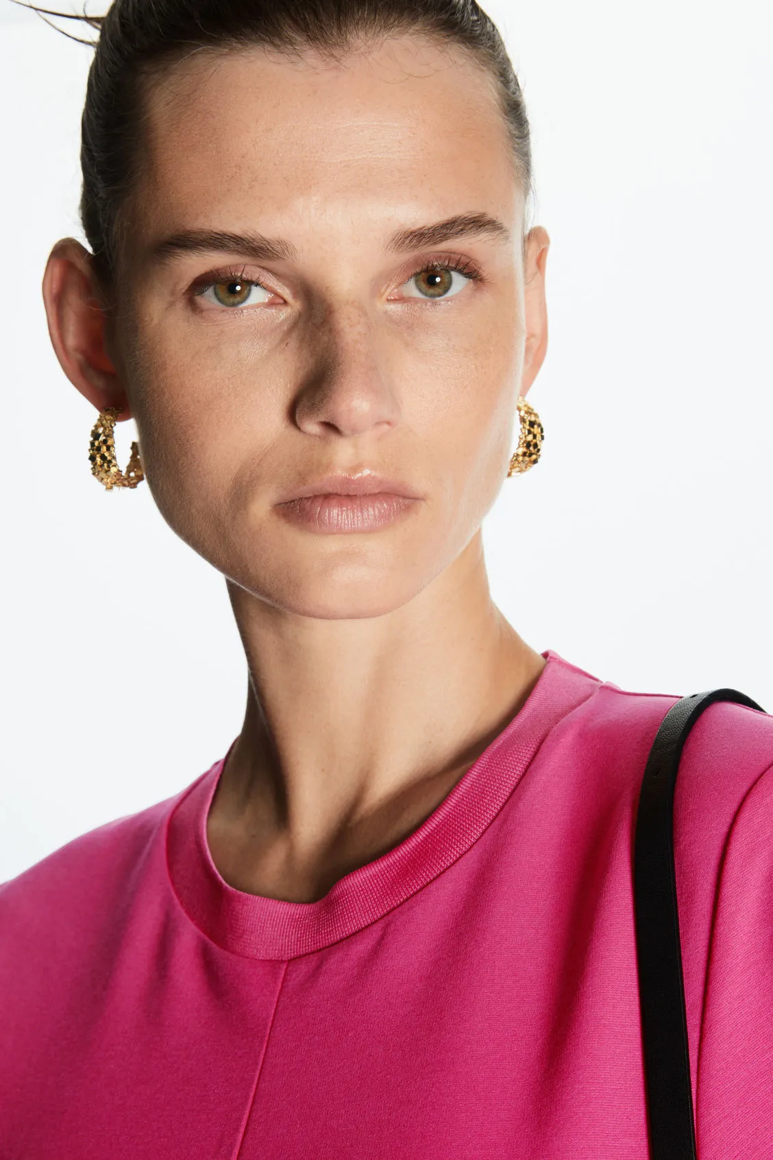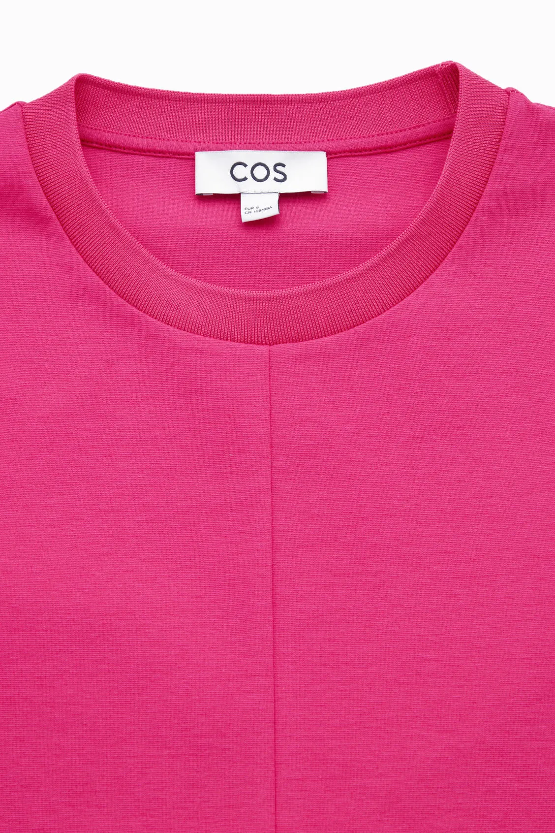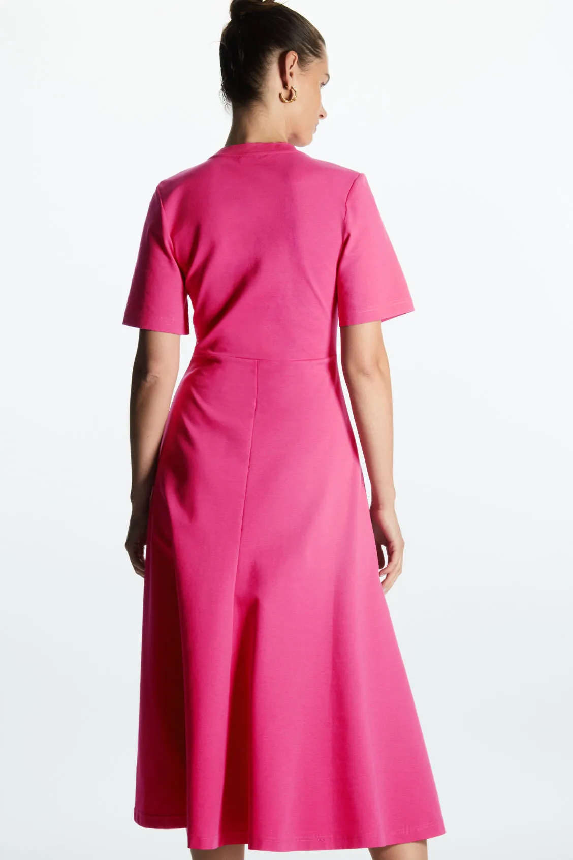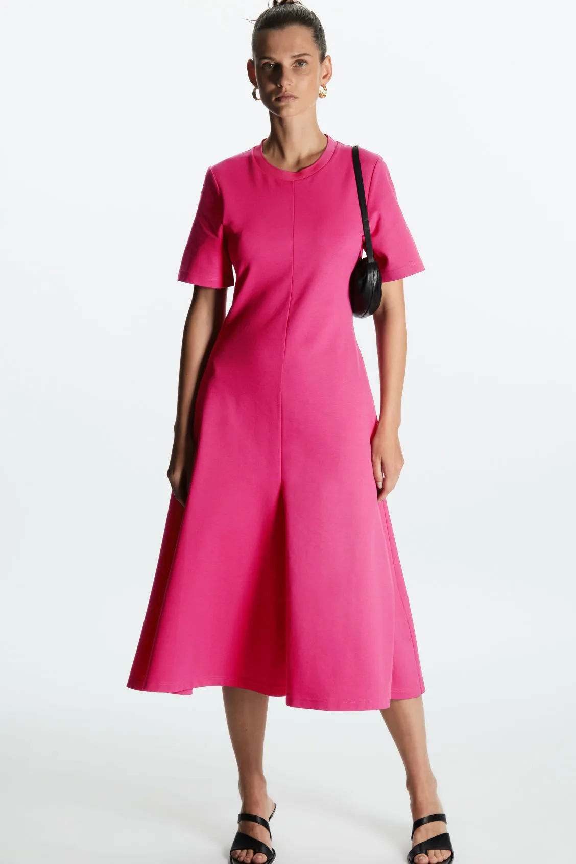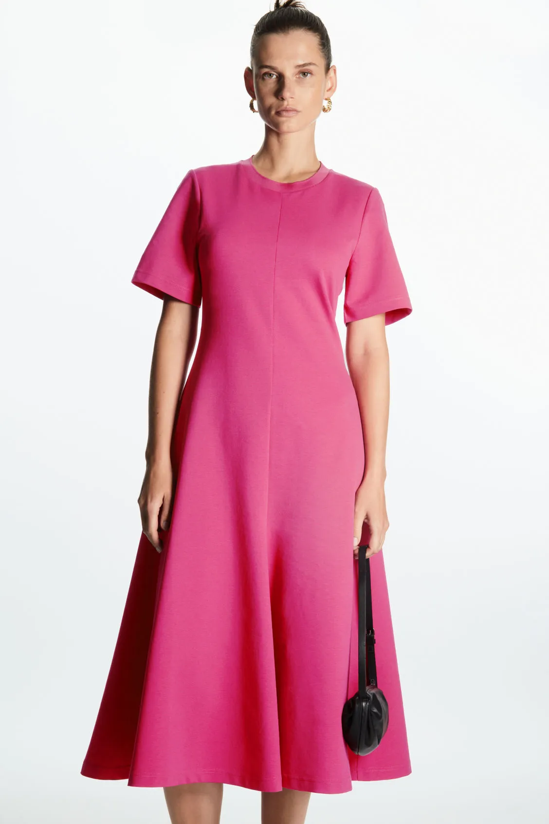 Это платье-миди из джерси, облегающее бюст и расклешенную юбку, раскрывает плиссированный подол и облегает фигуру трапециевидной формы. Его элегантный силуэт подчеркивается круглым вырезом в рубчик, свободными короткими рукавами и открытой центральной строчкой.