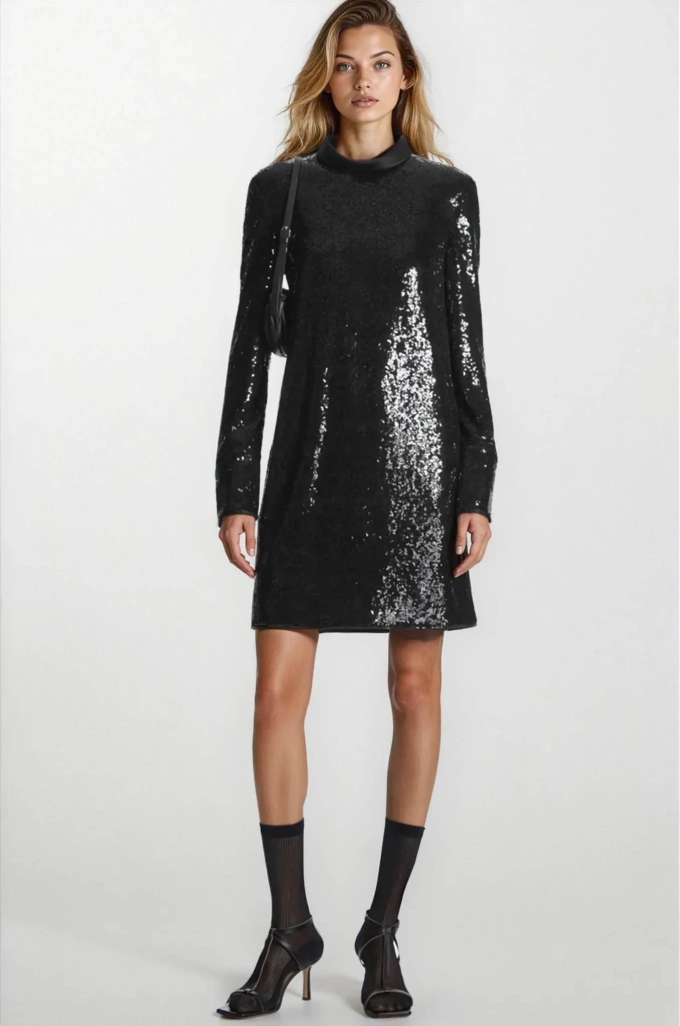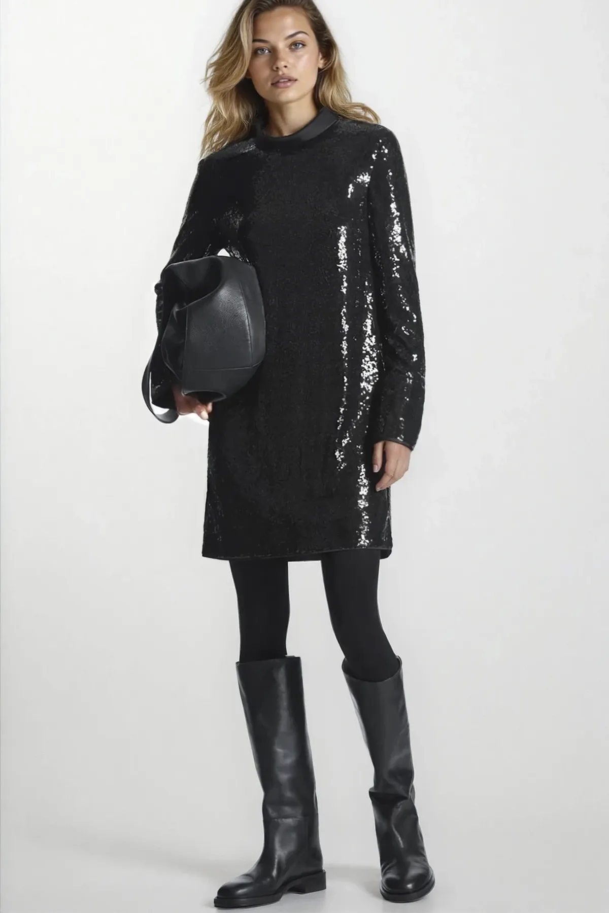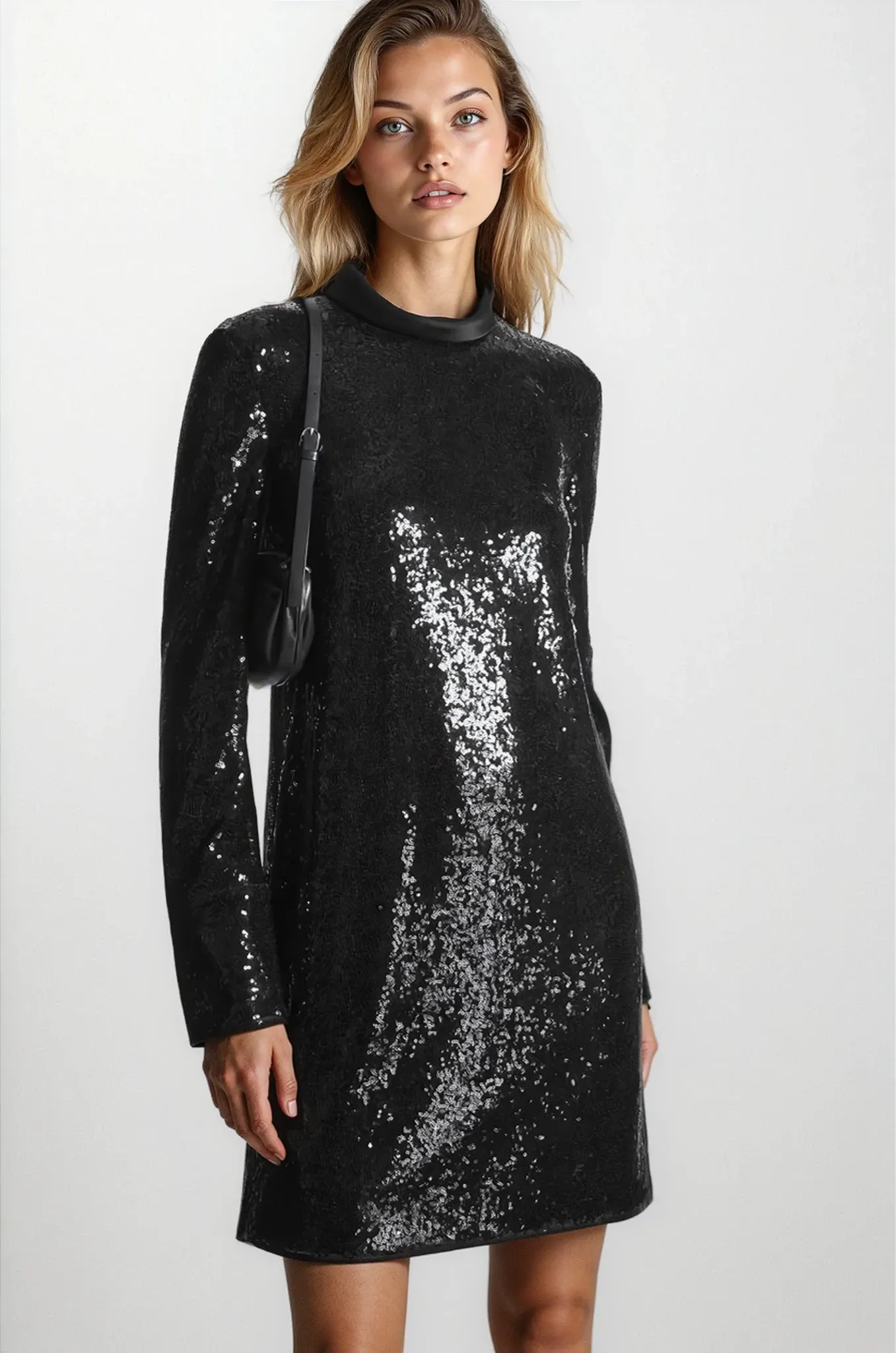 Это черное платье, выполненное из экологически чистых материалов, полностью украшено мерцающими пайетками из переработанных материалов и имеет атласный воротник-стойку. Модель имеет стандартную посадку, имеет вытачки для груди и рифленые рукава. Носите его с сапогами до колена, чтобы сбалансировать длину мини.