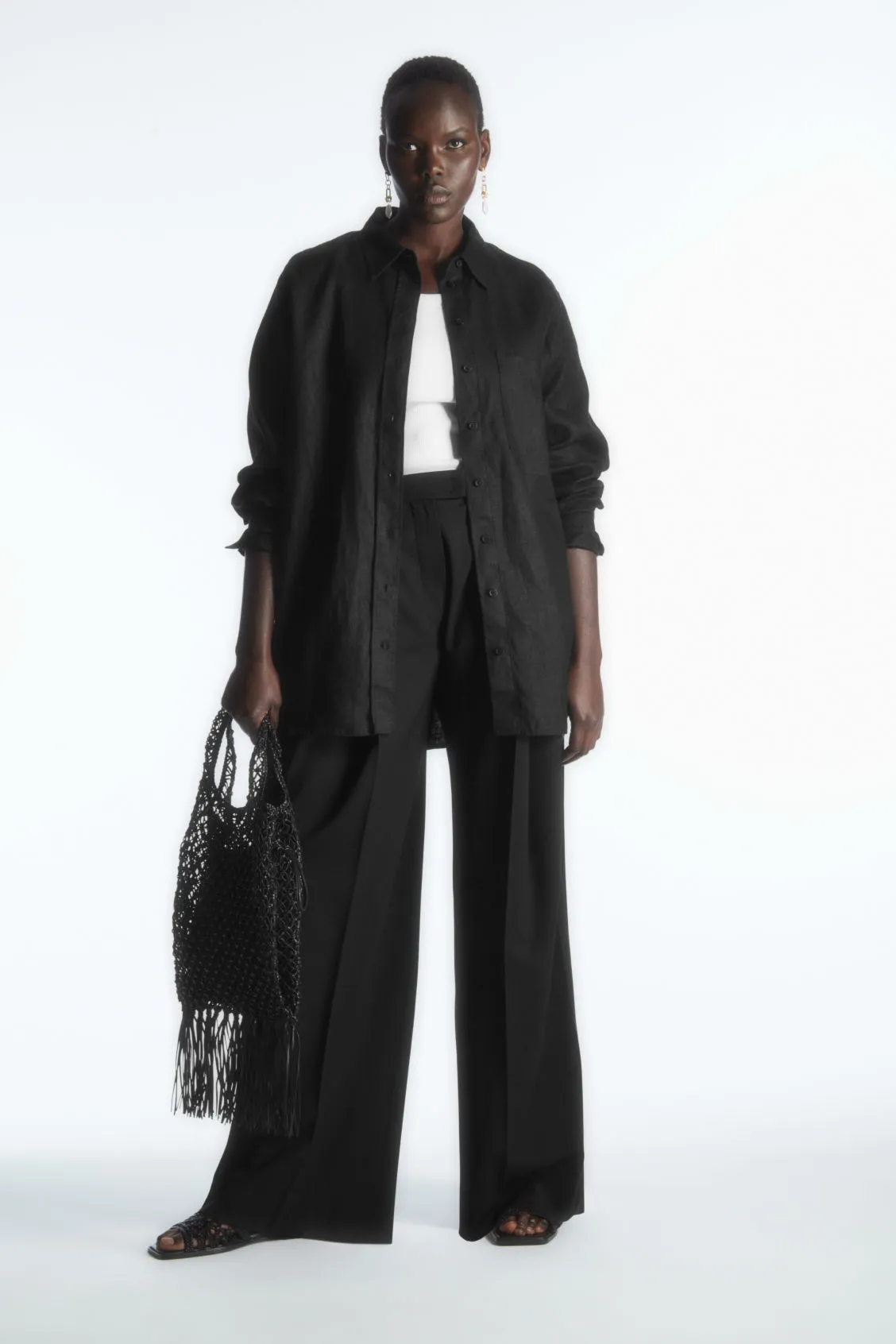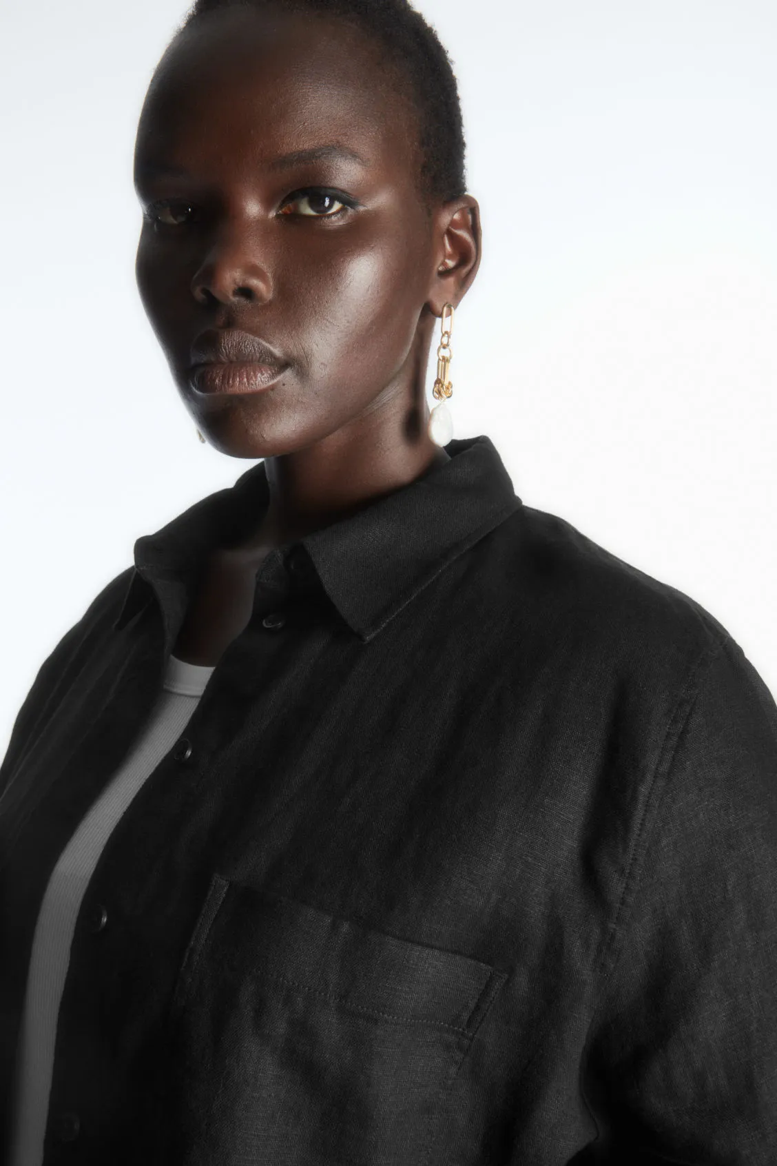 Сшитая из чистого льна, дышащего, легкого и имеющего естественную текстуру, эта черная рубашка свободного кроя идеально подходит для ношения поверх майки при повышении температуры. У него остроконечный воротник, накладной карман и изогнутый ступенчатый низ.