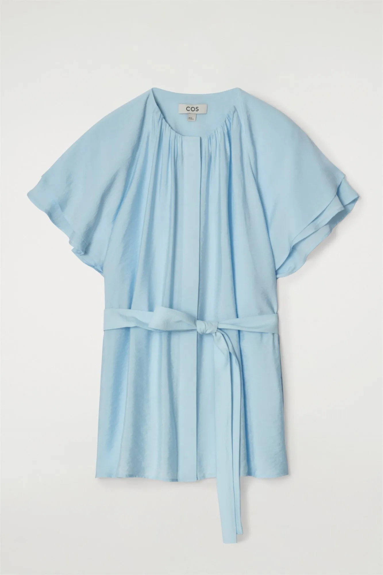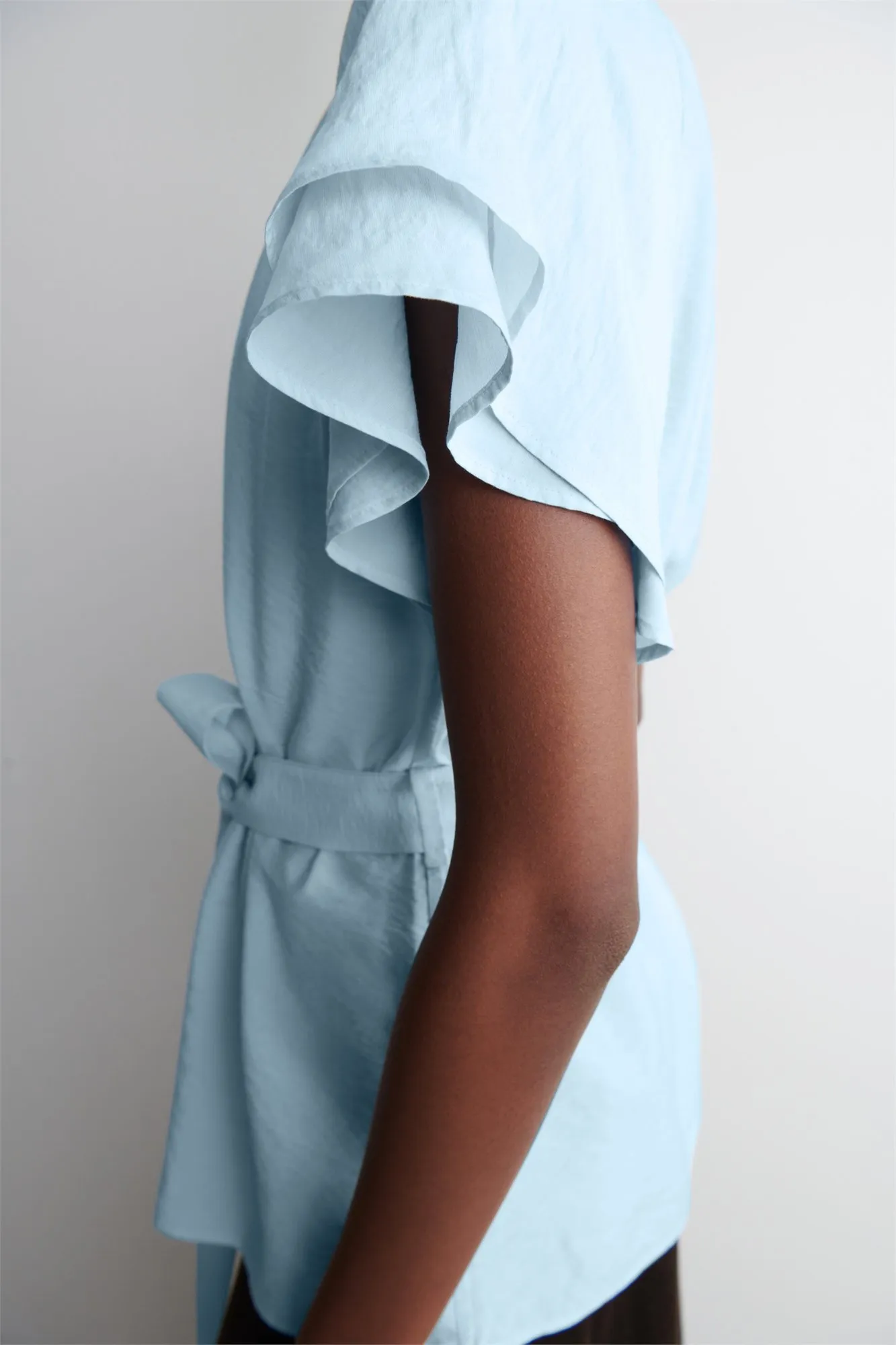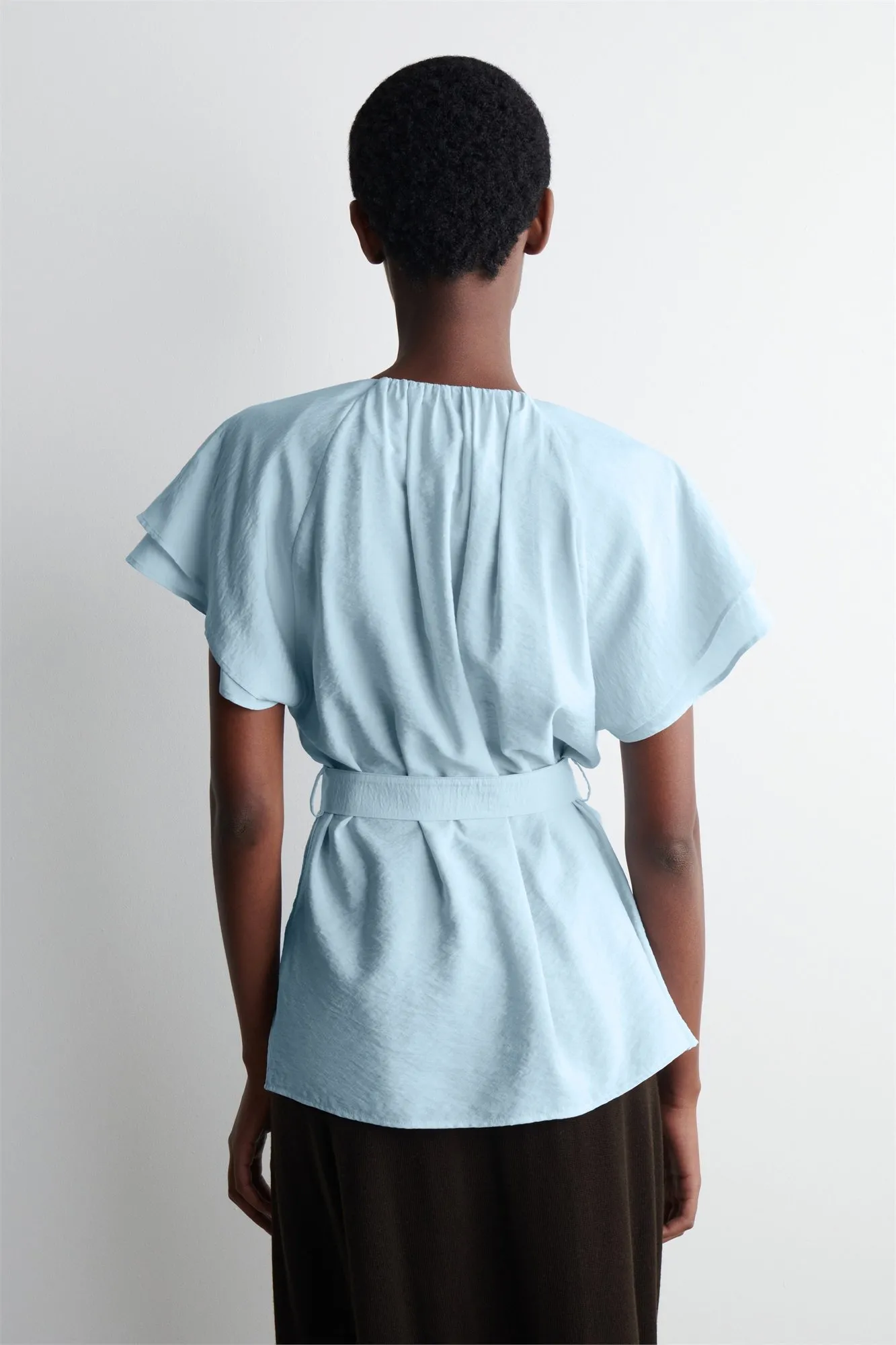 Эта элегантная светло-голубая блуза выполнена из легкой вискозной смеси ECOVERO™ и имеет присборенный вырез и многослойные рукава реглан. Подходящие по цвету ленты изящно подчеркивают талию.