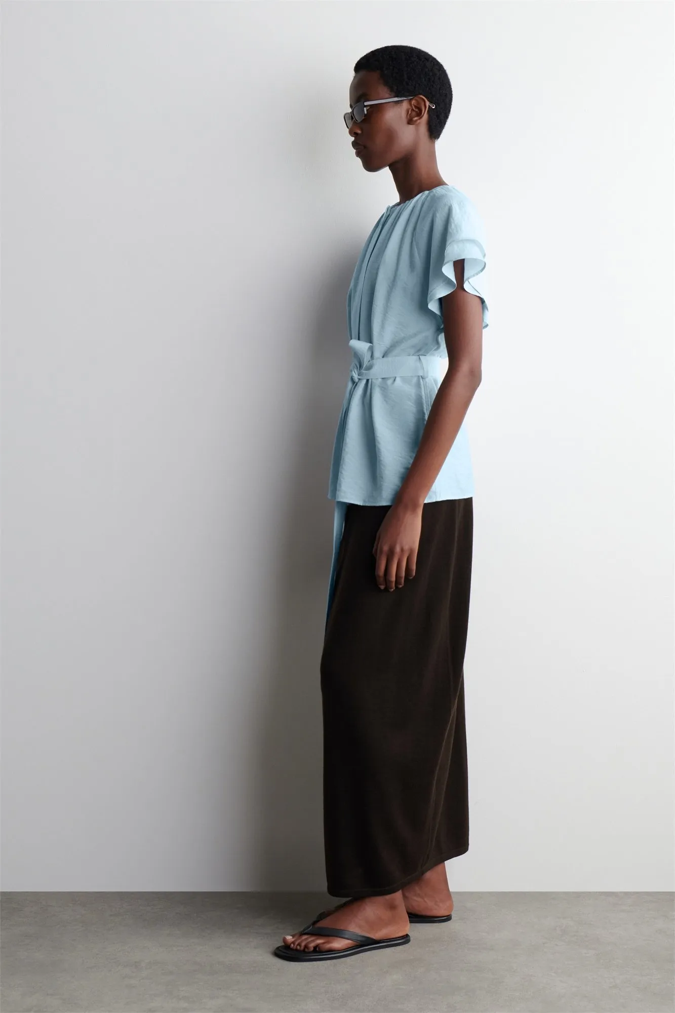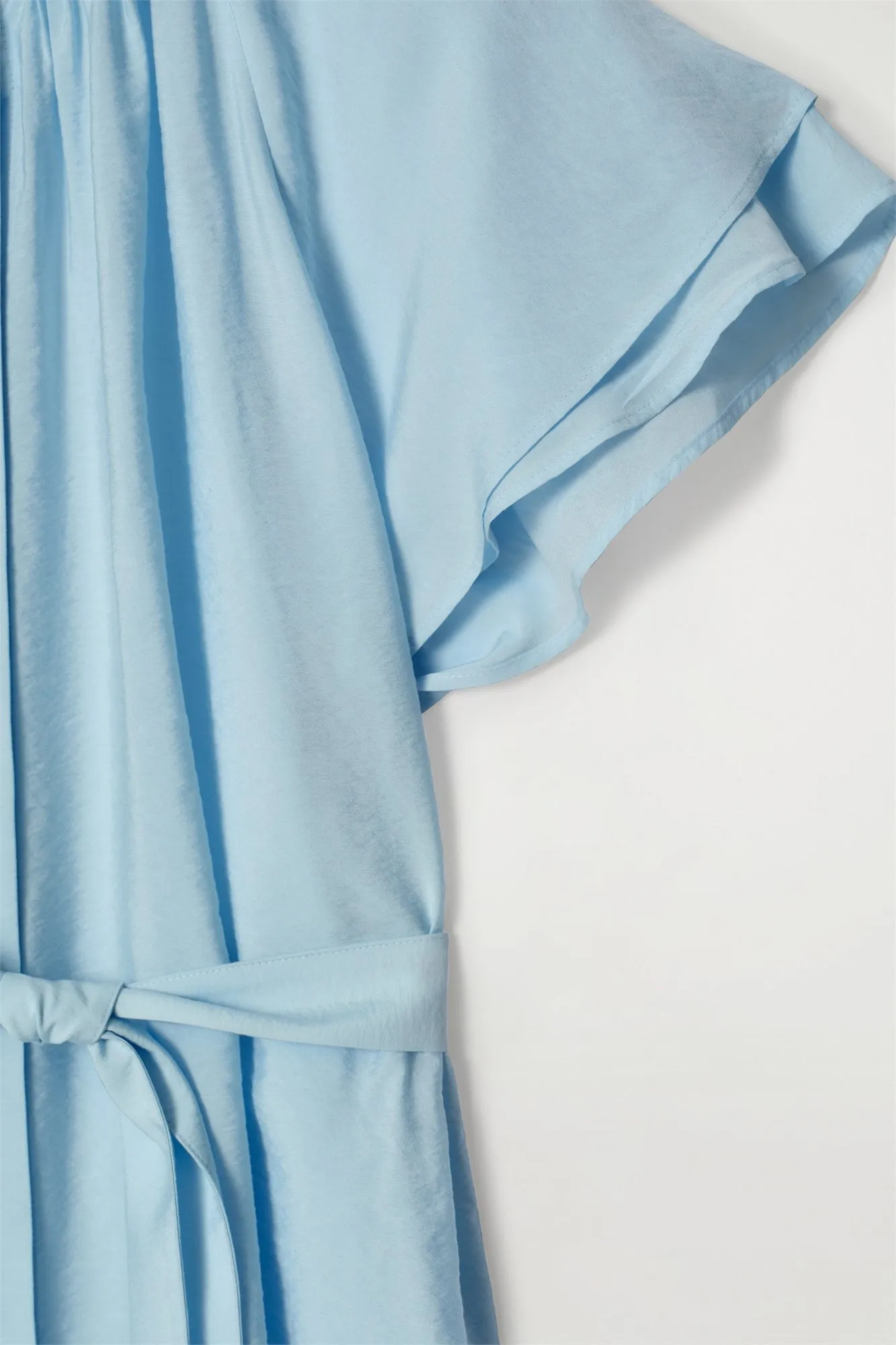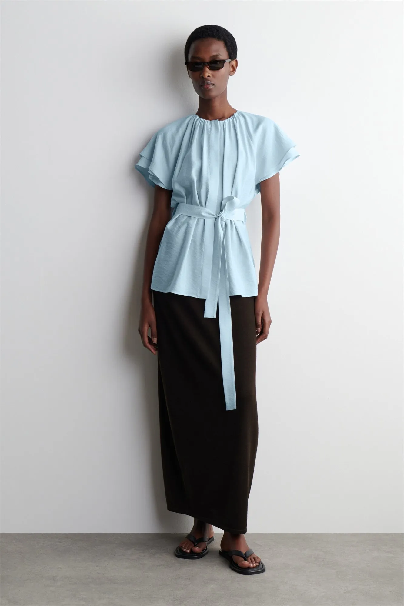Эта элегантная светло-голубая блуза выполнена из легкой вискозной смеси ECOVERO™ и имеет присборенный вырез и многослойные рукава реглан. Подходящие по цвету ленты изящно подчеркивают талию.