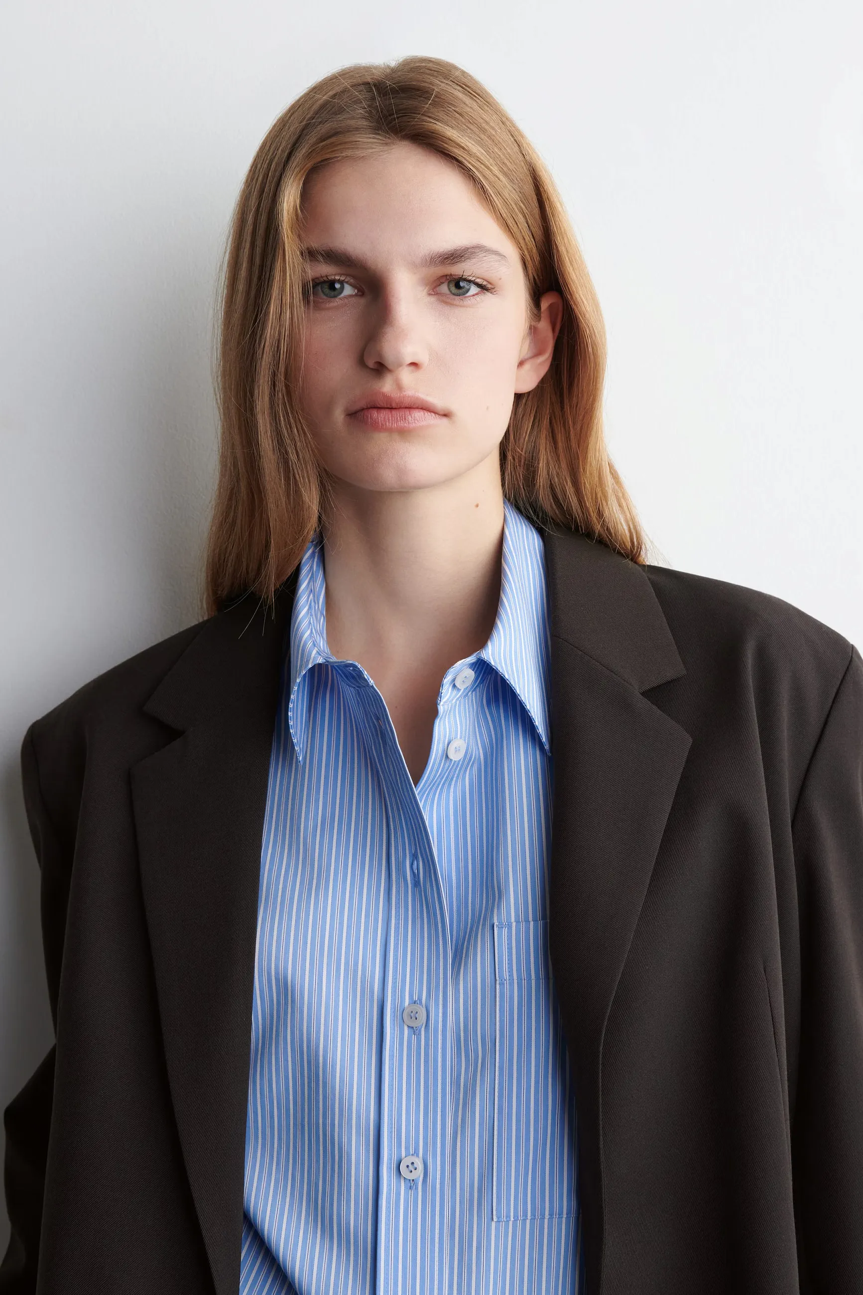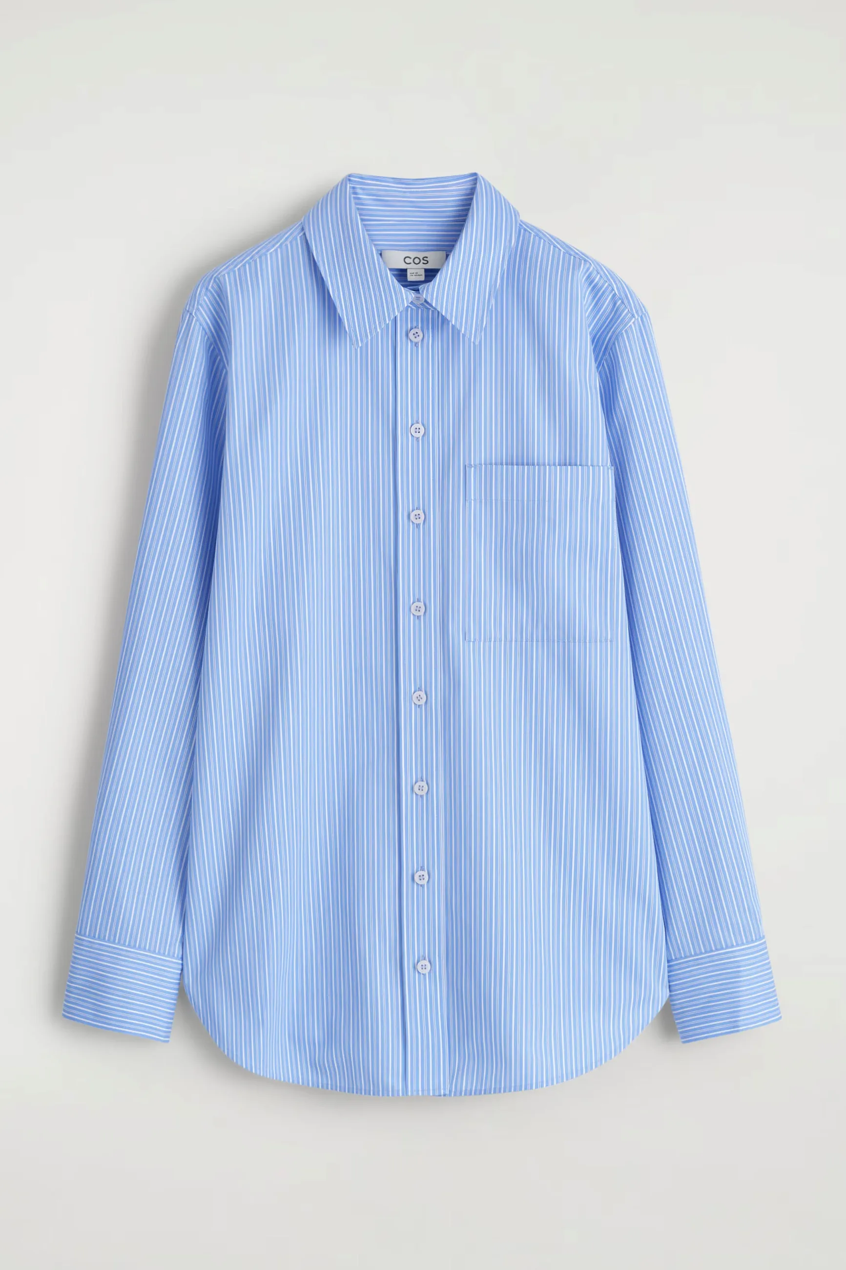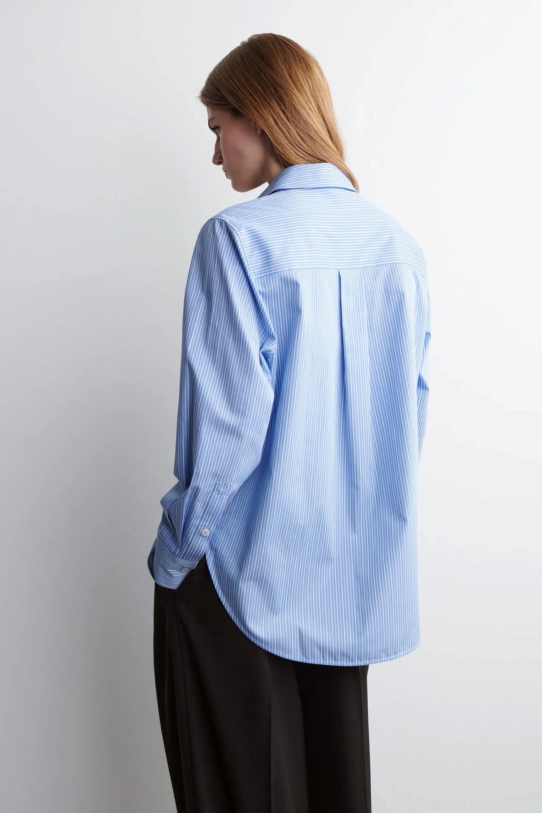 В этом сезоне женская команда модного бренда представляет современный взгляд на классический крой. Эта классическая элегантная рубашка в тонкую полоску выполнена из ультрамягкого хлопка пима. Она имеет накладной нагрудный карман, манжеты на пуговицах и закруглённый подол.