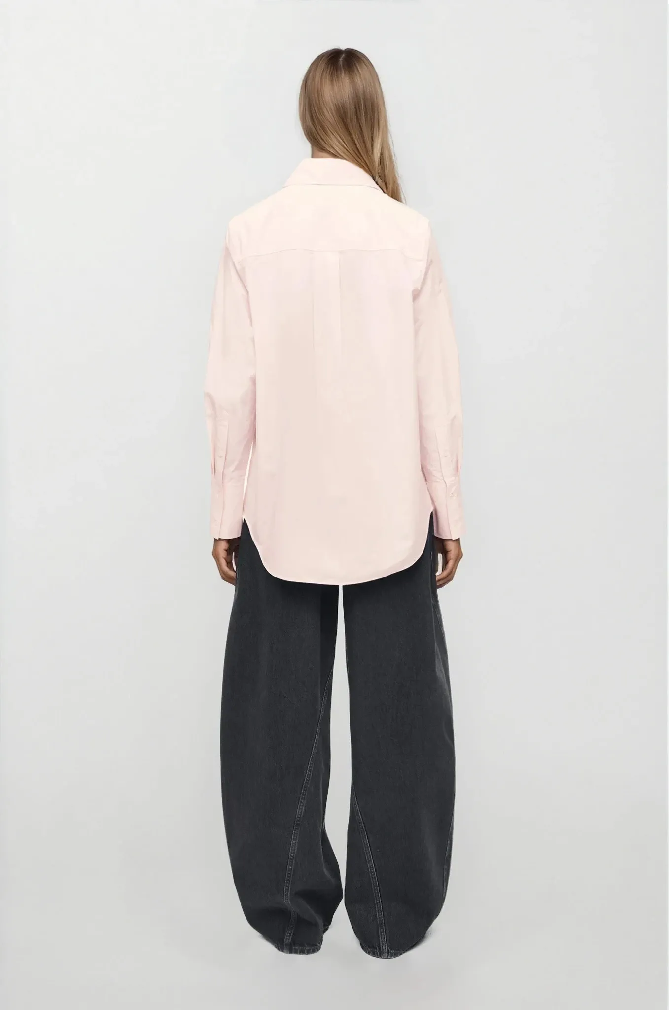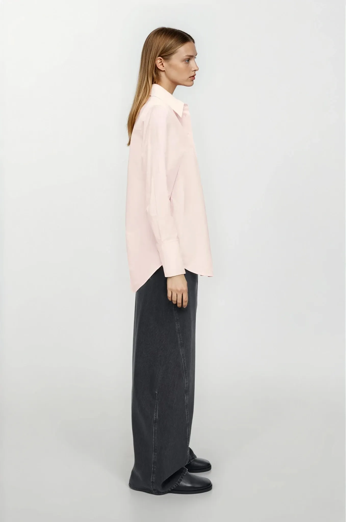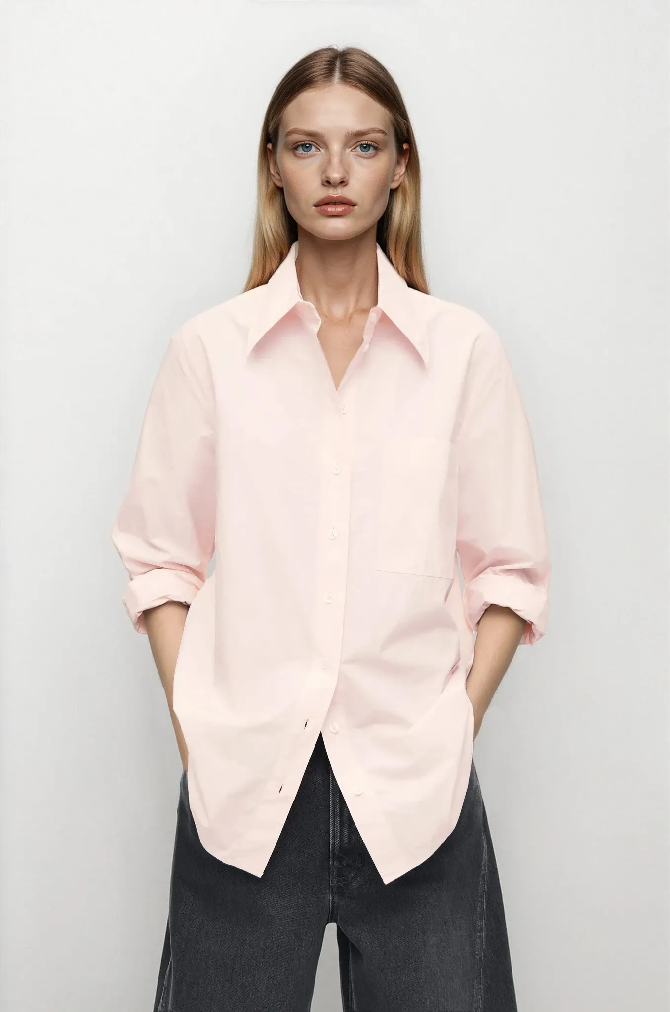 Эта бледно-розовая рубашка, являющаяся основным элементом женской коллекции COS, изготовлена из хрустящего хлопкового поплина. Она скроена по свободному крою, который подчеркивается изогнутым подолом, а также имеет острый воротник, длинные рукава и накладной карман на груди.