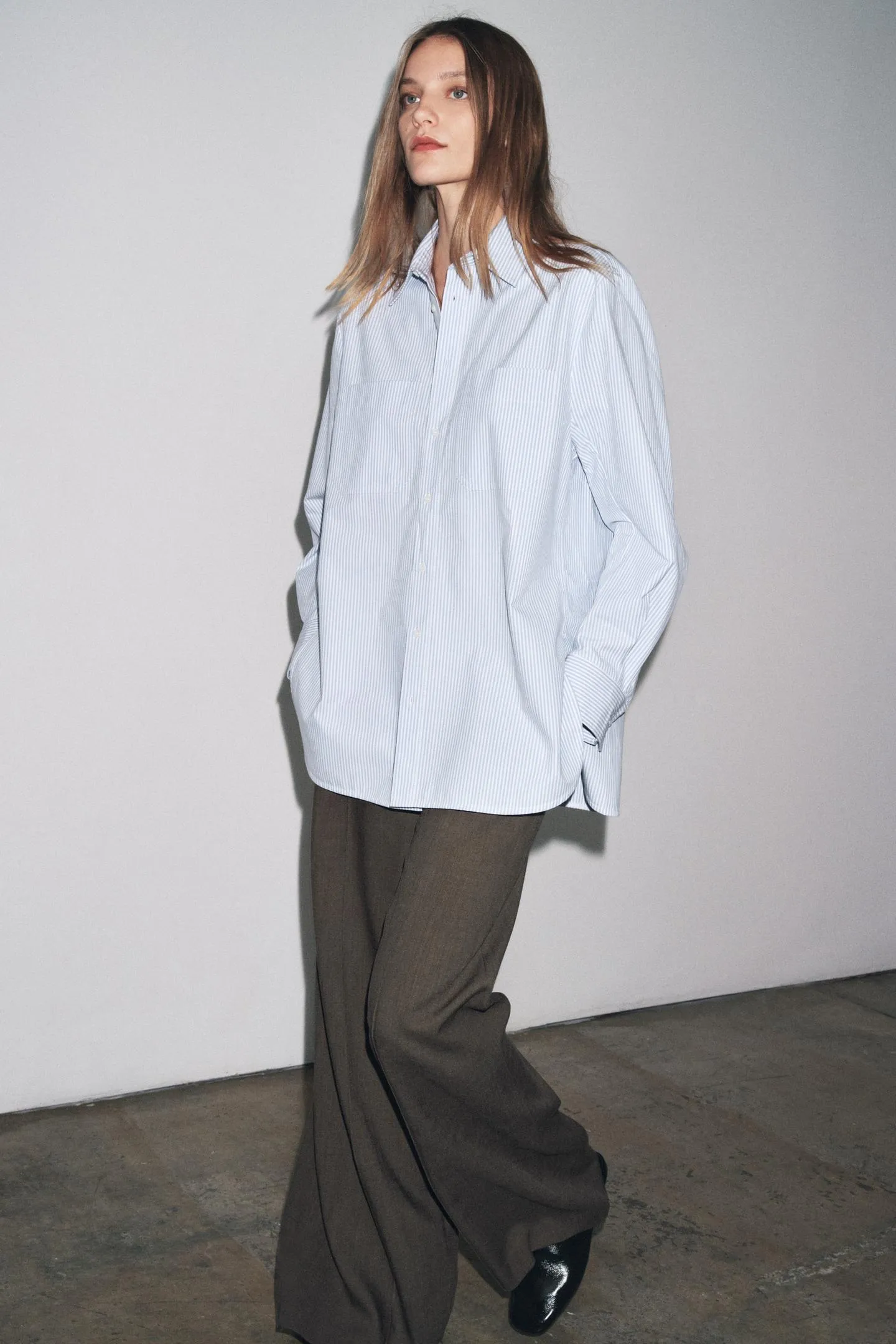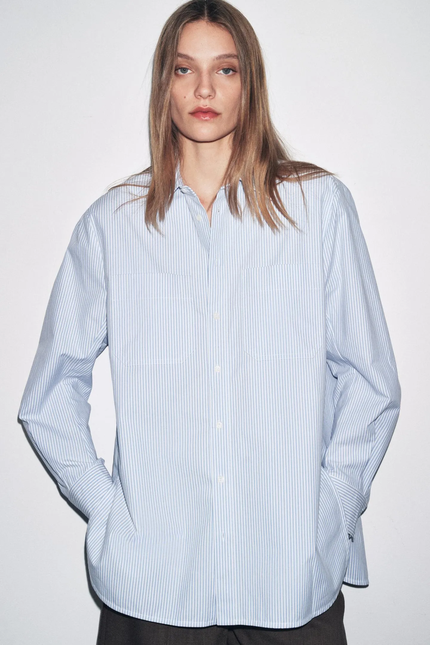 Рубашка свободного кроя из хлопка. Воротник с лацканами и длинные рукава с манжетами. Накладные карманы на груди. Асимметричный низ с разрезами спереди. Застежка на пуговицы.