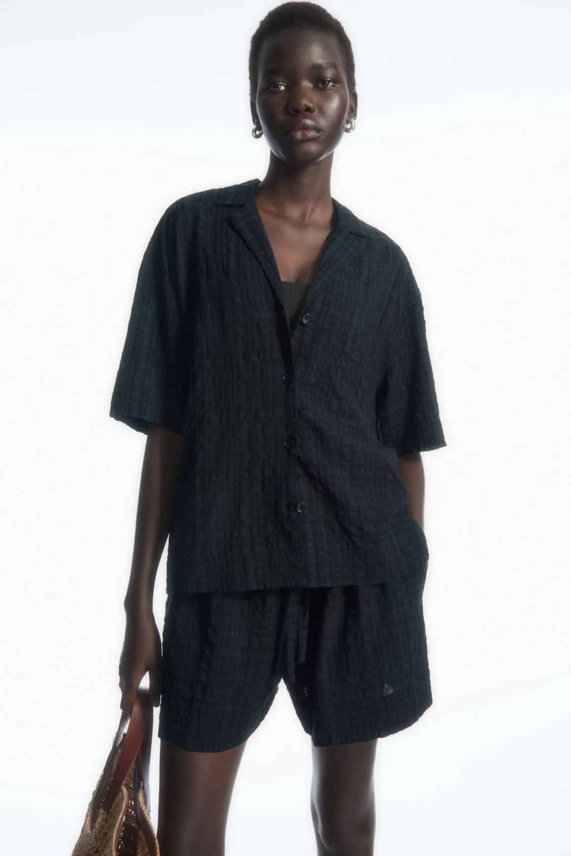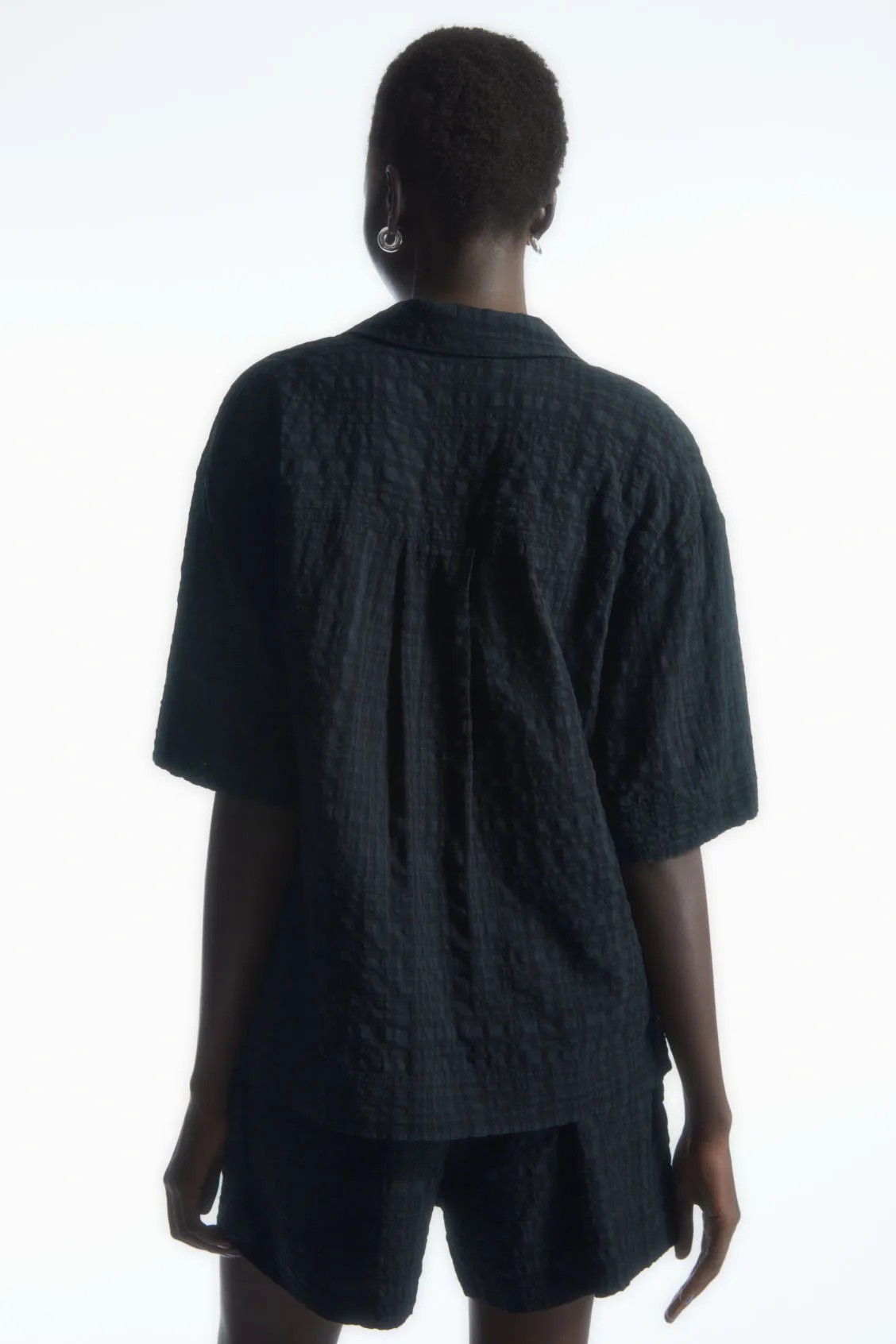 Эта креповая рубашка идеально подойдет для теплых летних вечеров. Модель изготовлена из дышащего хлопка с клетчатым переплетением, создающим фактурный эффект, с широким кубинским воротником и рукавами средней длины. Чтобы ансамбль получился гармоничным, носите его с подходящим предметом.