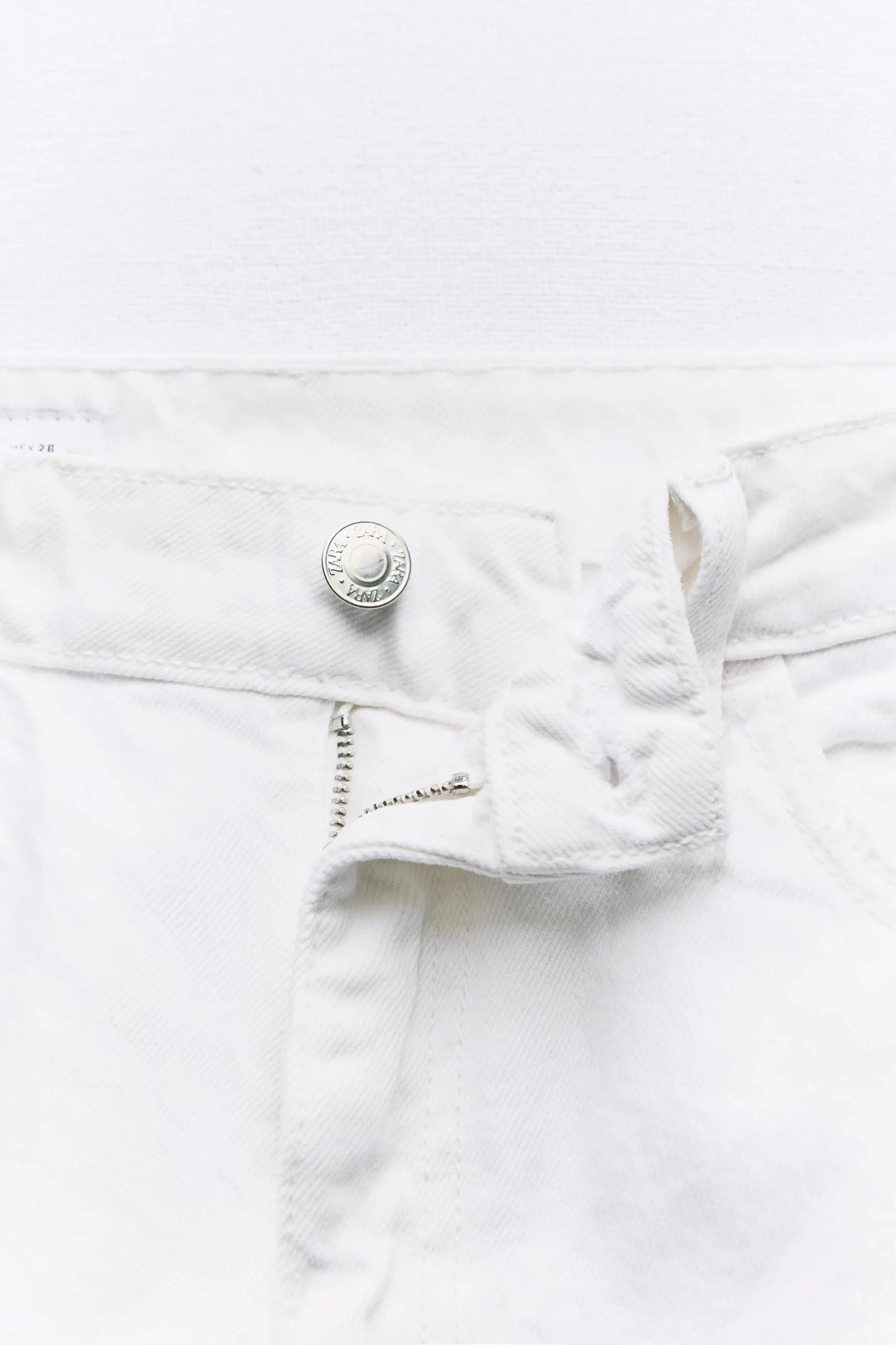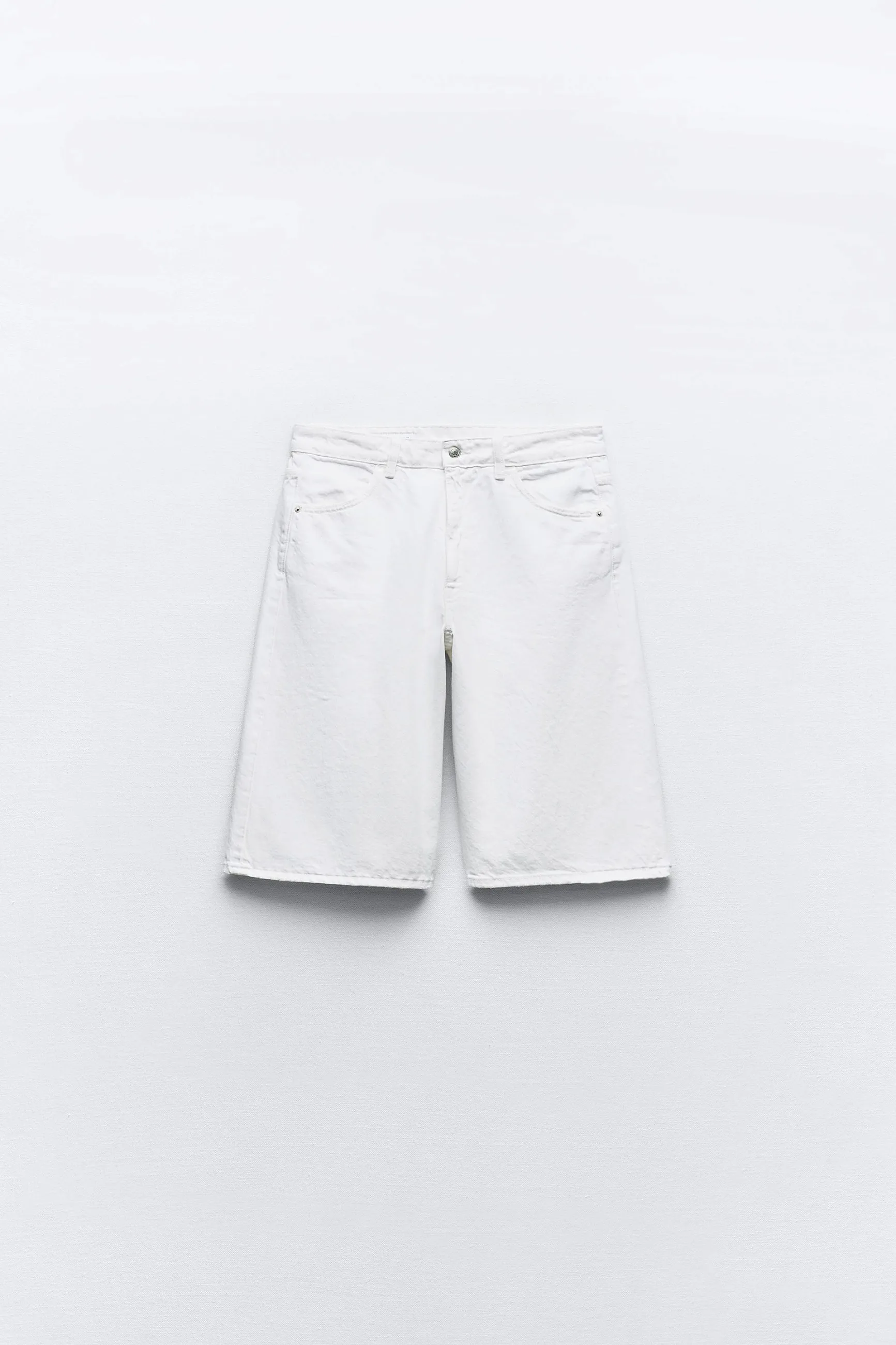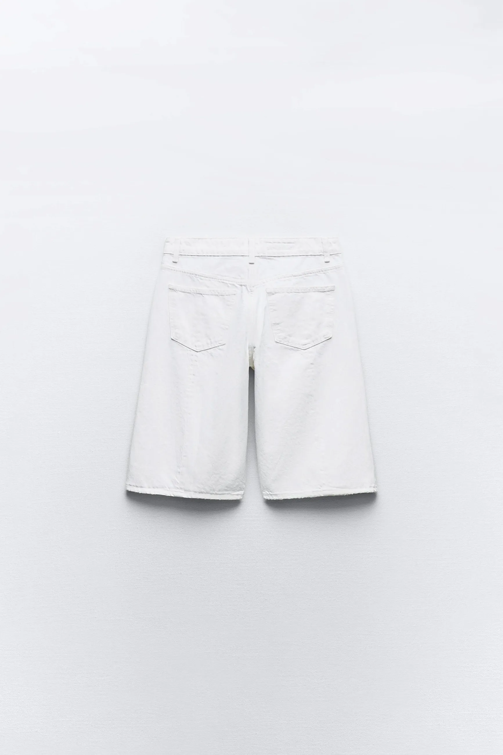 Джинсовые шорты-бермуды со средней посадкой и пятью карманами. Контрастные швы. Застежка на молнию спереди и металлическую пуговицу сверху.