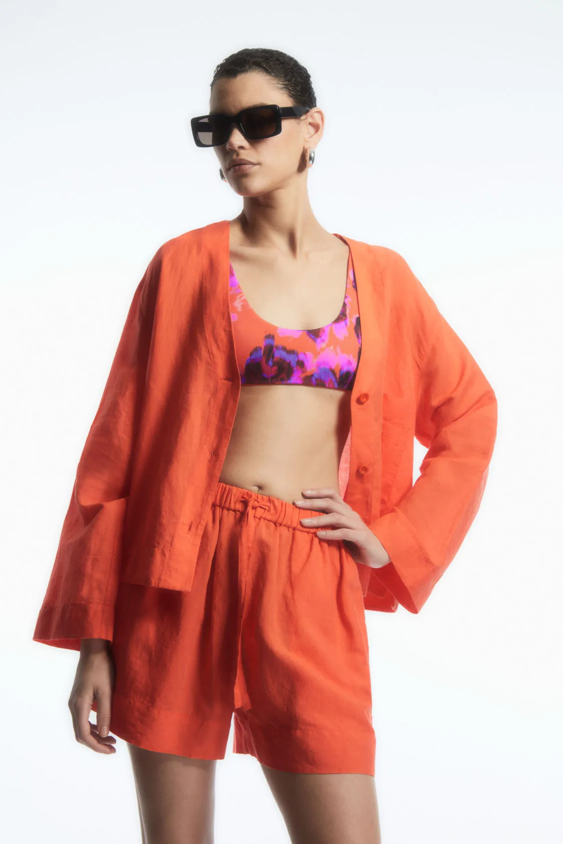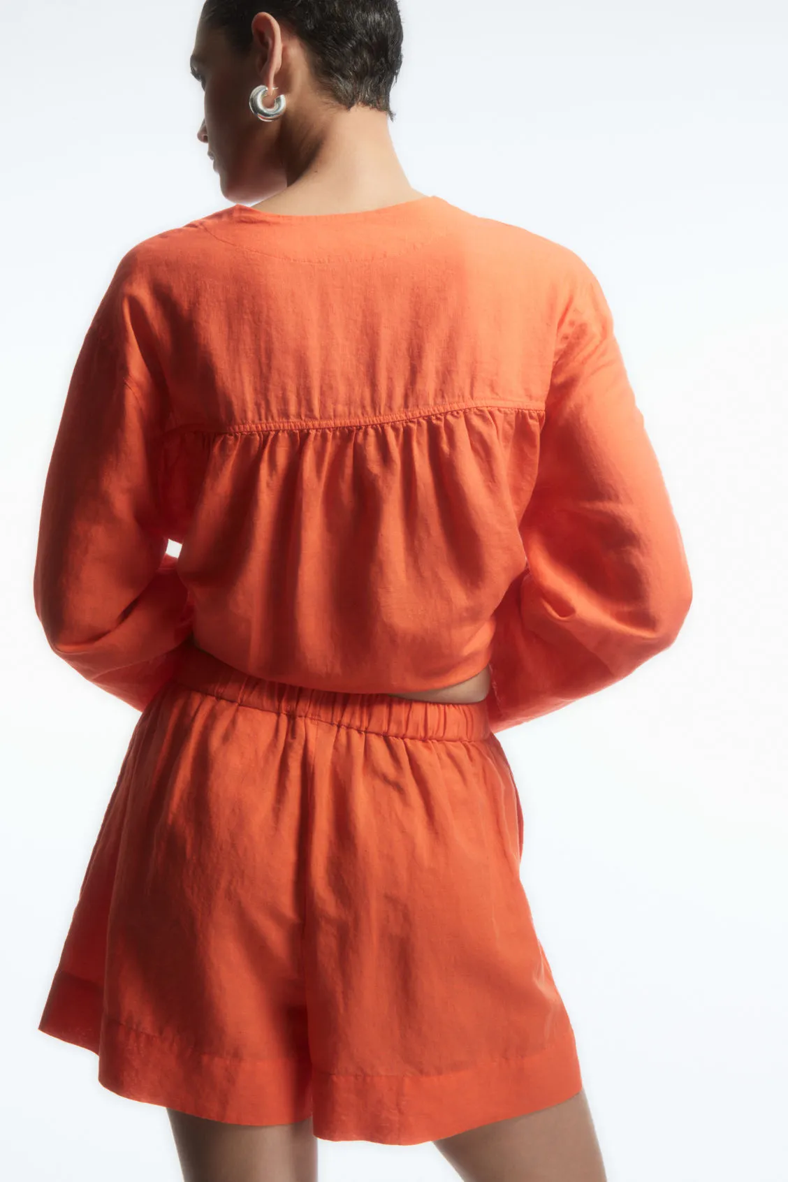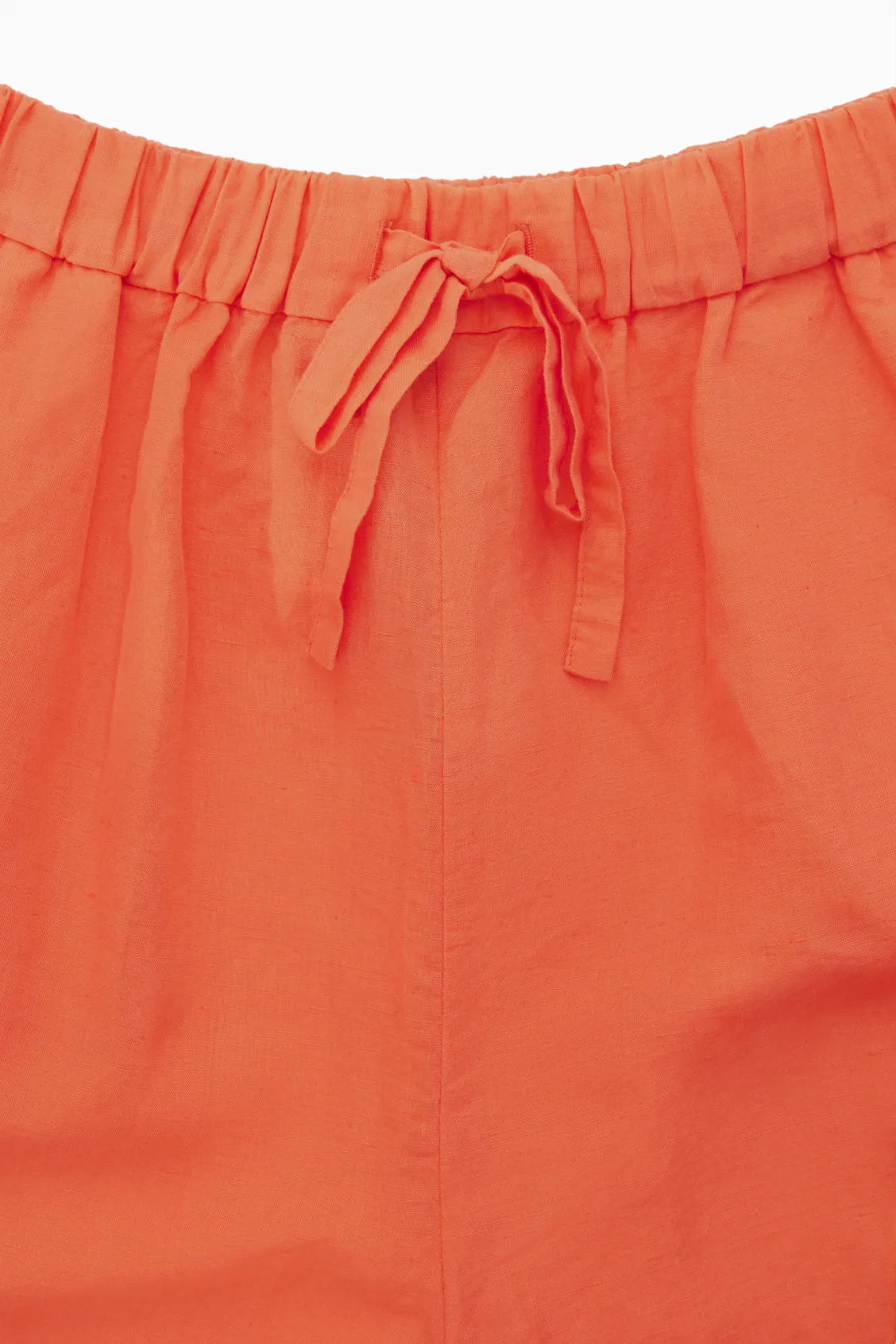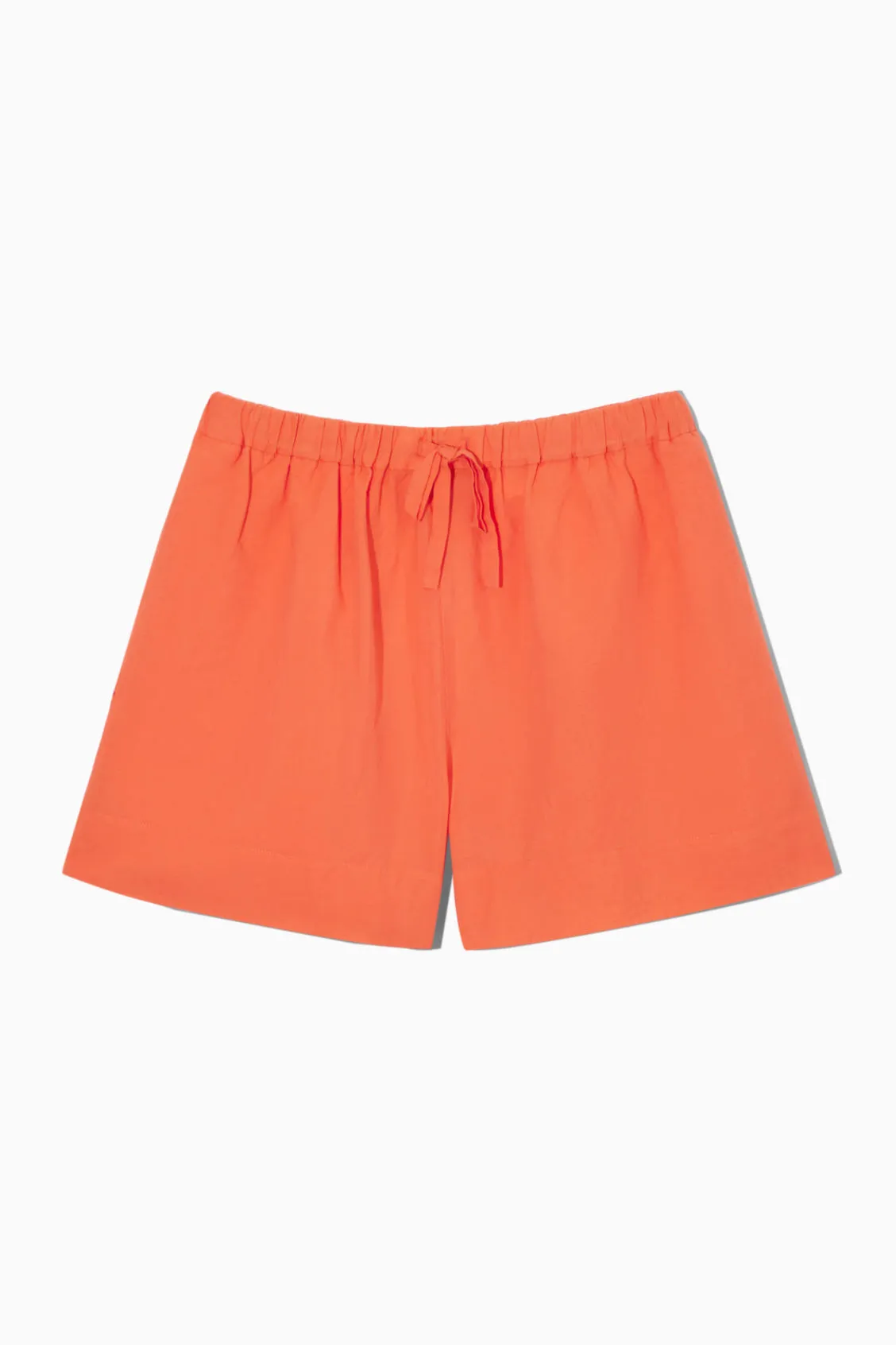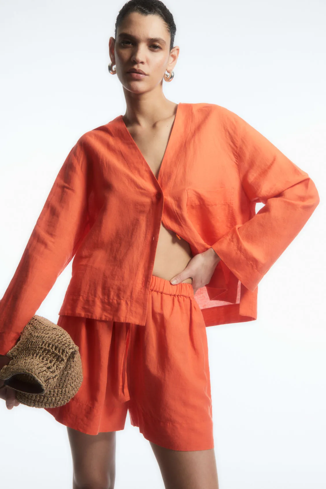 Эти оранжевые шорты COS созданы для теплого лета. Изготовленные из легкой смеси льна и органического хлопка, они имеют удобный эластичный пояс и карманы, в которые вы можете положить ключ от номера. Отрегулируйте посадку с помощью тканевого шнурка. Полный комплект создается с соответствующей рубашкой.