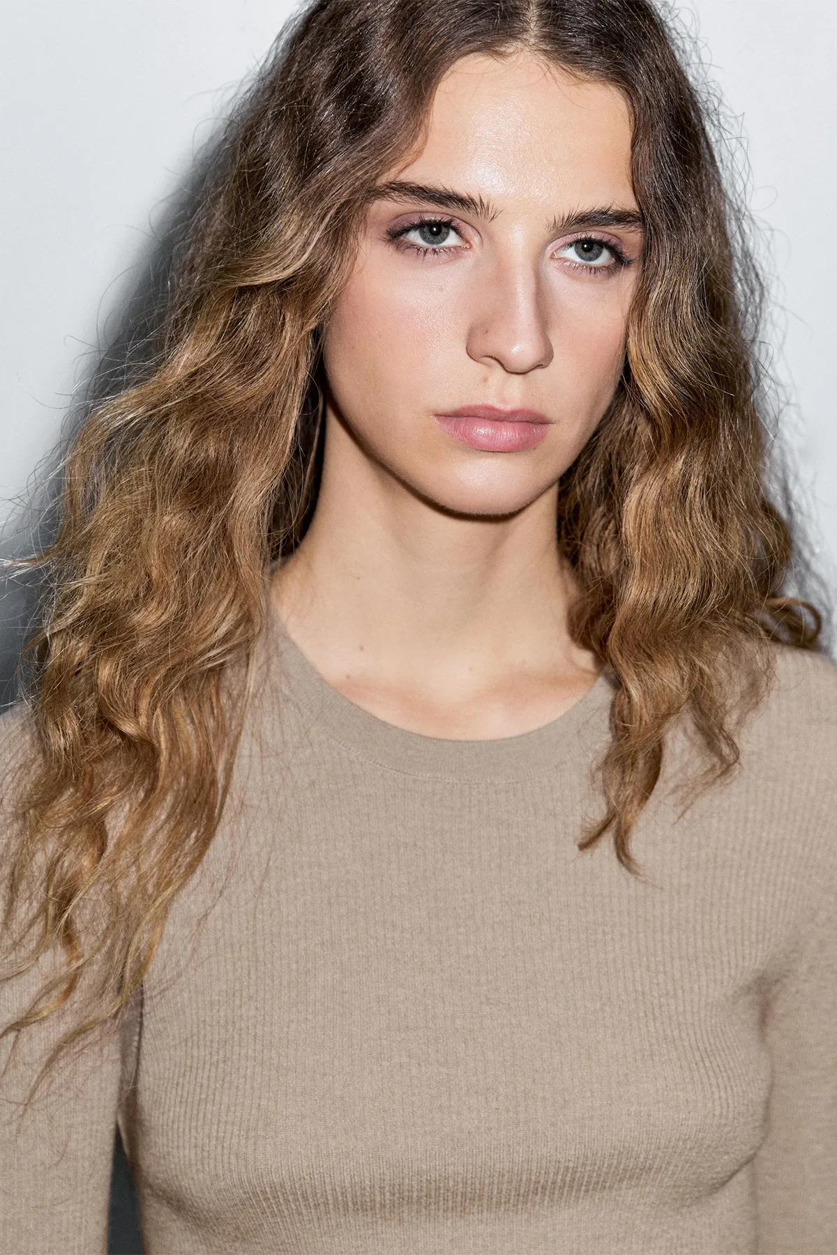 Джемпер из смесовой шерсти. Круглый вырез. Длинные рукава. Детали в рубчик . Ткань в рубчик. Облегающий крой.