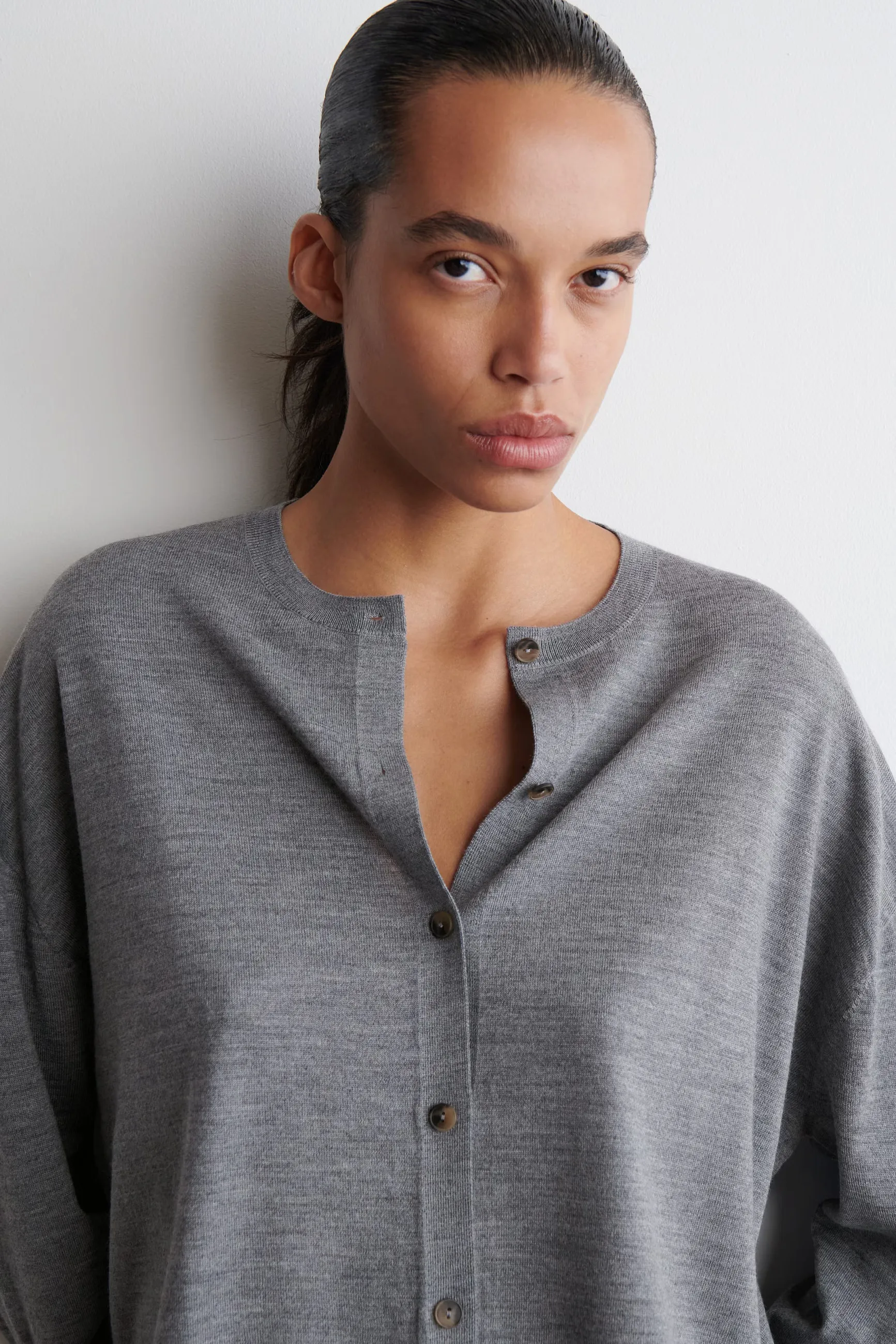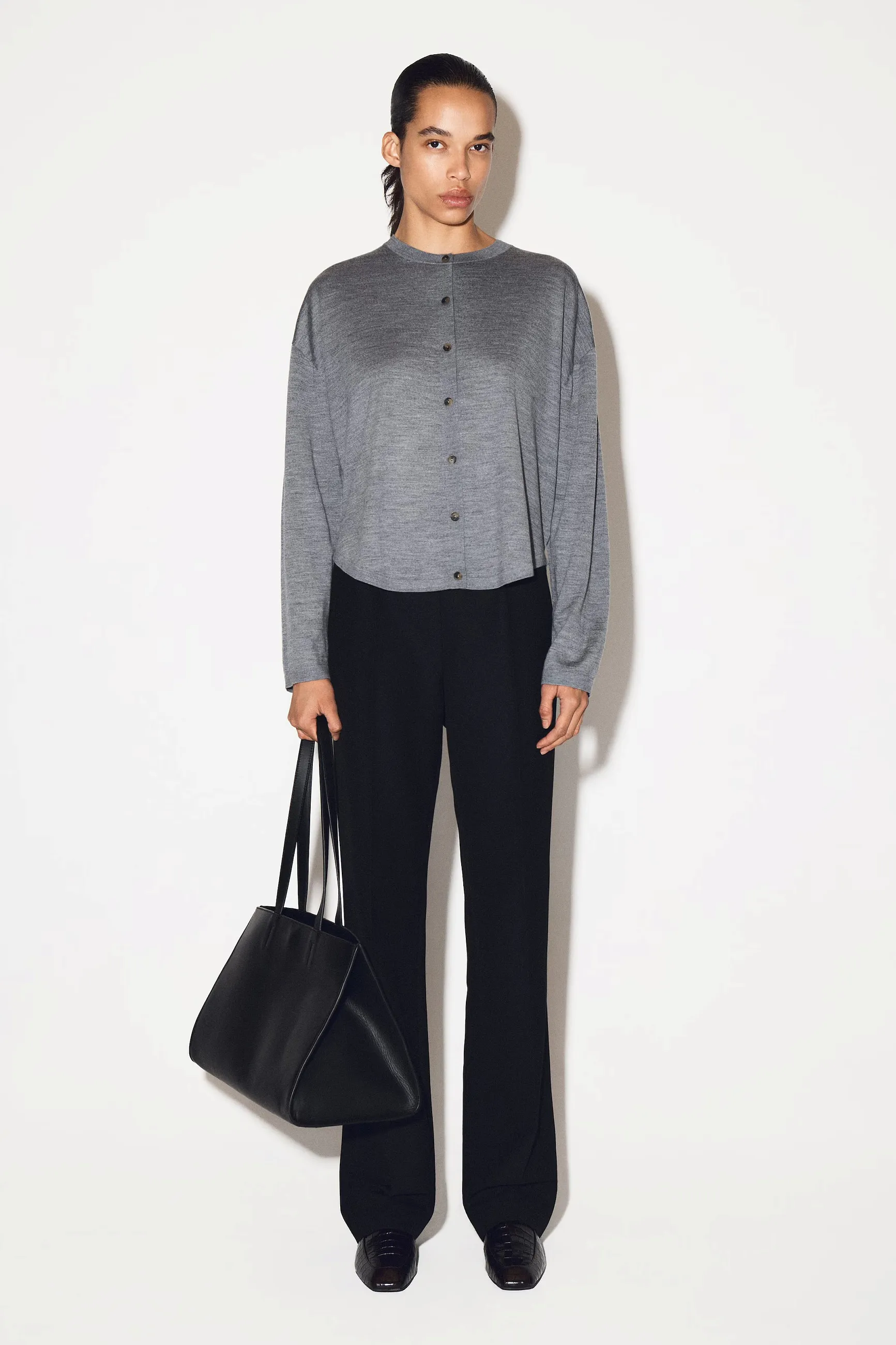 Представляем капсульный гардероб: сезонное обновление классических моделей COS. Сверхтонкая мериносовая пряжа — один из ключевых элементов трикотажной коллекции, выбранная за теплоту и невероятную лёгкость. Этот кардиган, связанный из сертифицированной RWS пряжи, имеет слегка округлый вырез и закруглённый силуэт, подчёркивающий его свободный крой.