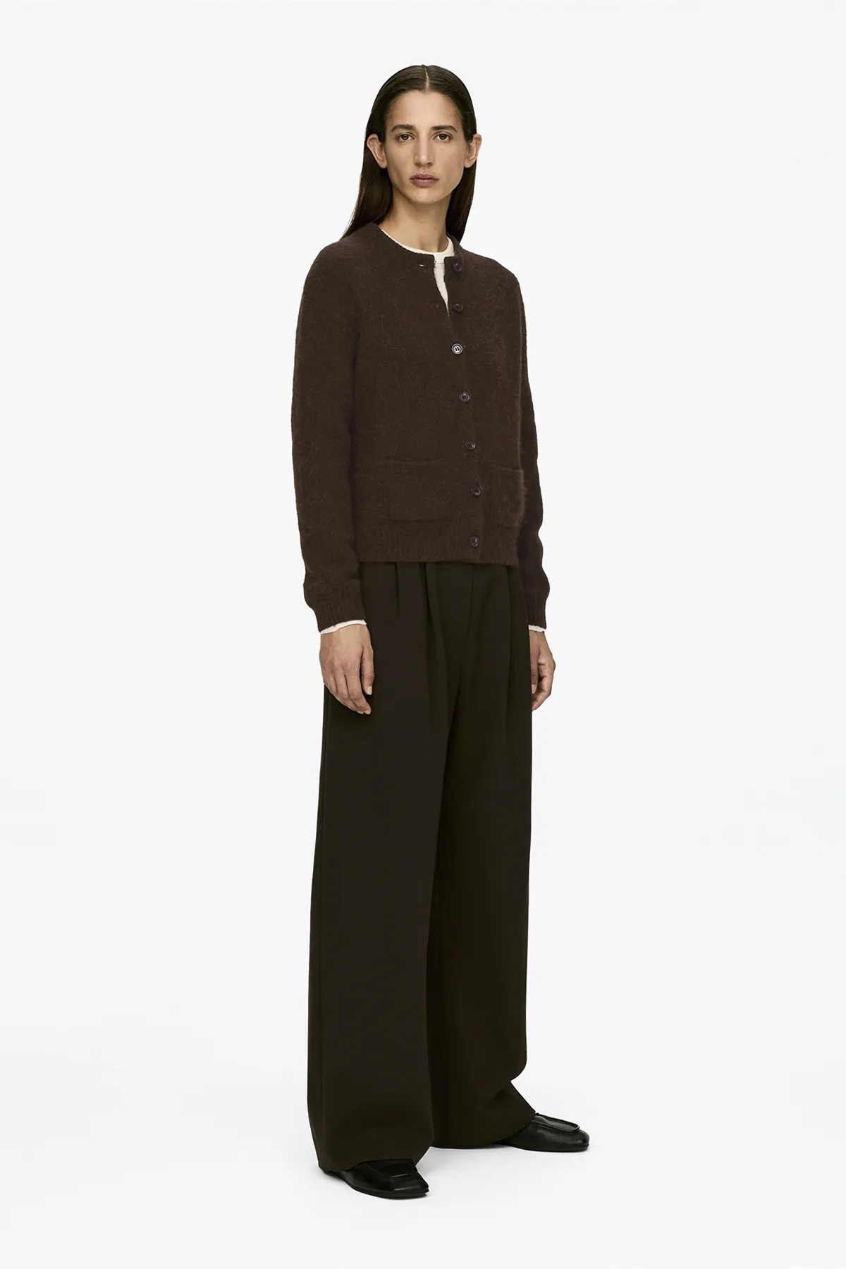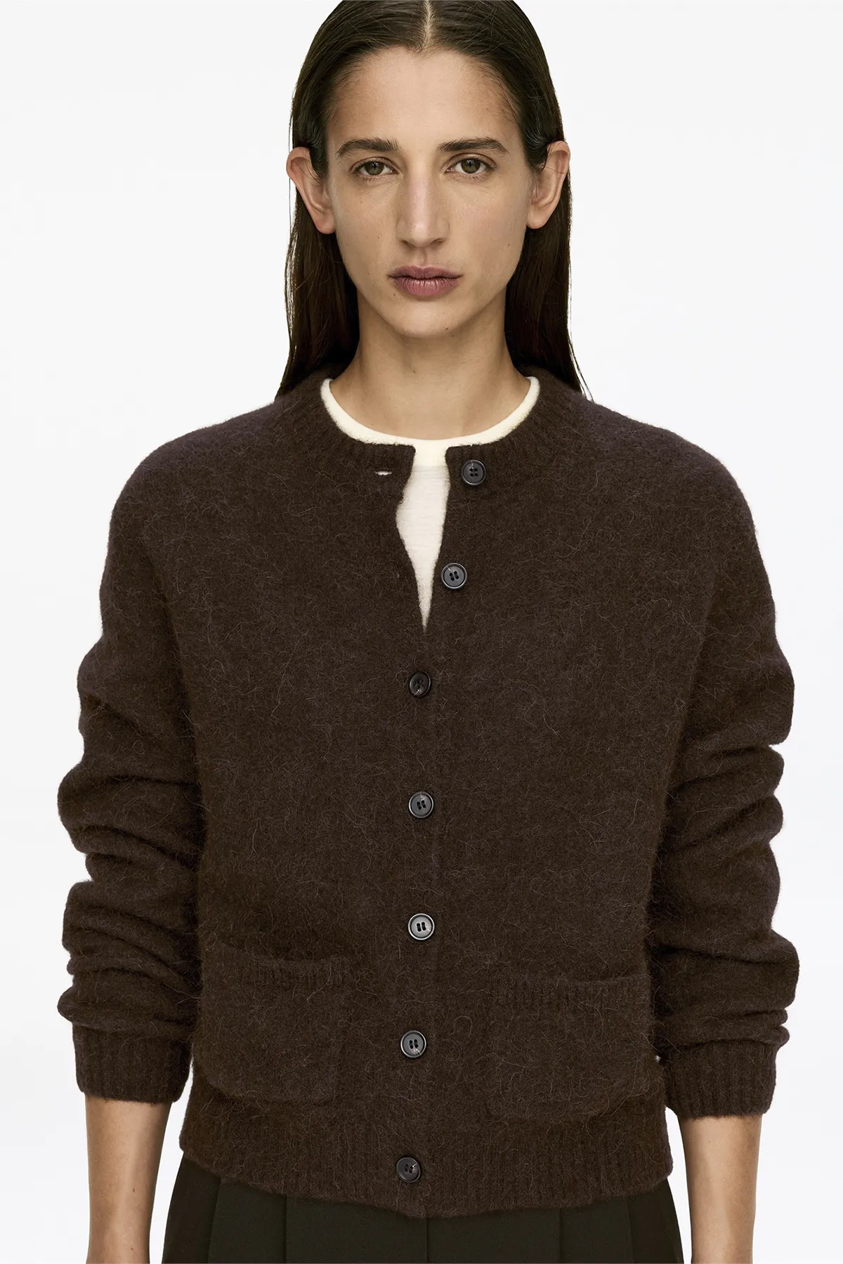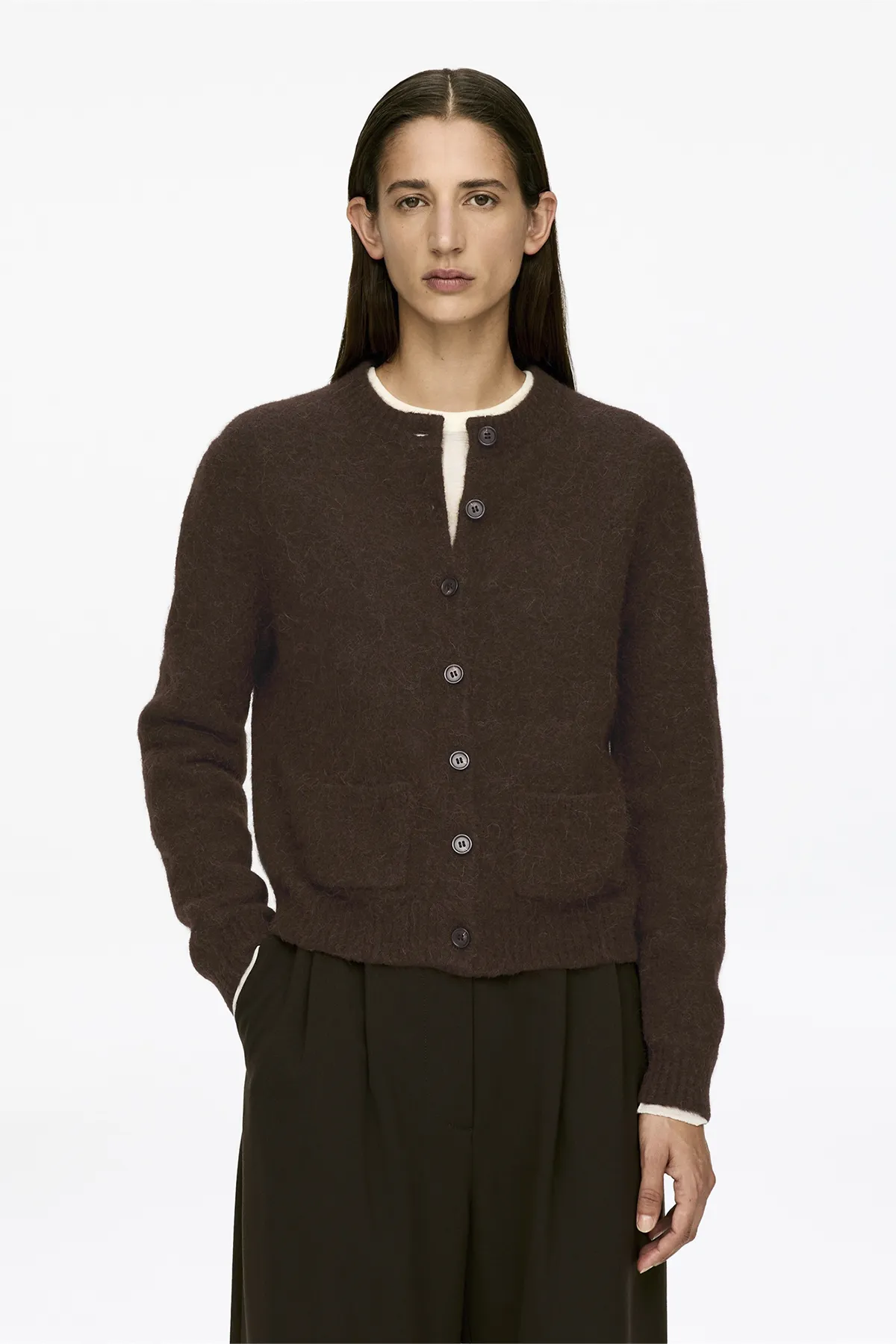 Кардиган прямого кроя из мягкой смеси альпаки и шерсти с застёжкой на пуговицы.