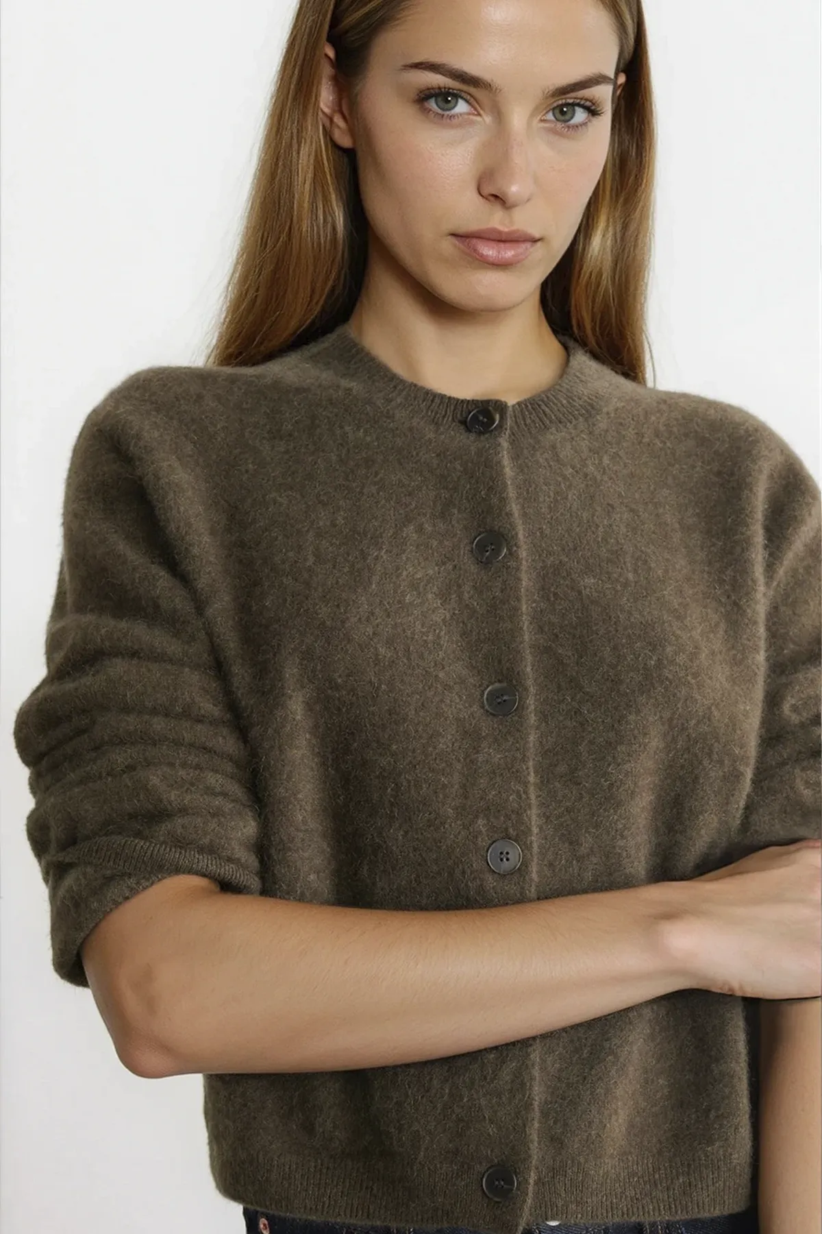 Классический кардиган с круглым вырезом обновлён в коллекции Pre-Fall 2025. Эта модель выполнена из чистого кашемира, сертифицированного GCS, с начёсом для мягкости и гладкости. Цвет хаки позволяет легко сочетать его с другими вещами из вашего гардероба.