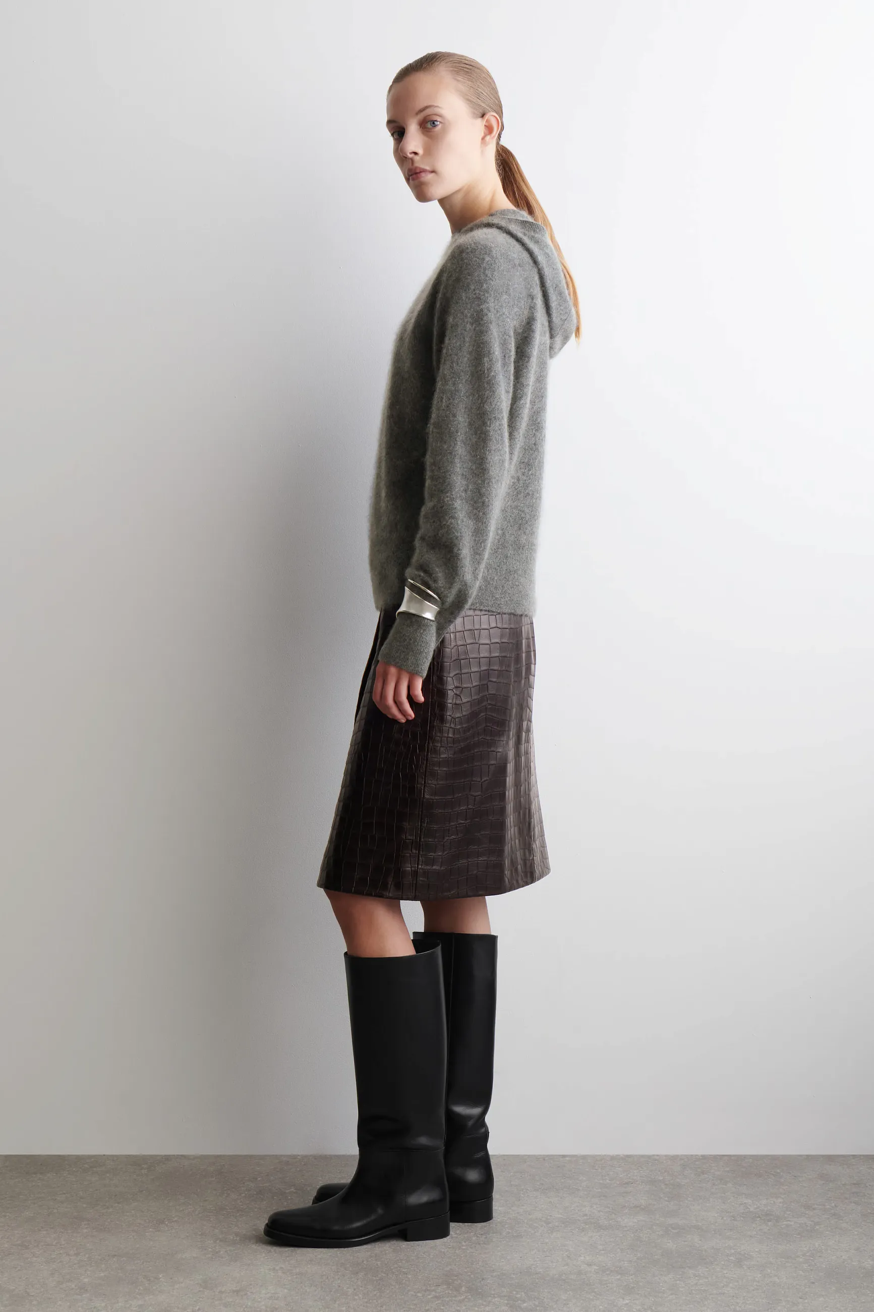 Классическая худи с капюшоном получила текстурное обновление для Pre-Fall 2024. Она связана из чистого кашемира, сертифицированного GCS, который начесывается для мягкости, тактильного ощущения на ощупь, и поставляется в зелено-сером тоне, который будет легко сочетаться с другими предметами вашего гардероба. Ребристая отделка придает тонкую структуру, а приталенные манжеты и обволакивающий капюшон обеспечивают дополнительное тепло.