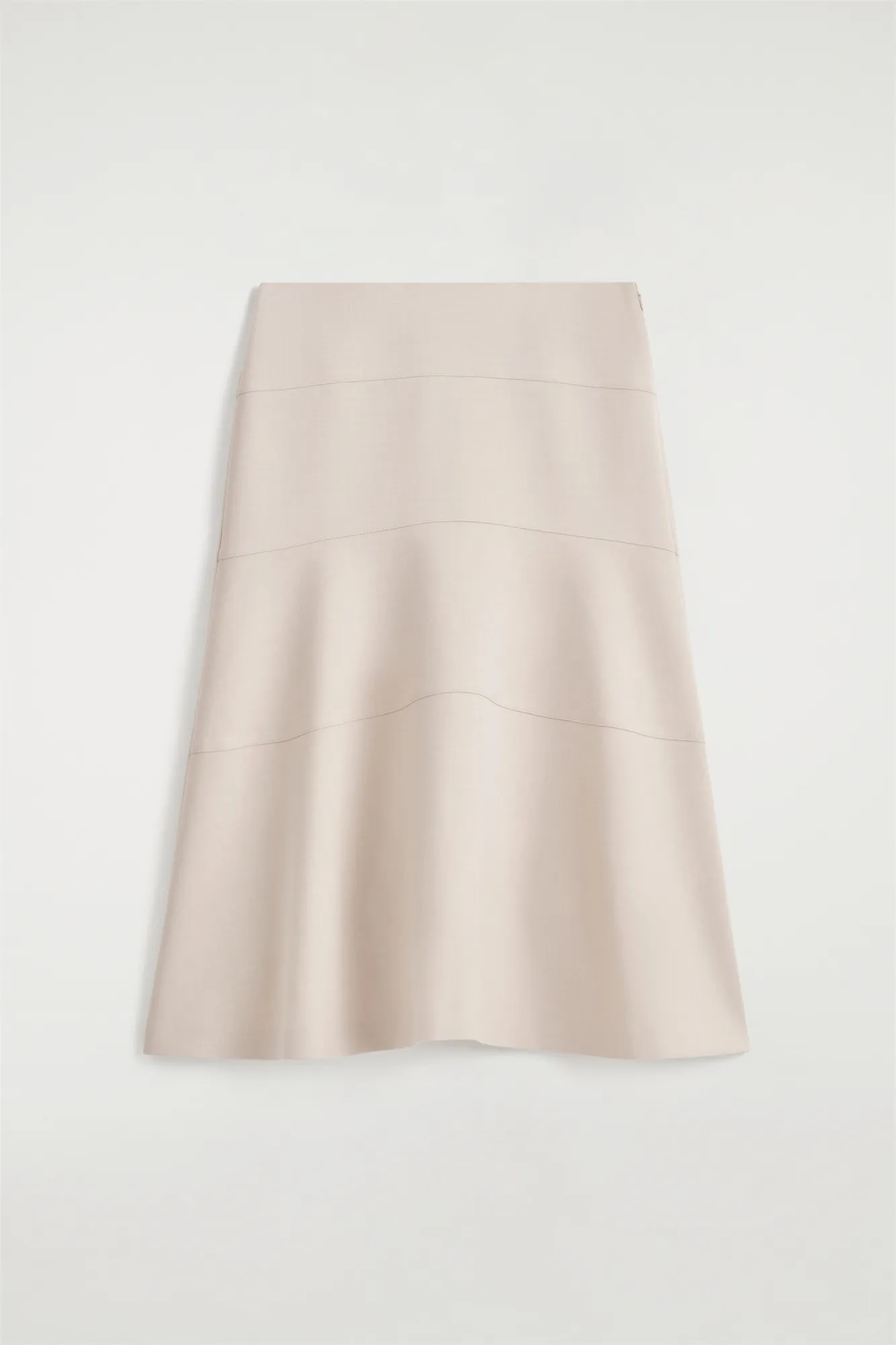 Эта элегантная юбка А-силуэта представлена в бежевом цвете и поэтому легко впишется в осенне-зимний гардероб.