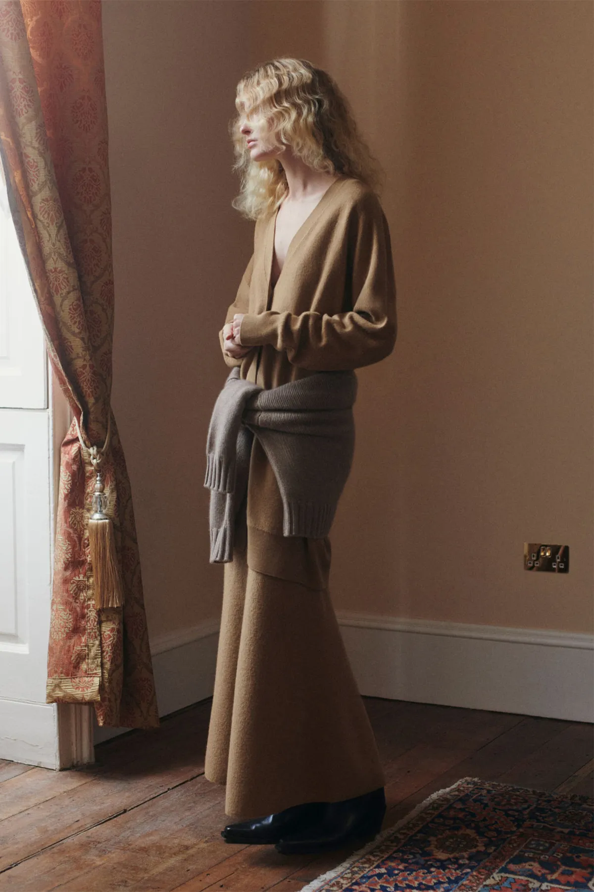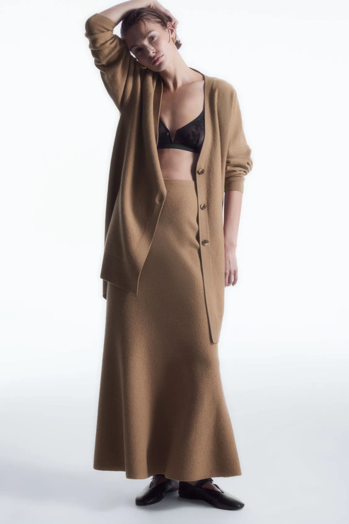 Эта трикотажная юбка длины макси предлагает свежий взгляд на классическую зимнюю базовую модель. Она выполнена из текстурированной шерсти вареного мериноса универсального и особенно мягкого темно-бежевого цвета. У нее расклешенный низ и эластичный пояс, который можно заправить в кардиган в тон