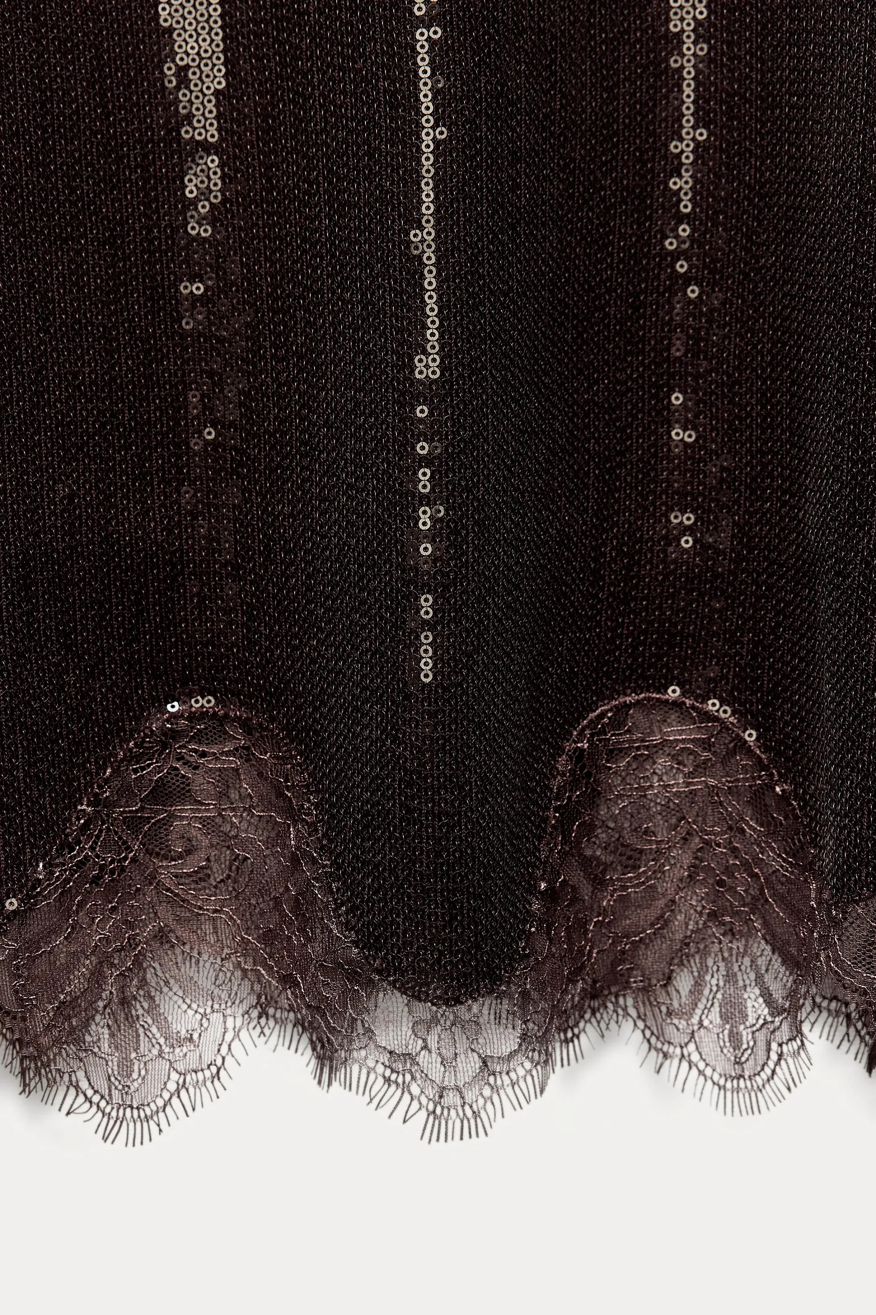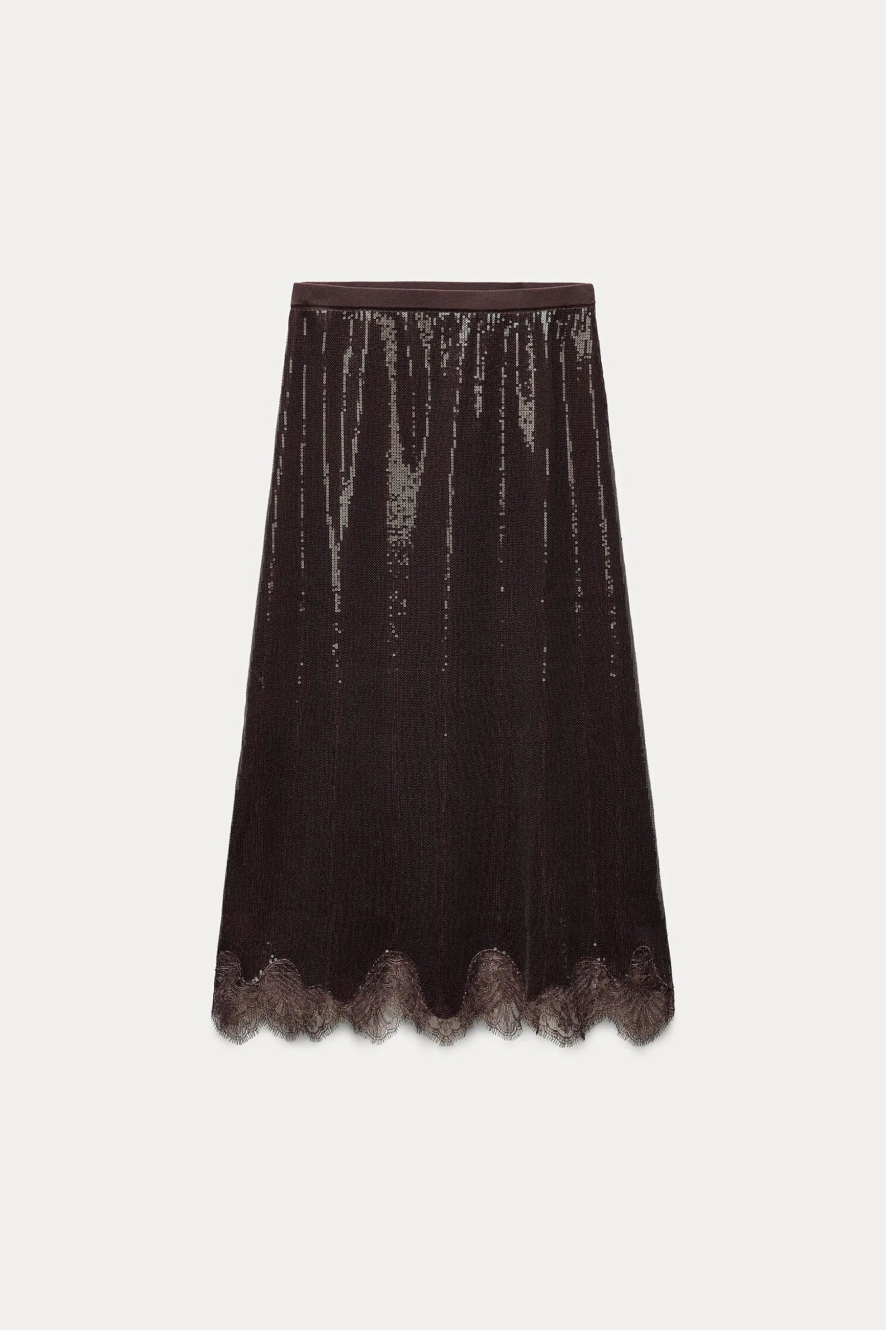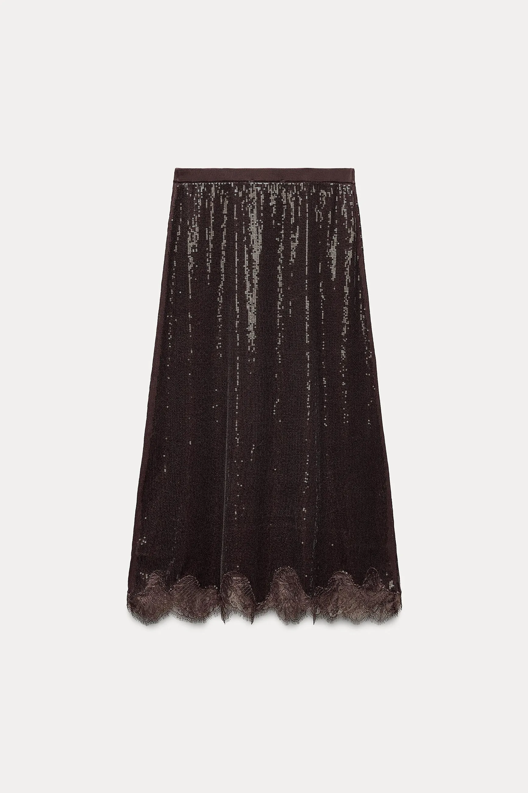 Юбка с завышенной талией и эластичным поясом. Подкладка. Детали с блестками и кружевной отделкой. Собери образ с подходящим верхом.