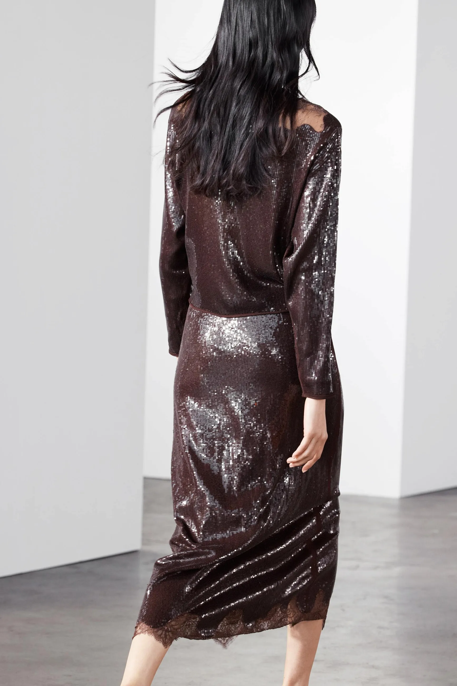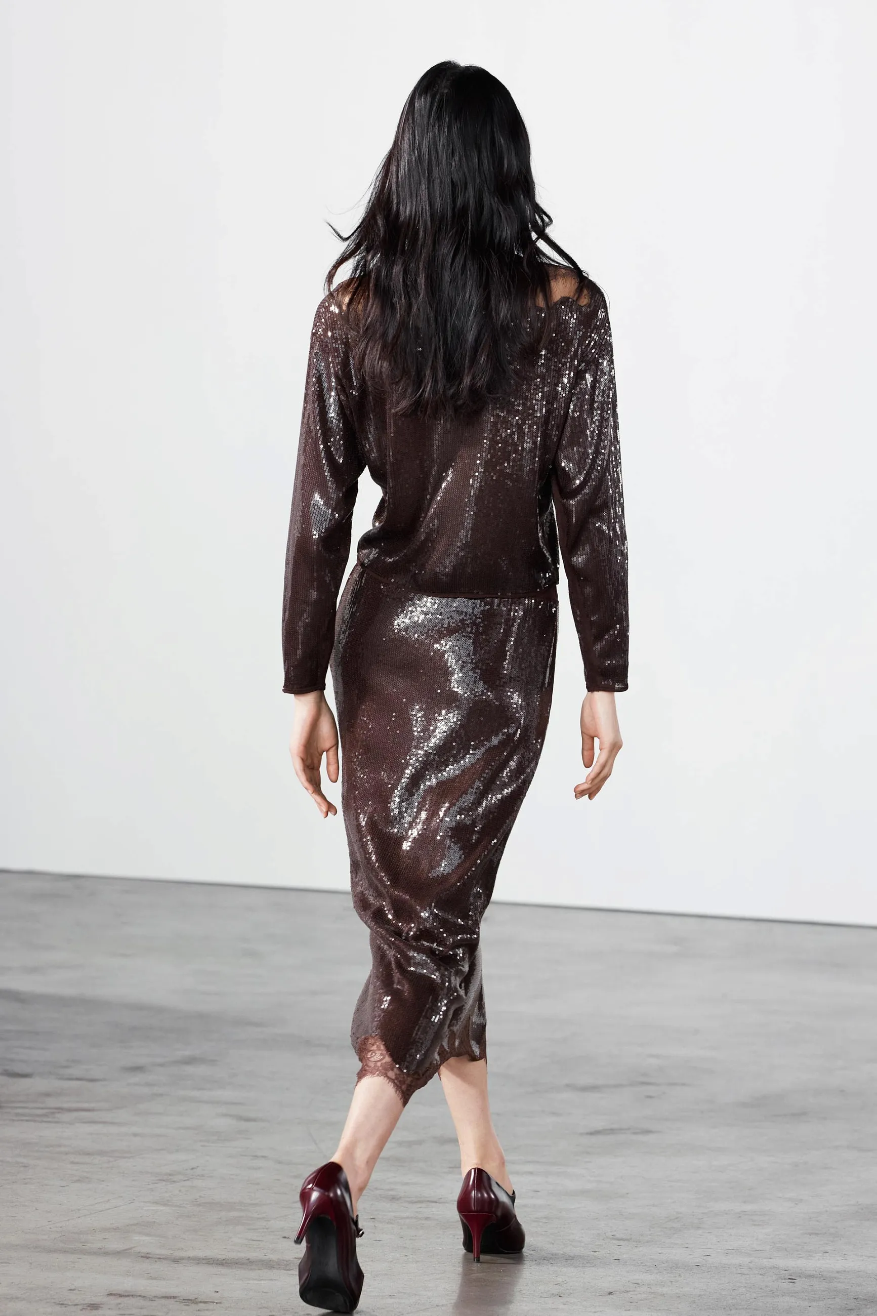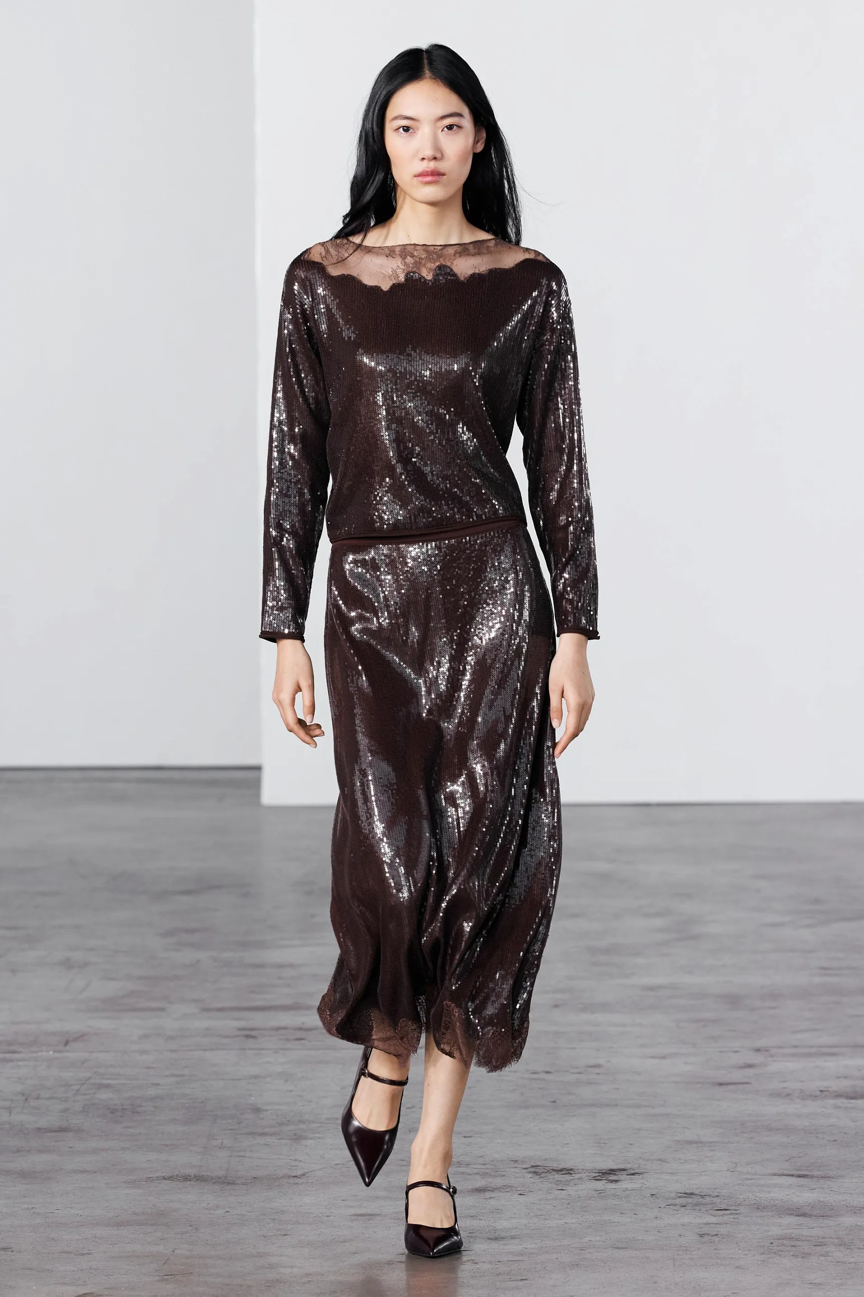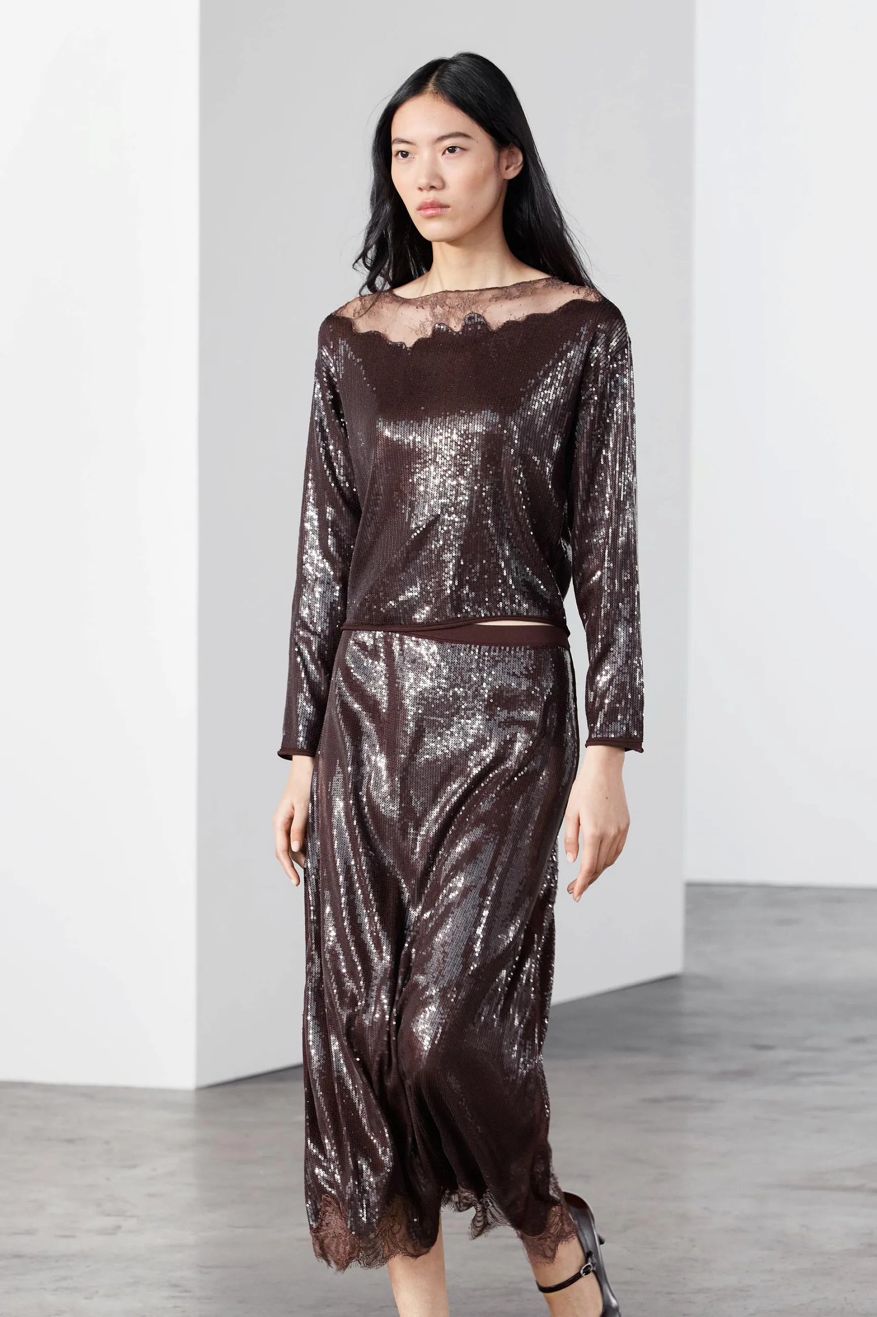 Юбка с завышенной талией и эластичным поясом. Подкладка. Детали с блестками и кружевной отделкой. Собери образ с подходящим верхом.
