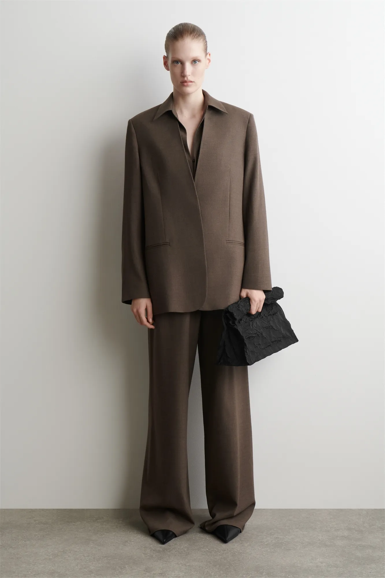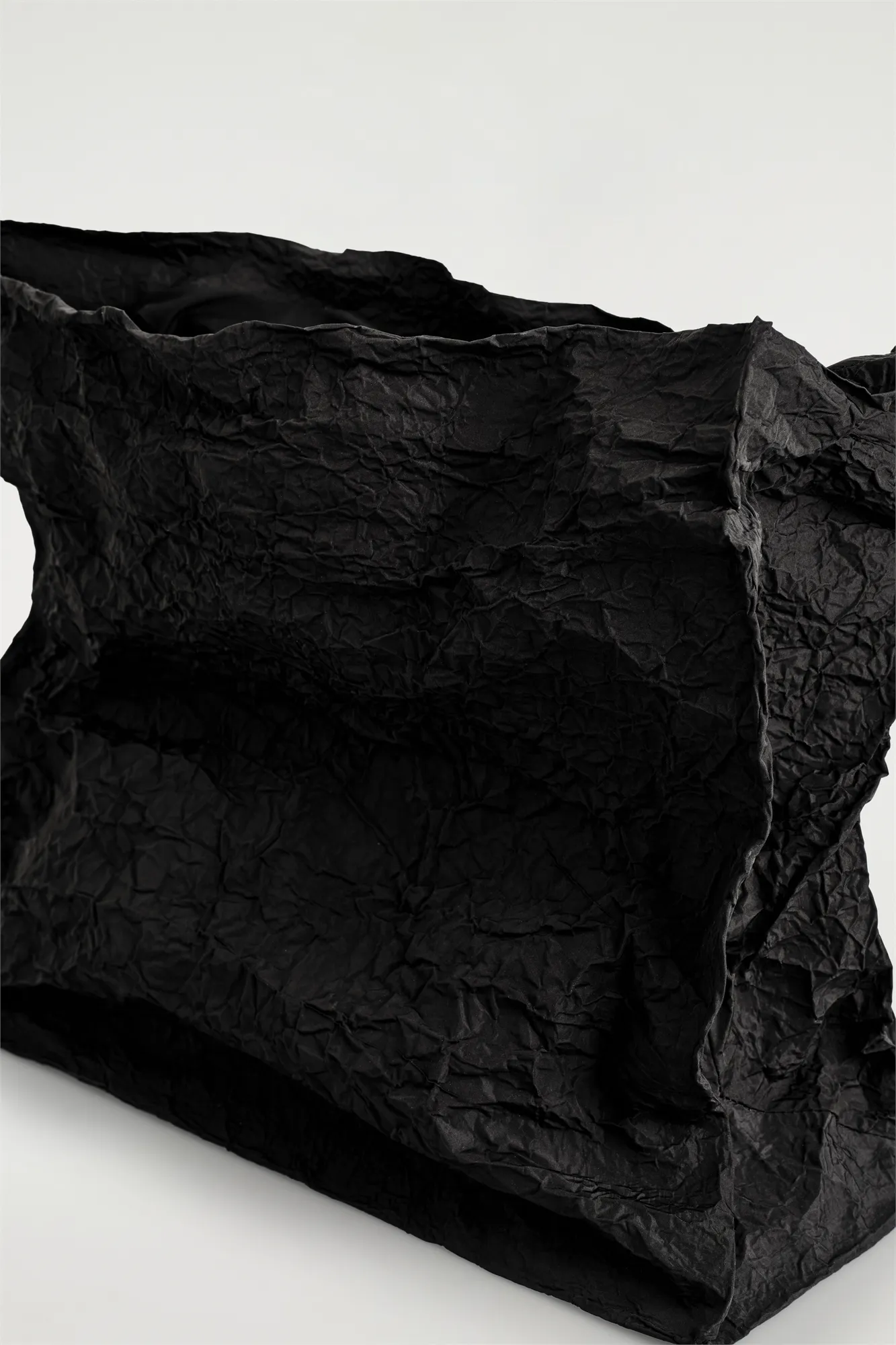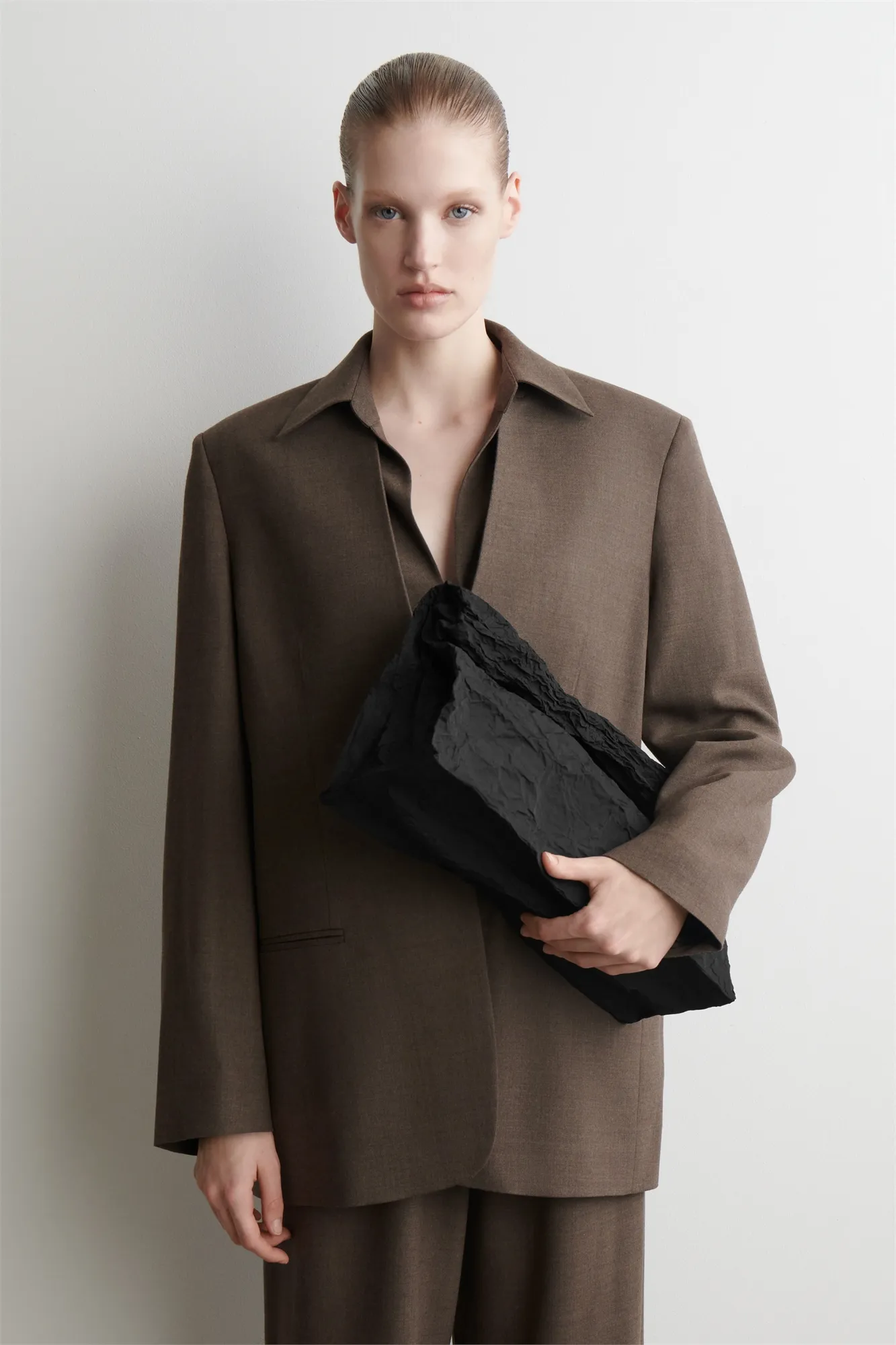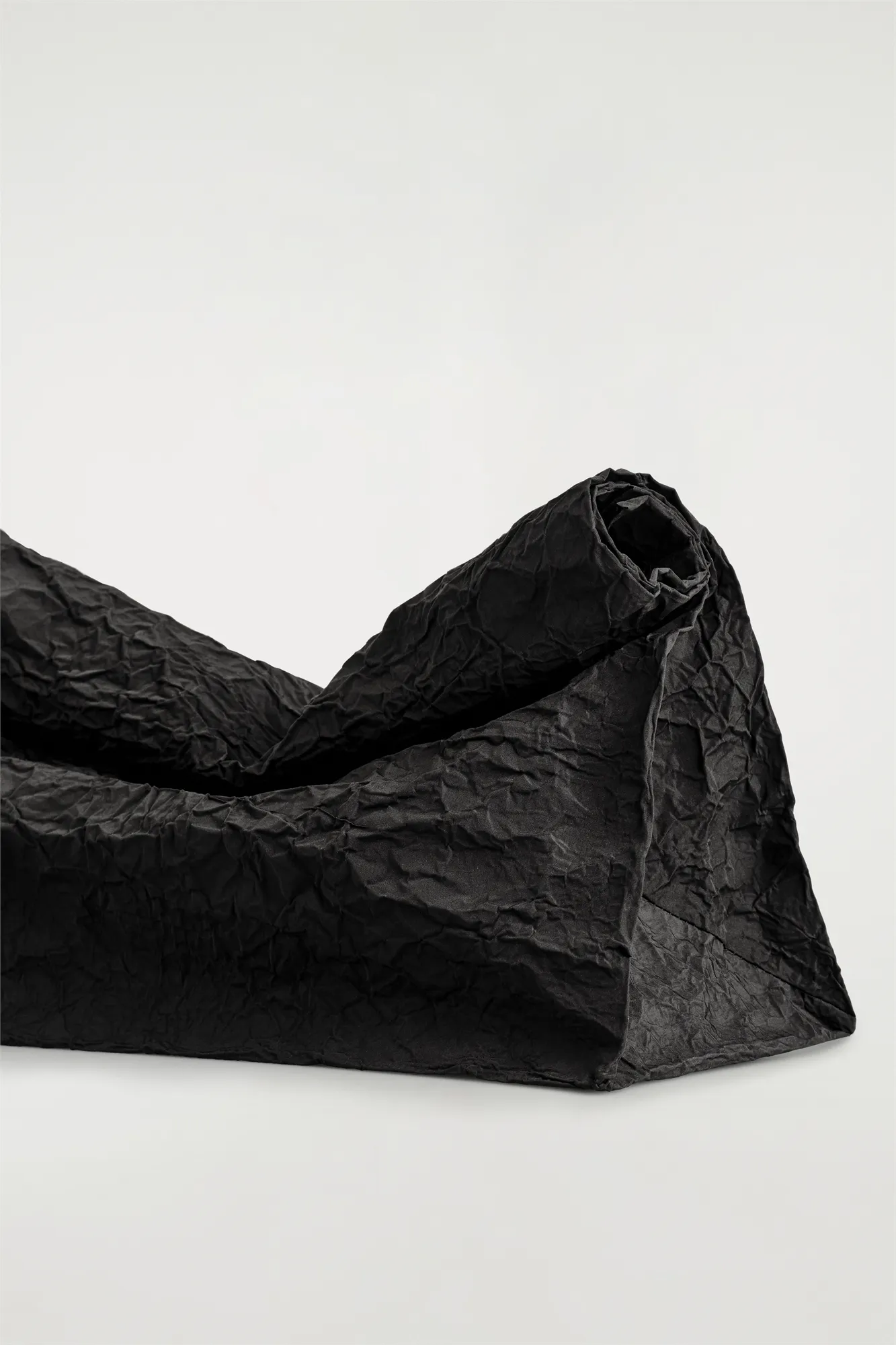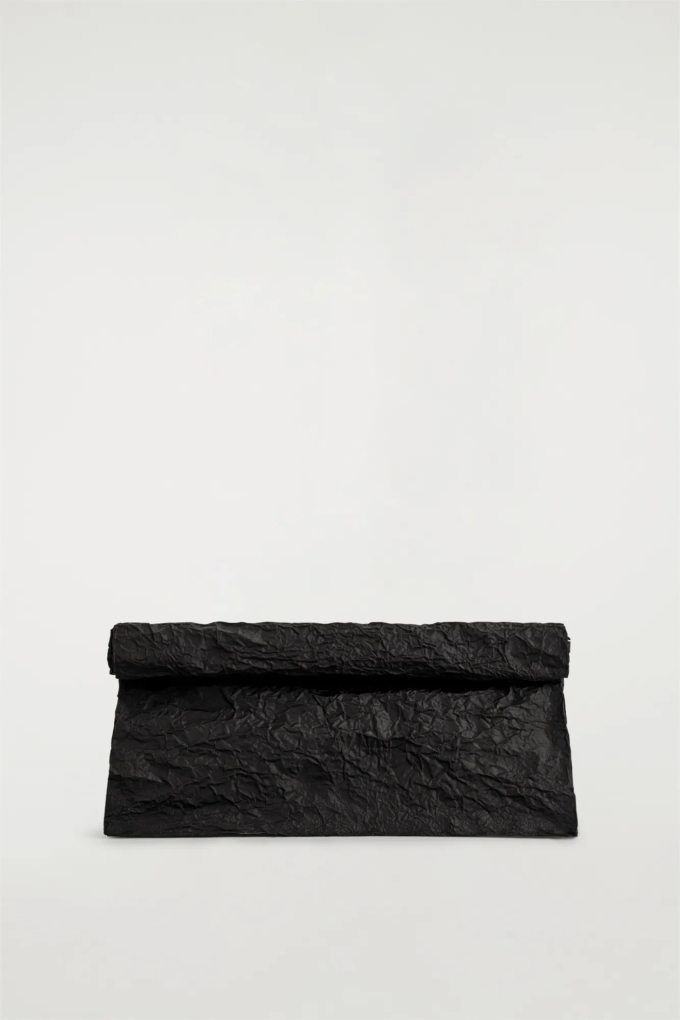Этот современный клатч - изюминка коллекции осень/зима 2025. Черный аксессуар имеет увеличенный силуэт, его можно свернуть, и он изготовлен из фактурной, мятой ткани, которая хорошо держит форму.