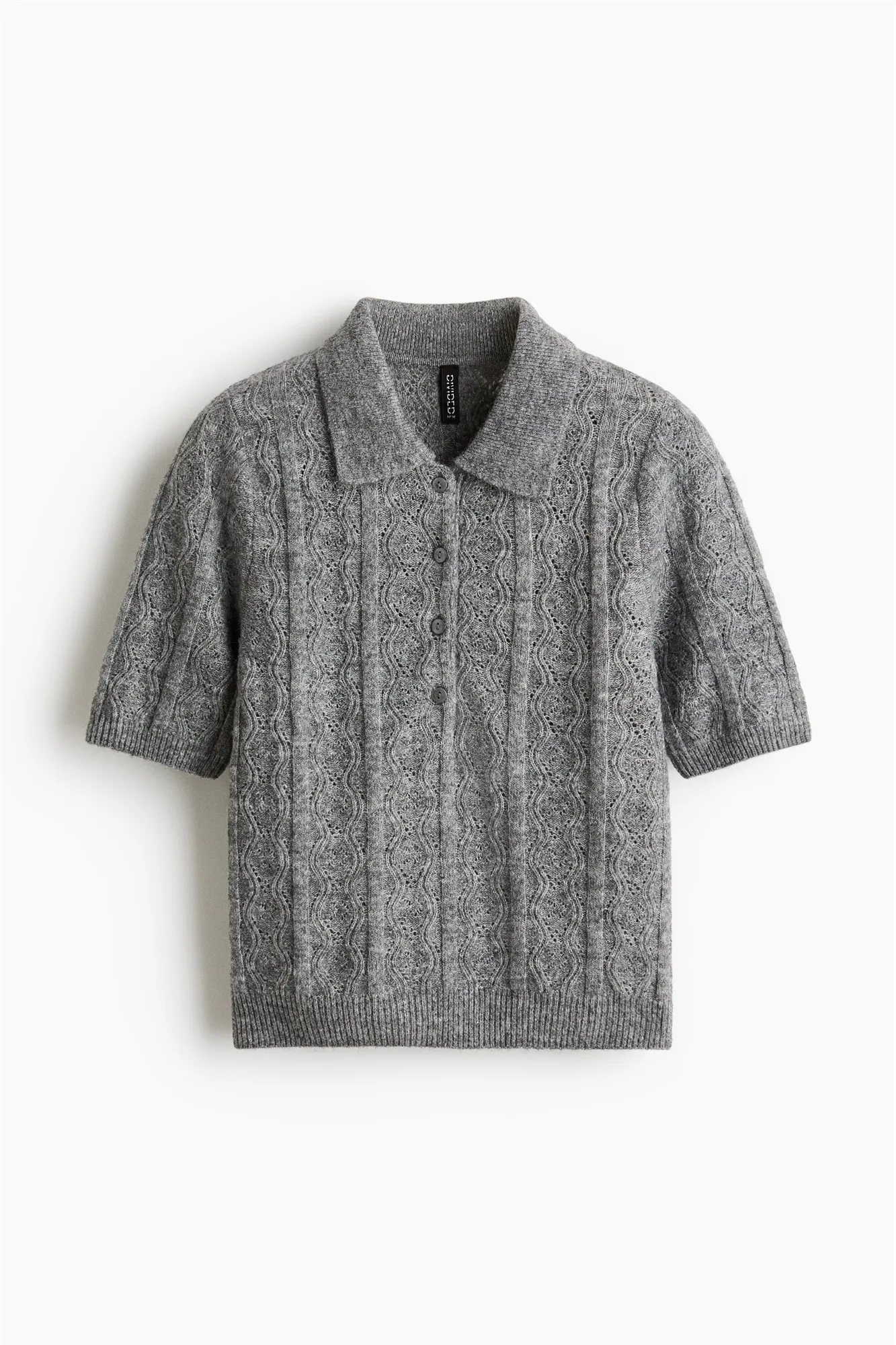 Джемпер-поло с короткими рукавами из мягкой ажурной вязки с воротником, застежкой на пуговицы и ребристыми манжетами на рукавах и подоле.